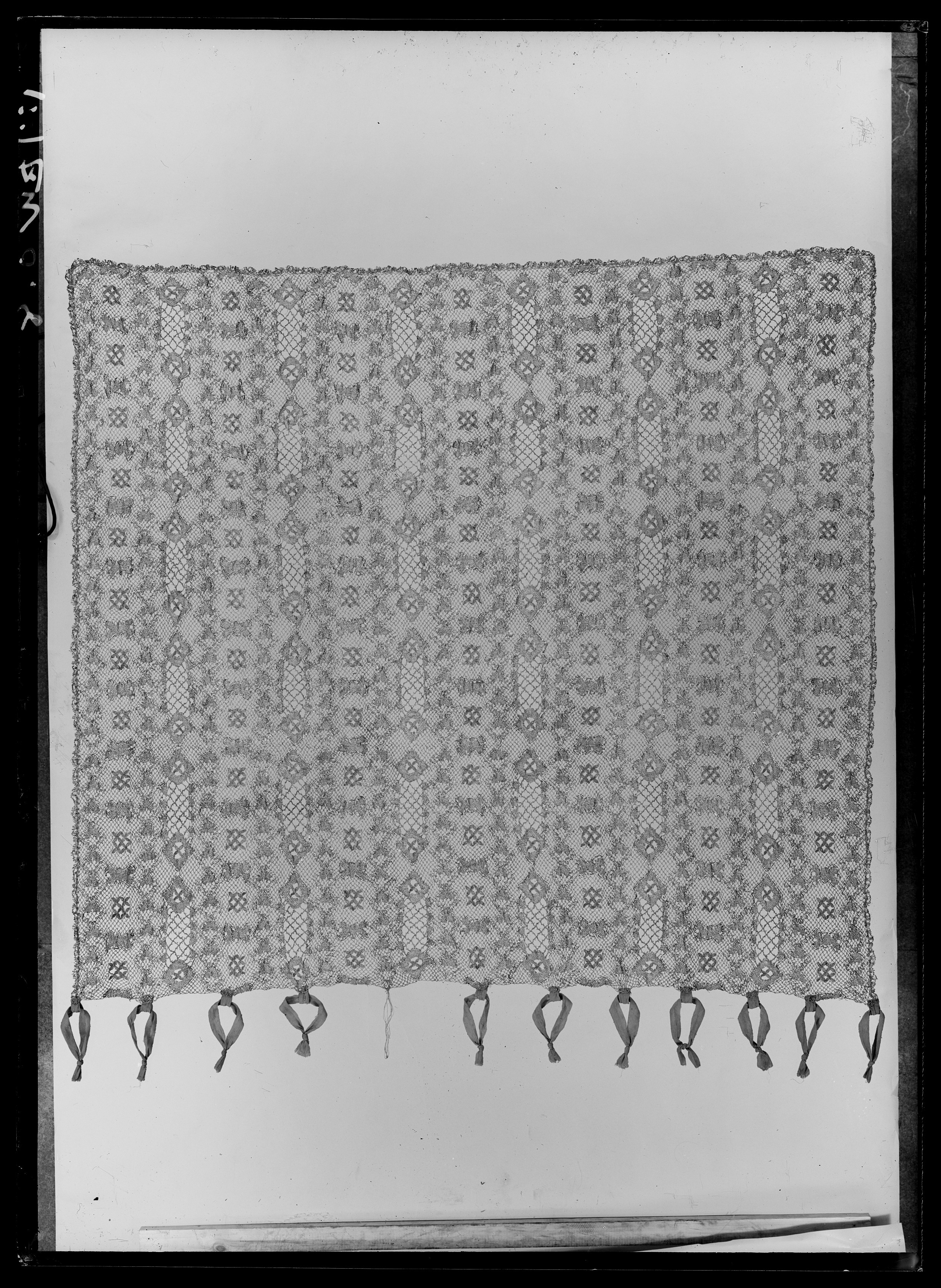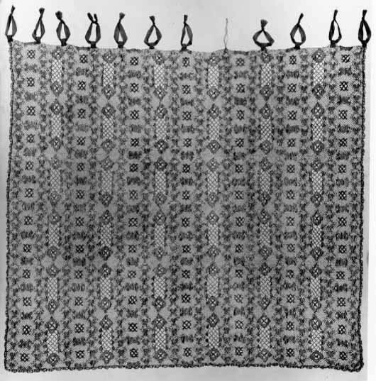 Spetsgardin av guldtråd, knypplad med mönsterrapporter (H: mm, B: mm). Upptill st gula sidenband i öglor.
