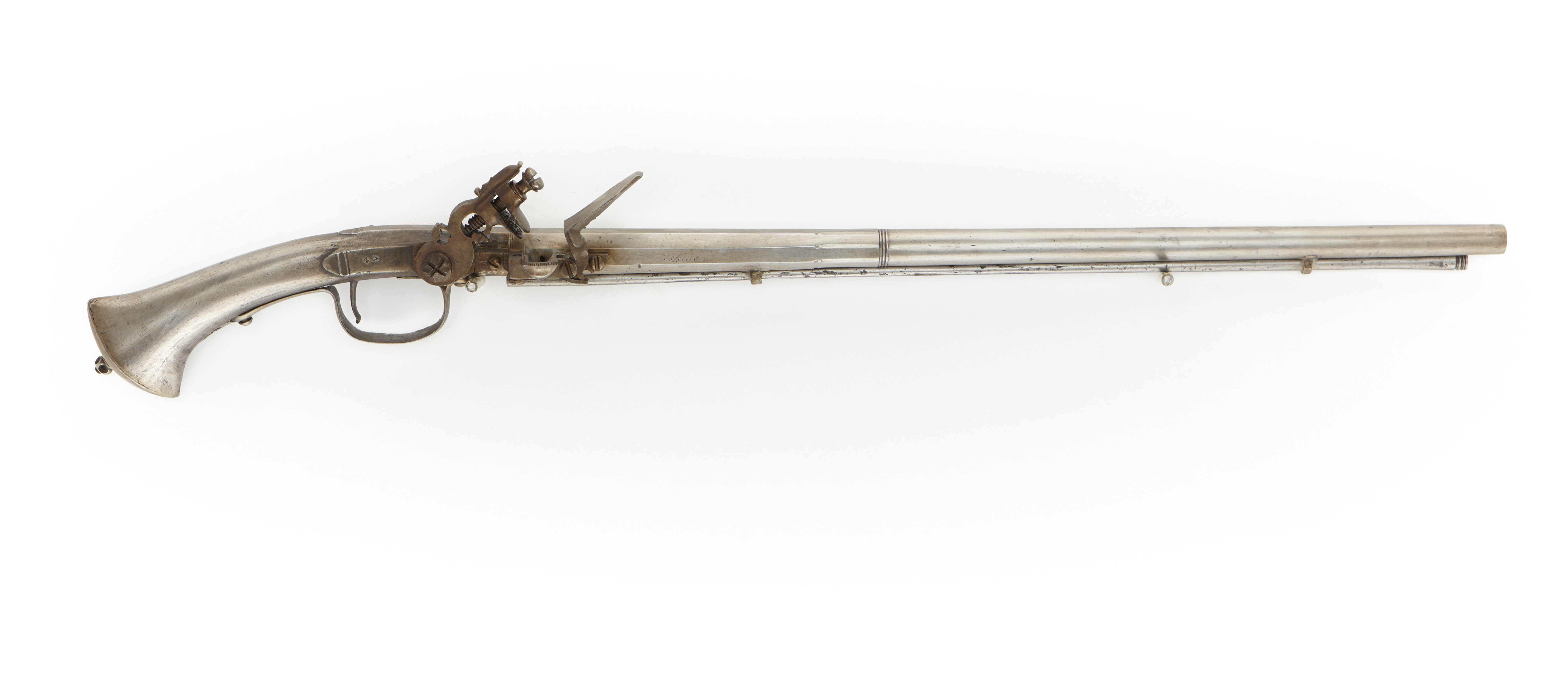 Rund, över kammaren åttkantig, slätborrad pipa. Pipan direkt hopskruvad med kolven. Två rörkor på pipans undersida. Flintlås. Hane, samt fängpanna med batteri, fastskruvade vid kolv, resp. pipa. På kolvens vänstra sida finns nöt och avtryckare, slagfjädern är fastskruvad vid pipan. Kolv av stål. Spetsovalt tvärsnitt, genombruten kolvknapp. Varbygel av fransk typ, framtill kluven. Tillbehör: Laddstock av stål, framtill något profilerad. Märkt: 47, bakom hanen, stanstyp 5376.