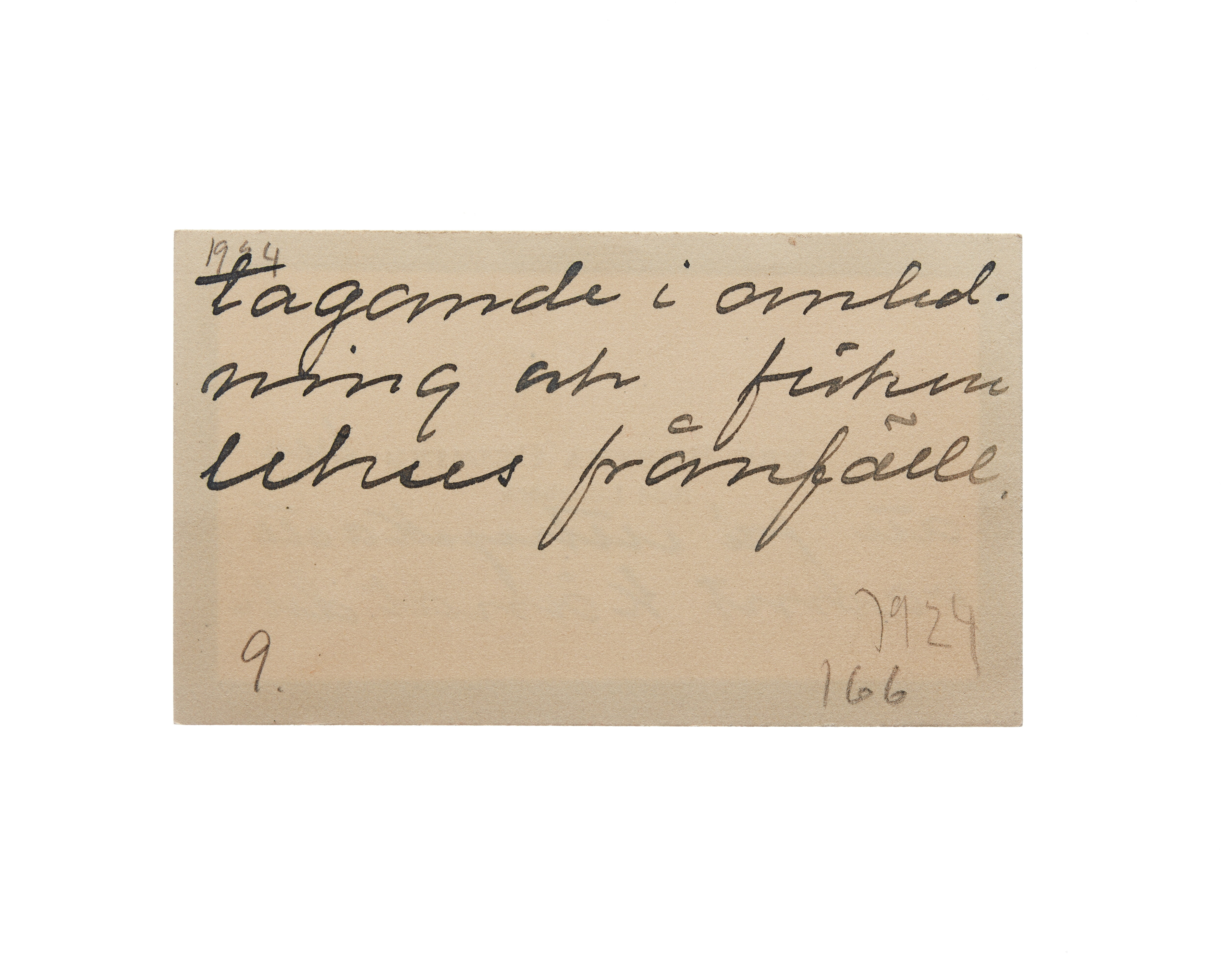 Tio visitkort från Fru Bertha Celsing f. Lilliehöök. Första kortet daterat 1919, vikt i övre vänstra hörnet. Andra kortet daterat 1921, handskrift "......". Tredje kortet daterat 1922, vikt i nedre högra hörnet. Fjärde kortet daterat 1922, vikt i nedre vänstra hörnet. Femte kortet daterat 1923, vikt i övre vänstra hörnet. Sjätte kortet daterat 1923, vikt i övre vänstra hörnet. Sjunde kortet är utan datum, vikt i övre vänstra hörnet. Åttonde kortet är utan datum, vikt i övre vänstra hörnet. Nionde kortet daterat 1924 samt sorgkant, handskrift "....." Tionde kortet daterat 1925, handskrift "......"