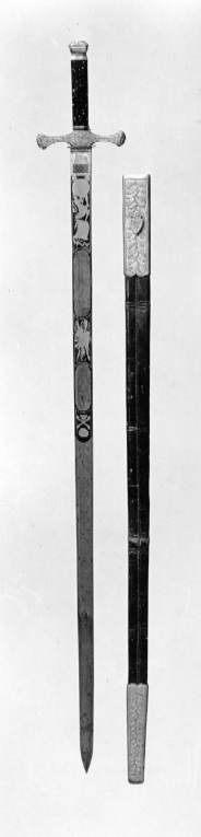 Balja av svart läder med två förgyllda reliefornerade beslag. Munbleck med släta kanter på ut- och insidan en graverad gles eklövsranka mot finpunsad botten. Koppelhake sköldformig med palmettornament. Doppsko höjd 135 mm ornerad med graverad eklövsranka.