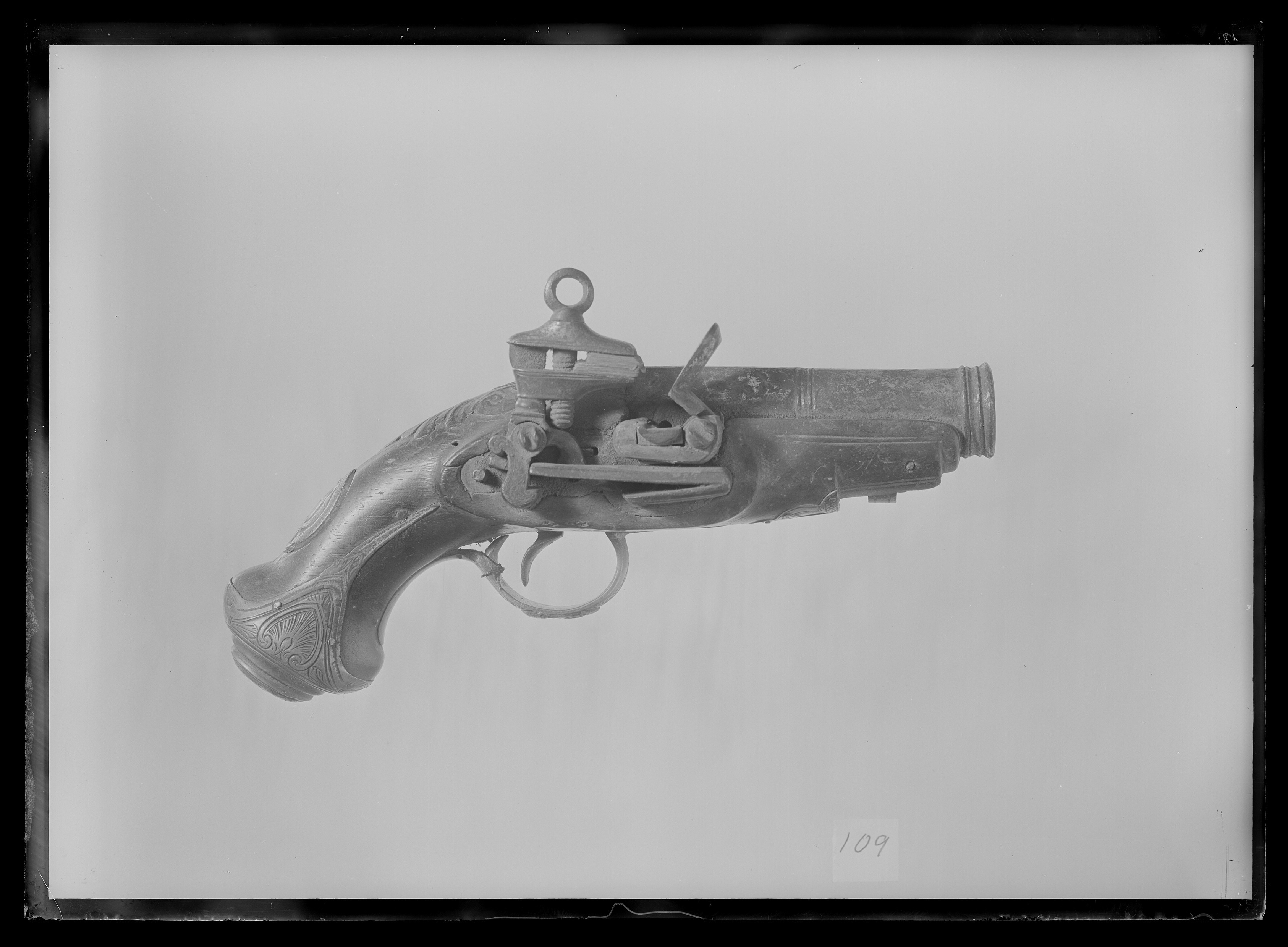Kort, grovkalibrig pipa med åttsidig kammare och sextonsidig främre del, två ringar vid övergången. Mynningen profilerad med tre mindre och ytterst en större ring. Loppen något oregelbundet. På kammaren inlagt bladrankor av silver. Svansskruvblad med spetsig ände, enkel bladdekor. Snapplås, katalanalås med plant låsbleck, hane med lös överkäke, käkskruv med ringformigt huvud, kraftig hanfjäder med kort nedre arm, studel med graverad dekor. Liten fängpanna, brett batteri med rundad överkant, fasade kanter. Batterifjäder dold bakom skärm under fängpannan. Fästning: Två låsskruvar. Kort, bred, c-formig avtryckare. Konturerat avtryckarbleck. Helstock av valnöt, snidat blad vid svansskruven, dubbla kantlinjer längs pipa och laddstocksränna. Beslag av mässing. Kolvkappa med långa flikar, graverad dekor med bl. a. en palmett på vardera sidan. oval, profilerad centrumplatta med täckt av silverplatta med en antikiserande krigarbyst(?). Spetsoval tumplåt av silver(?) med oval kartusch. Helt sidbleck med palmettliknande dekor, mellan skruvarna oval silverplatta med samma krigarbyst. En liten rörka med streckdekor. Över laddstocksrännans bakände en genombruten platta med bladdekor. Varbygel med lång, slät bakre arm, främre arm med bladdekor, på bygeln silverplattan med krigaren.