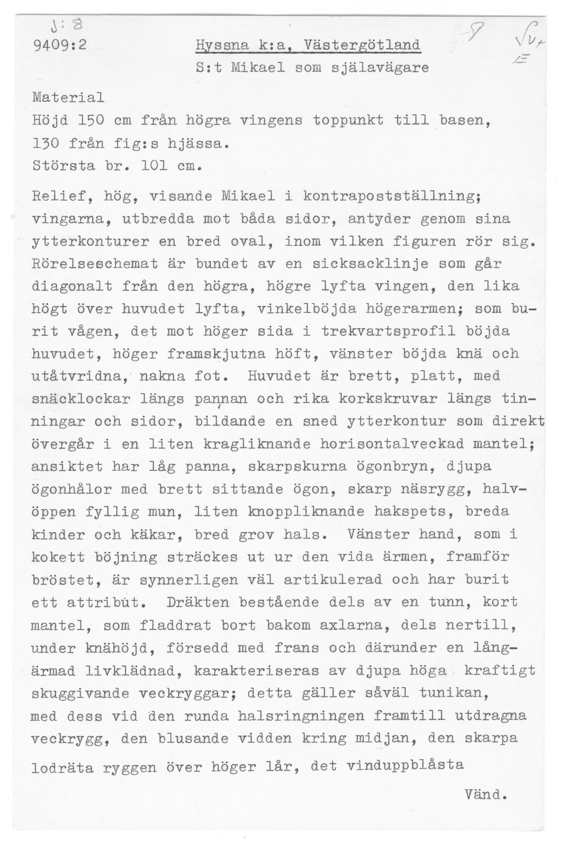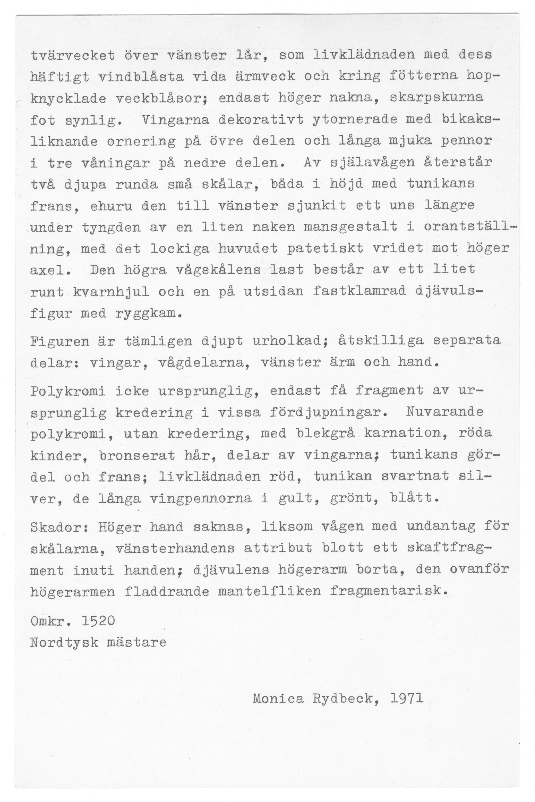 Kondition: god, höger hand bortbruten, vågen fragmentarisk. Färg: sekundär polykromi.
