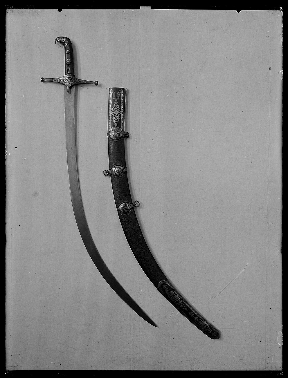 Fäste med framåtböjd kappa med åttkantigt, nedtill flikigt beslag av svärtat stål ornerat med rankor och blad i påslaget guld. På fram- och baksidan skena av samma material med guldranka. Raka parerstänger med knoppar i ändarna, i ett med styrskenor av svärtat stål med rankor och rosett av påslaget guld. Kaveln klädd med svart chagrin med tre runda knappar av svärtat stål med rosetter av påslaget guld på var sida ytterst på kappan en ring med portepé. Damaskerad kraftigt böjd eneggad klinga av stål, 32 mm bred. Tillbehör: Portepé av guld och svart silke.