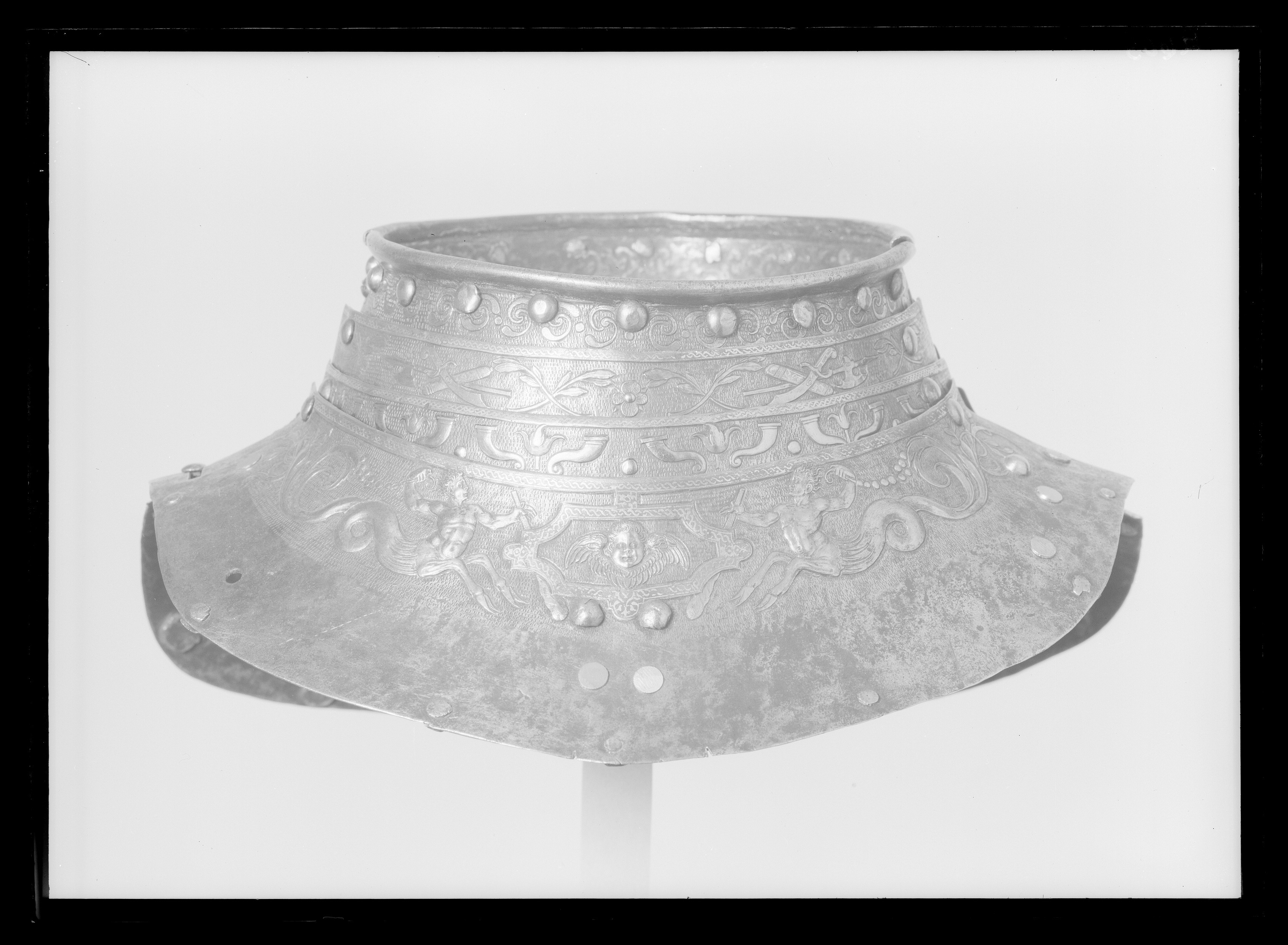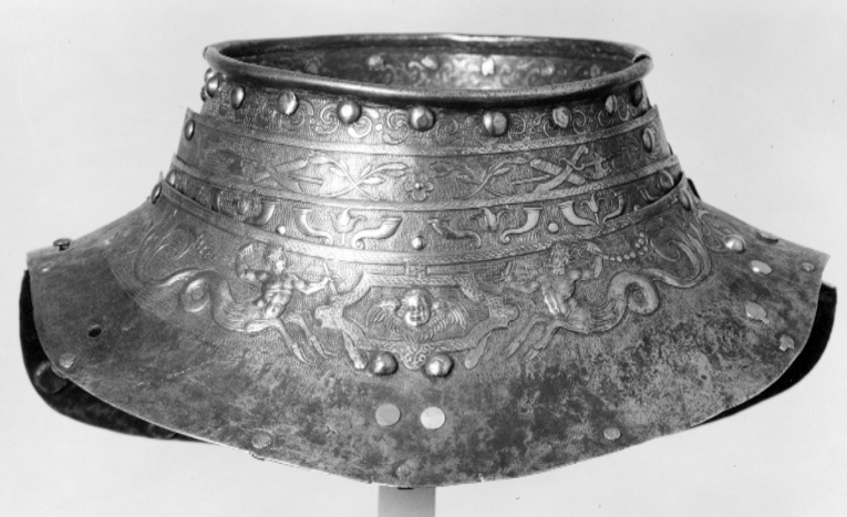 Halskrage av driven och punsad stålplåt tillhörig Erik XIV:s paradrustning,