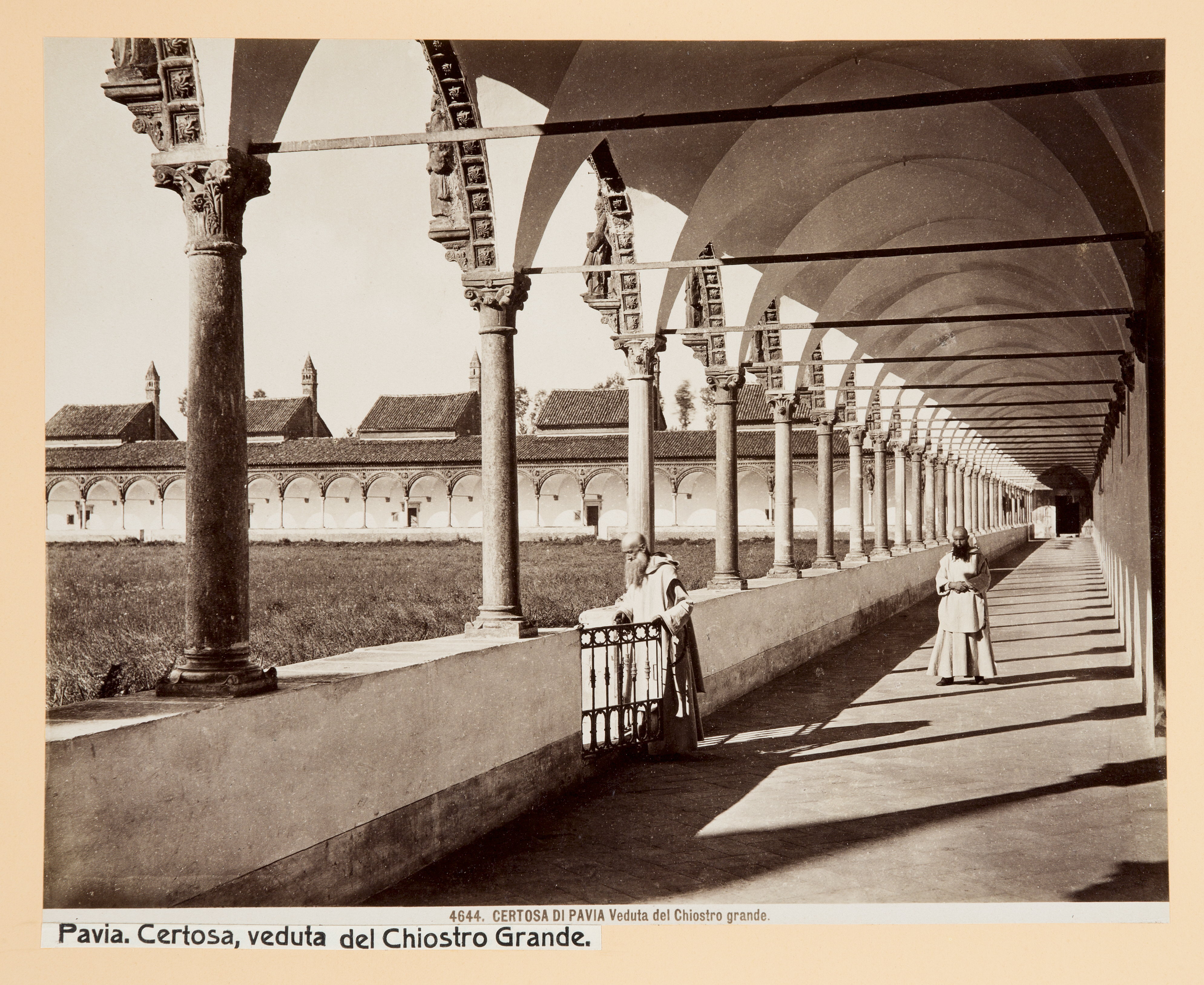 Certosa di Pavia, Pavias kartusiankloster. Vy över det stora klostret. Foto från resa genom norra Italien och Rivieran samt åter över Schweiz, 22 september - 14 december 1890. Fotografierna LXVI:G.01.-07. är inköpta i Pavia och Hyères av Wilhelmina von Hallwyl, f. Kempe. Med på resan var maken Walther von Hallwyl, modern Johanna Kempe, f. Wallis, dottern Irma samt fröknarna Caroline Pflaum och Ida Uhse. Uppgifterna kommer från fröken Ida Uhses reseanteckningar.