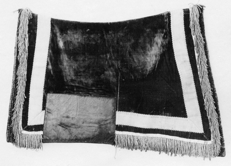 Schabrak av mörkröd sammet. Raka hörn. Benfoder av mörkröd saffian, 270 x 190 mm. 80 mm innanför kanten börjar en 52 mm bred guldgalon med uddkanter. 55 mm innanför kanten börjar en 70 mm bred gyllene frans med buljoner och virkade snoddar. Ljusbrunt linnefoder.