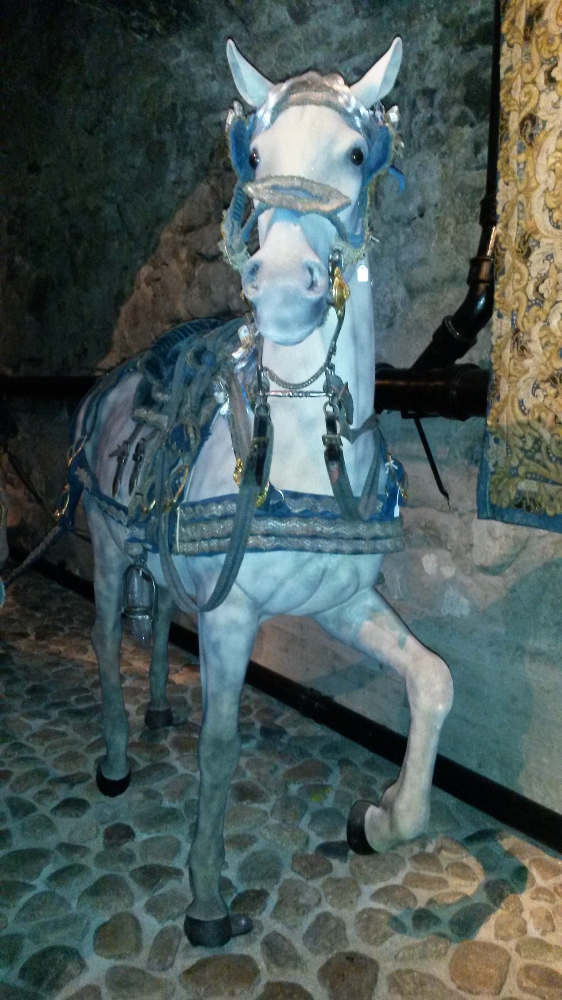 Huvudlag, tillhörande seldon ("nr 8", gnr 30:115:8) ur en serie av åtta, varav denna med spannryttarsadel (nnr 29661). Remmarnas stommar av läder överklädda med blå sammet på framsidan kantade med en 7 mm bred guldfrans och i mitten en 20 mm bred silvergalon. På huvudet en 400 mm lång och 70 mm bred rem som förgrenar sig i två, en främre och en bakre, 35 mm breda, på höger och på vänster sida. Mellan de främre remmarna ett tvärgående pannband. Vid pannbandet på höger sida fäst en läderplatta i ett blått linneband på vilken rosetten har suttit. 250 mm från mittpunkten på huvudet avslutas de 4 remmarna. De främre remmarna och den högre bakre är fästa i de övre mässingsspännena. Mässingsspännena 90 mm långa och 60 mm breda. En fortsättning på de främre remmarna med ett par 500 mm långa och avslutas i de nedre spännena som fäste för betslet. Den bakre högra remmen 570 mm lång och avslutas med ett spänne. Utgår från det övre bakre spännet att fästas i jämnhöjd med det vänstra främre spännet. Anmärkning: Skygglappar och 150 mm på vänstra främre remmen saknas. Pannbandet sitter fast endast i vänster främre rem. Hela huvudlaget har en sned vridning. Sammeten och silvergaloner lösa. Konserverad. (Beskrivning avser föremålet innan konserving).