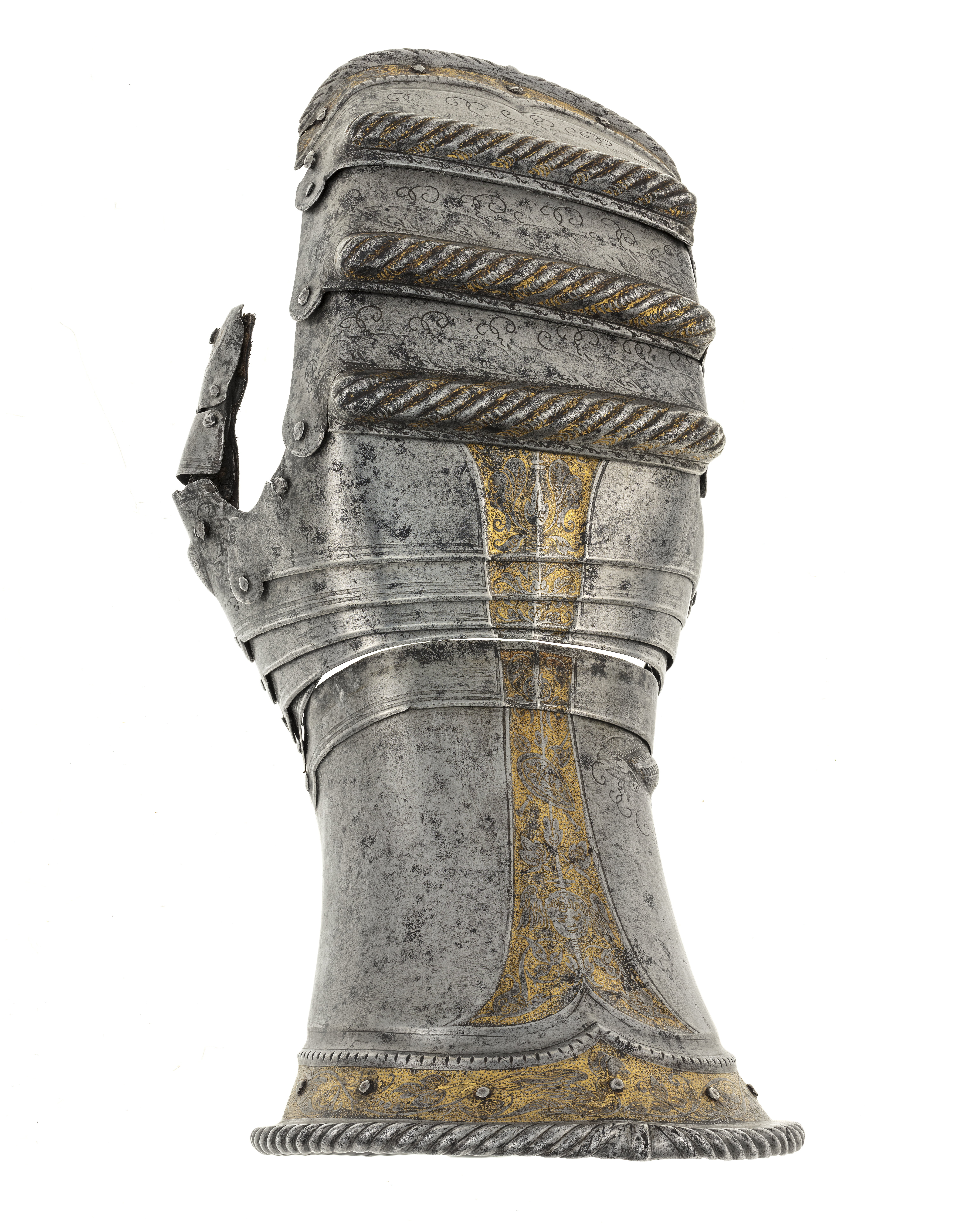 Bestående av rörformig krage, högre på utsidan, räfflad kantvulst, droppformig, driven stopp för överhandslamellernas rörlighet. Rörlig lamell på insidan med etsad, förgylld kantbård av triangulära spetsar. Överhandsskydd av fyra lameller med driven droppformig dekor över tummen, tumskydd av två plåtar, nu på läderband. Fingerskydd för alla fingrar i form av en plåt i flykt med överhandsskydden samt tre lameller med större rörlighet över fingrarna, kraftig, snedräfflad vulst över knogarna. Etsad dekor som ovan, på mittlisten en seraf samt spetsoval ? med korslagd hillebard och klubba bakom. Spegelvänd jämfört med vänster handske.