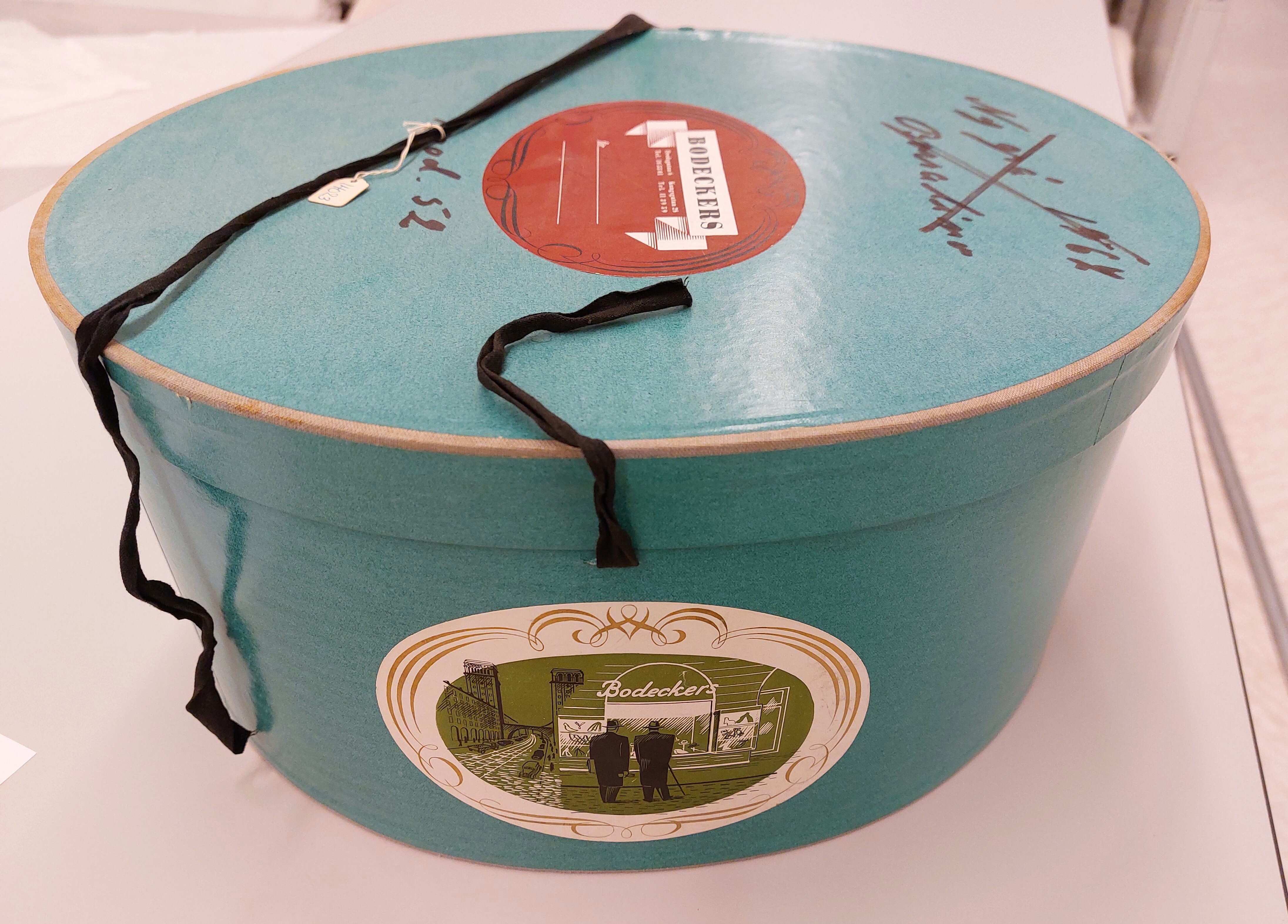 Oval hattask klädd med grönt papper. På sidorna oval firmaetikett märkt: "A. F. Bodecker". På lockets ovansida oval etikett, vinröd med text: "BODECKERS)) Fredsgatan 6 Kungsgatan 28)) Tel. 105501 Tel. 113959". Tillskrivet med svart tusch: "Ny gra 1967)) Borsalino)) mod, 52". Locket knytes fast på ovansidan med svart bomullsband. l: 370mm, b: 310mm, h: 175mm.