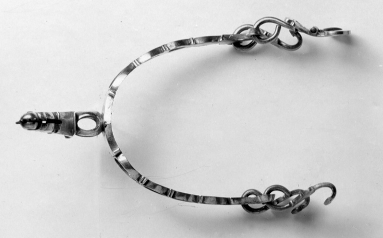Sporre av stål. U-formade skänklar. Hals vinkelformigt böjd, kulformig närmast fästet, tillsammans 67 mm lång. Stor 5-tandad klinga. I skänklarnas ändar ringformiga hållare. I den ena änden två krokar, i den andra en krok och en stor genombruten sölja av försilvrad mässing med ena sidan bredare och utdragen utanför de andra. Sporren i sin helhet med punsad dekor.