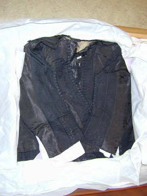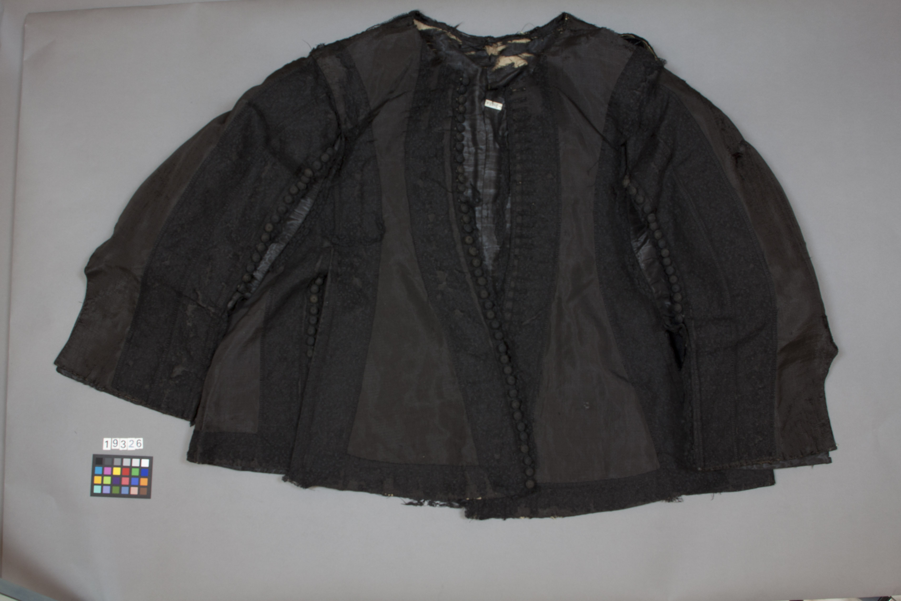 Dräkt av svart rips (även kallat tusian eller gros de tours) bestående av "stackot jacka"och byxor. Materialet, som kallas swart sijdentygh, s.k. Tusian 1671. Swart Tussian 1773,swart randigt sidentyg 1855 och slutligen 1867 svart gros de tours, är en svartsidenripsvävnad. Vådbredden är ej under 70 cm (64x15 tr/cm2). Vävnaden består av svartotvinnat silke med effektrand vart 3:e inslag. Samma ripsmönster går ända ut i staden, som alltså ej är avgränsad. Den s.k. stackota jackan är ett plagg med längre skört än tröjorna haft. Denna typ avlivplagg har ej heller skurits av i midjan. Ty jackan är skuren i 2 fram-, 2 bak- och 2sidostycken. Varje ärm består av 2 svängda ärmstycken och den främre sömmen är liksom ärmarna i de tidigare genomgångna dräkterna, öppen. Kragen, som torde varit en ståndkragehar tydligen förkommit vid något tidigare tillfälle. Framstyckena går ut i en rektangulär förlängning åt sidan som på höjden går mellan ärmhålet och sidoskörtstycket och bak når till bakstyckets sidokant. Jackan har framtill 27 st knapphål (2,5 cm långa, sydda med ca 7 stygn/cm över 1 tråd avsvart högertvinnat silke). De börjar först 20 cm från nederkanten räknat och ligger drygt ½cm från kanten. Längs hela högra framkanten, d.v.s. i en jämn rad ända nedifrån och upp,sitter en obruten tät rad med 39 knappar (d: 1,25 cm). Dessutom finns 21 knappar i varderaärmen, varav 2 kan knäppas uppe och 2 nere, endast dessa senare har motsvarande knapphål. En hel knapprad har ursprungligen funnits i vänstra sidoskörtets främre kant, varav de 3 översta kunnat knäppas - nu finns allt som allt blott 2 kvar. Alla 19 knapparna i sammaskörts bakre kant finns däremot kvar och de 3 översta är genomknäppbara. Baktill finns alla 21 knapparna kvar på vänstra styckets kant mot sprundet i mitten, de 3 översta går att knäppa. Högra sidoskörtet har på den bakre kanten alla 20 knapparna kvar, varav de 3översta är genomknäppta. På samma skörts främre kant sitter de nedre 18 kvar, de 3 som skall kunna knäppas saknas. Jackan är på insidan fodrad med svart taft, moiré, av 2 sorter. Man kan tyvärr ej bestämma vådbredden på det slags moiré som till största delen begagnats (42x26 tr/cm2) men dess stad är 0,6 cm bred. (8 gula, 4 röda, 4 gula, 4 röda, 8 gula, 1 svart tråd). I sidoskörten och ärmarna sitter den andra moirén som verkar tätare vattrad. Dess trådtäthet är 48x30 tr/cm2och stad: 0,8 cm bred (med 6 gula, 5 orange, 6 gula, 6 orange, 6 gula, 6 orange trådar).Mellanfodret utgörs av oblekt linnelärft (17x15 tr/cm2). Som styvnad i manschetterna har man begagnat mörkbrun kanfas. Förutom av knapparna, som är gjorda av tagel, med mönsterlagt i koncentriska cirklar med 2 och 2 strån vänstertvinnade, garneras jackan av en ca 5,2 cm bred svart linnespets längs alla ytterkanter. Längs de vertikala kanterna går dessutom en ca 2,5 cm bred spets. Den bredare och den smalare spetsen är fastsydda med en 0,6 cm bred pie av svart silke. På ömse sidor av ärmarnas långa sprund sitter 2 breda spetsar. Det borde funnits hängslen, fastsydda i axelsömmarna på jackan, men dessa har tydligen kommit bort. Därför har byxorna ursprungligen ej haft mer än 4 hakar.