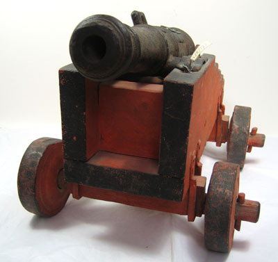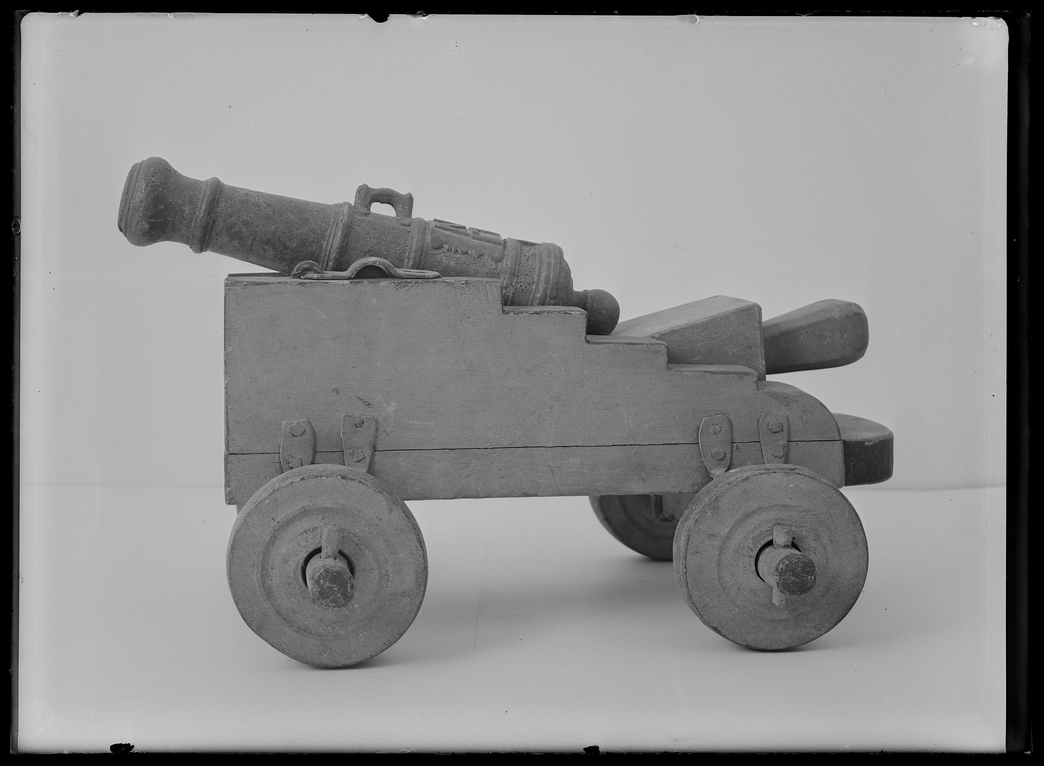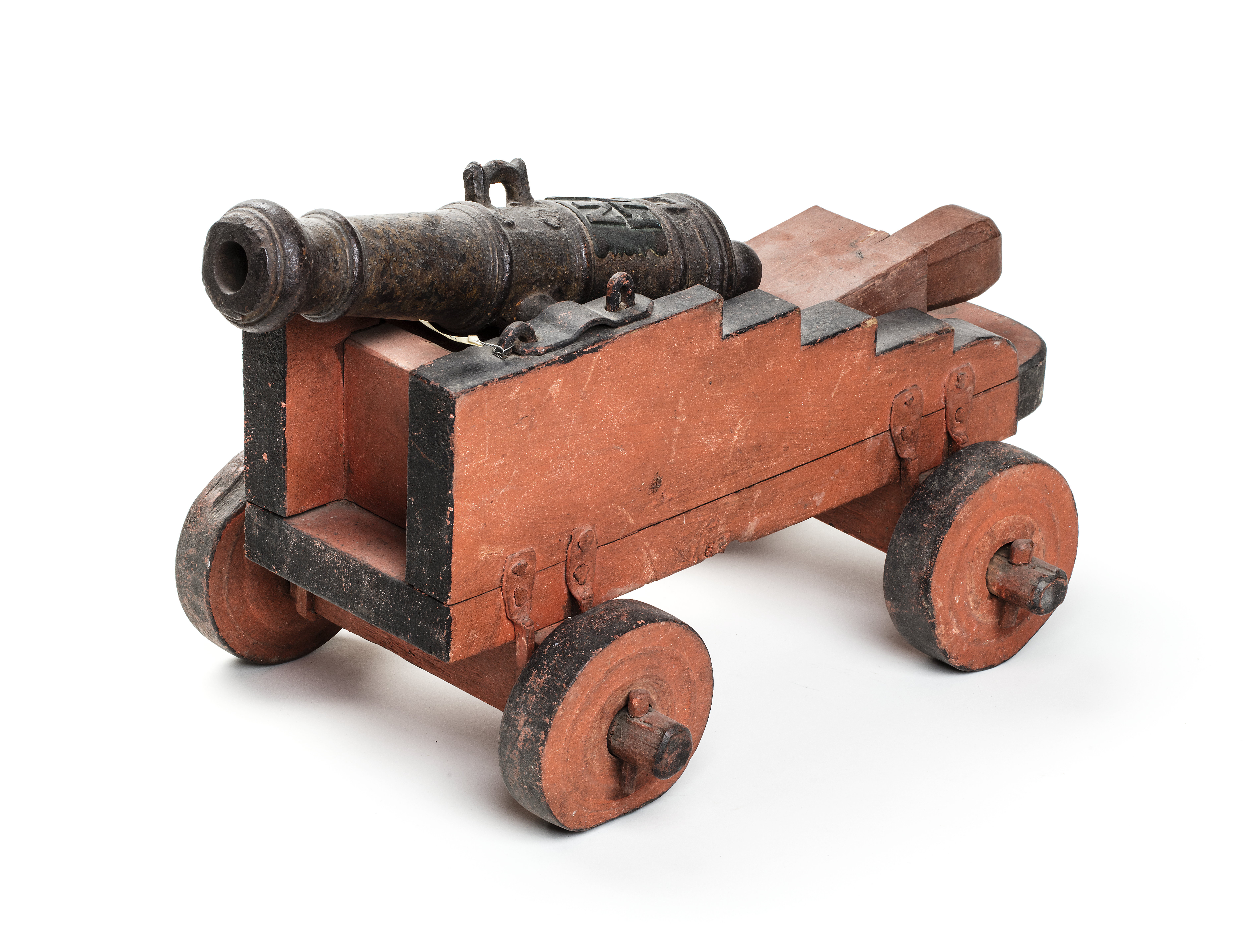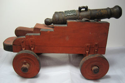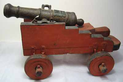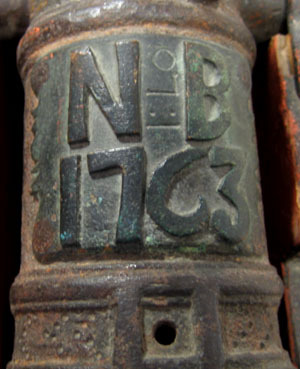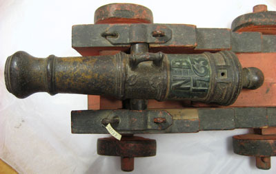Rör gjutet i mörkt stål, ursprungligen gulmålad rester återstår nu. Cirkulärt tvärsnitt, framåt avsmalnande med framtill trumf. Svarvade ringar framtill, i mitten och över kammaren. I mitten handtag, ett saknas. Heltäckande punsad dekor i form av romber och linjer. Kraftiga cylindriska lavettstöd. Baktill kraftig druva. Över kammaren fyrsidig förhöjd ram, i mitten fänghål diam 2,5 mm. Ovanfö denna mässingsplåt med konturerade sidor, i relief "NB 1763" mellan bokstäverna inslaget "I:Lo". Lavett av furu, målad i rött med svarta kanter. Rektangulär botten med rundad bakkant. Gavlarna trappstegsformade med släta sidor, framtill förbundna med ett lägre framstycke. Hjul av trä, röda med svarta kanter och svarvade dekorativa ringar. Hjulen fästade med tappar i den kraftiga hjulaxeln av trä, denna fäst med U-formiga beslag i lavettens sidor. Rörets lavettstöd försänkta i gavlarna, hålls på plats med stålbeslag med ena änden över märla och därmed låsbara. Alla stålbeslag svarta över rund grund. Tillbehör: Laveringskil i trä, L 190 B 66 mm. Rektangulärt tvärsnitt, framåt avsmalnande med baktill fyrsidigt grepp med fasade kanter. Heltäckande röd bemålning. Tureholm