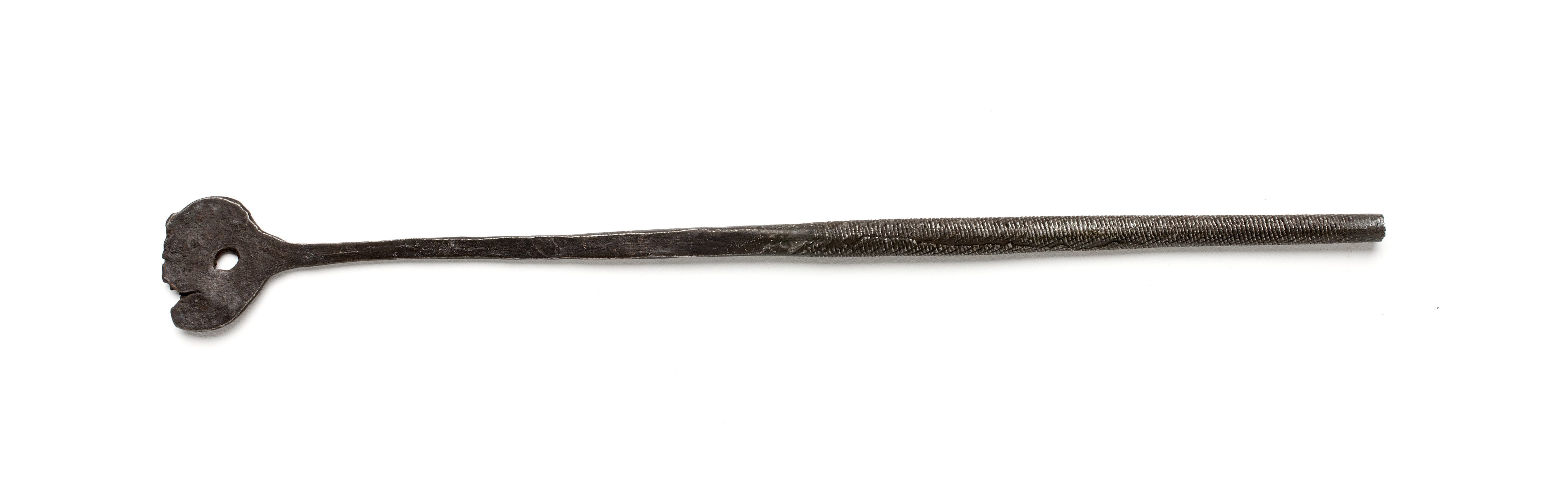 Utsmitt fyrsidigt skaft med rund platta med hål. Stämpel: klöverblad.