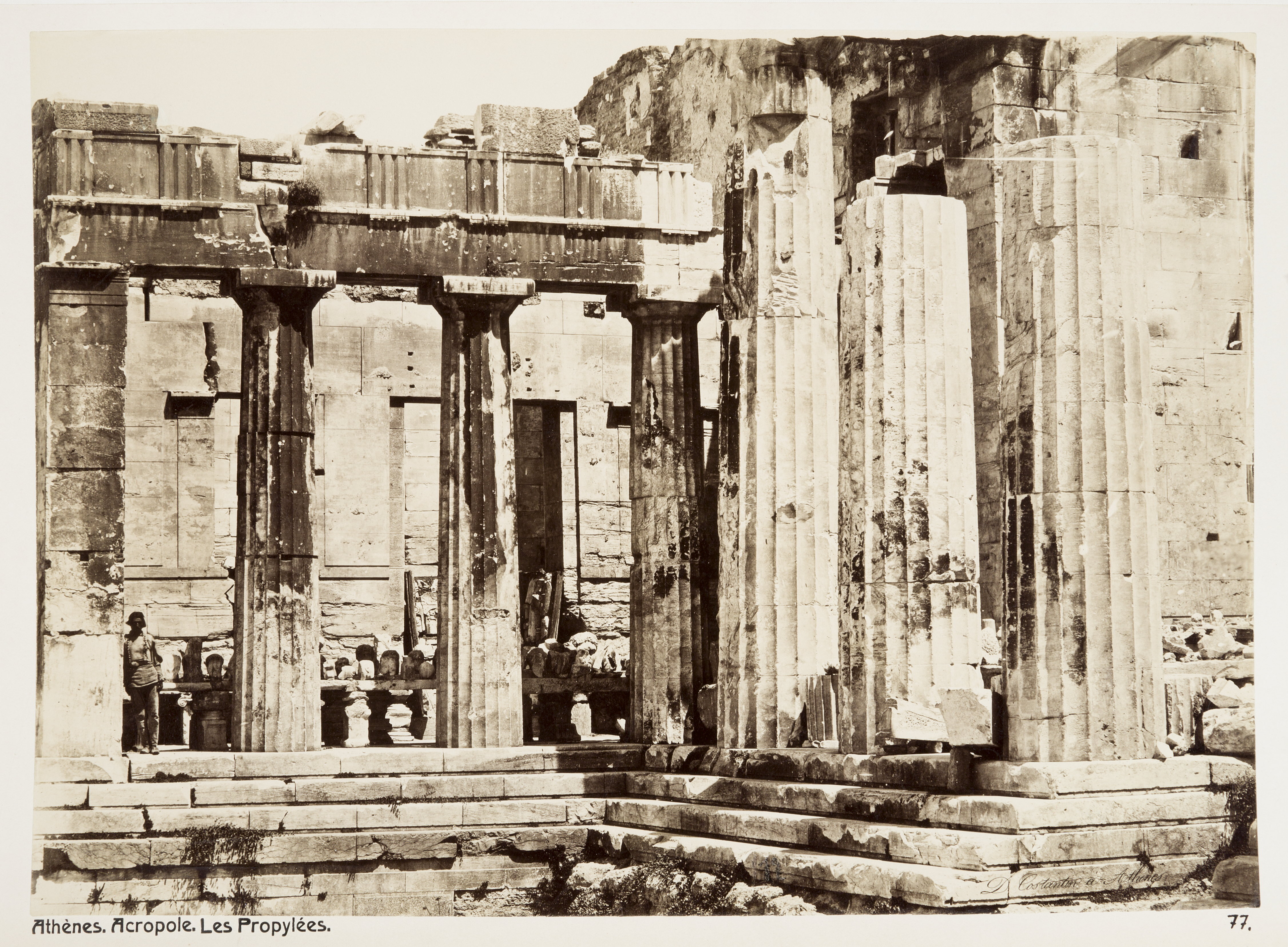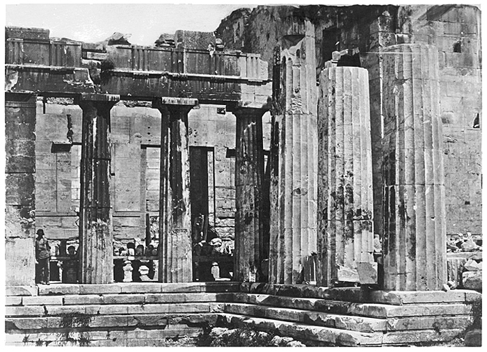 Propyléerna på Akropolis i Aten. Text på originalet: "Athènes. Acropole. Les Propylées." Foto från resa genom Grekland, Makedonien och Serbien, 15 mars-6 juni 1896. Fotografierna LXVI:K.18.-147. är köpta av Wilhelmina von Hallwyl, f. Kempe på Korfu samt i Patras, Nafplion, Aten, Thessaloniki och Belgrad. Med på resan var maken Walther von Hallwyl och fröken Ida Uhse. Uppgifterna kommer från Ida Uhses reseanteckningar.