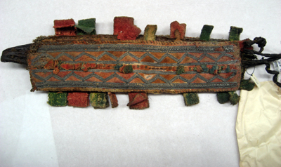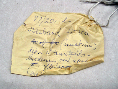 Halsband av två jämnbreda band på ovansidan klädda med blekrött kläde med en dekor av tenntrådsbroderi och i mitten med en rad av små flikar av rött, blått och grönt kläde. Banden kantas runtom av flikar av rött och grönt kläde. På undersidan är klätt med ljusbrunt skinn. I det ena bandets ände är påsytt en ögla av rensenor och i ändan på det andra bandet sitter påsytt ett långt band av tvinnade senor. Banden är vid varandra sammanlänkade med ett band av brunt skinn. Ao 1694 d. 20 Novembr. lefverass uthi Rust Cammarn en lapp medh een lapmudh och bllå fodrat mösssa lijgandes uthi een akia kiörandes föör sigh een Reenn, medh sijtt tygh på sigh och een klåcka under Hallsen, detta ähr förährat af Landz Härren ifrån Nårlandh Grefwe Duklass.