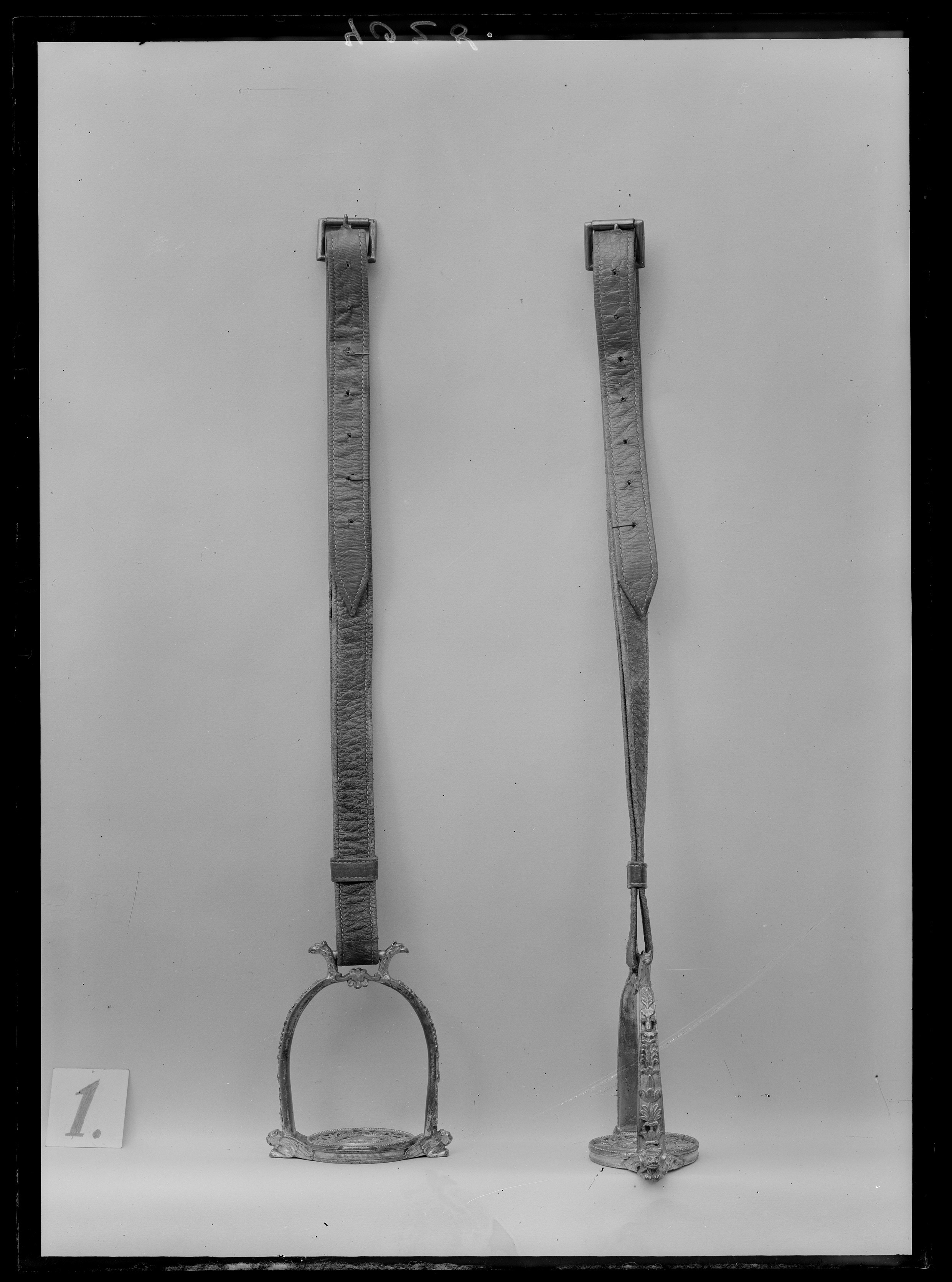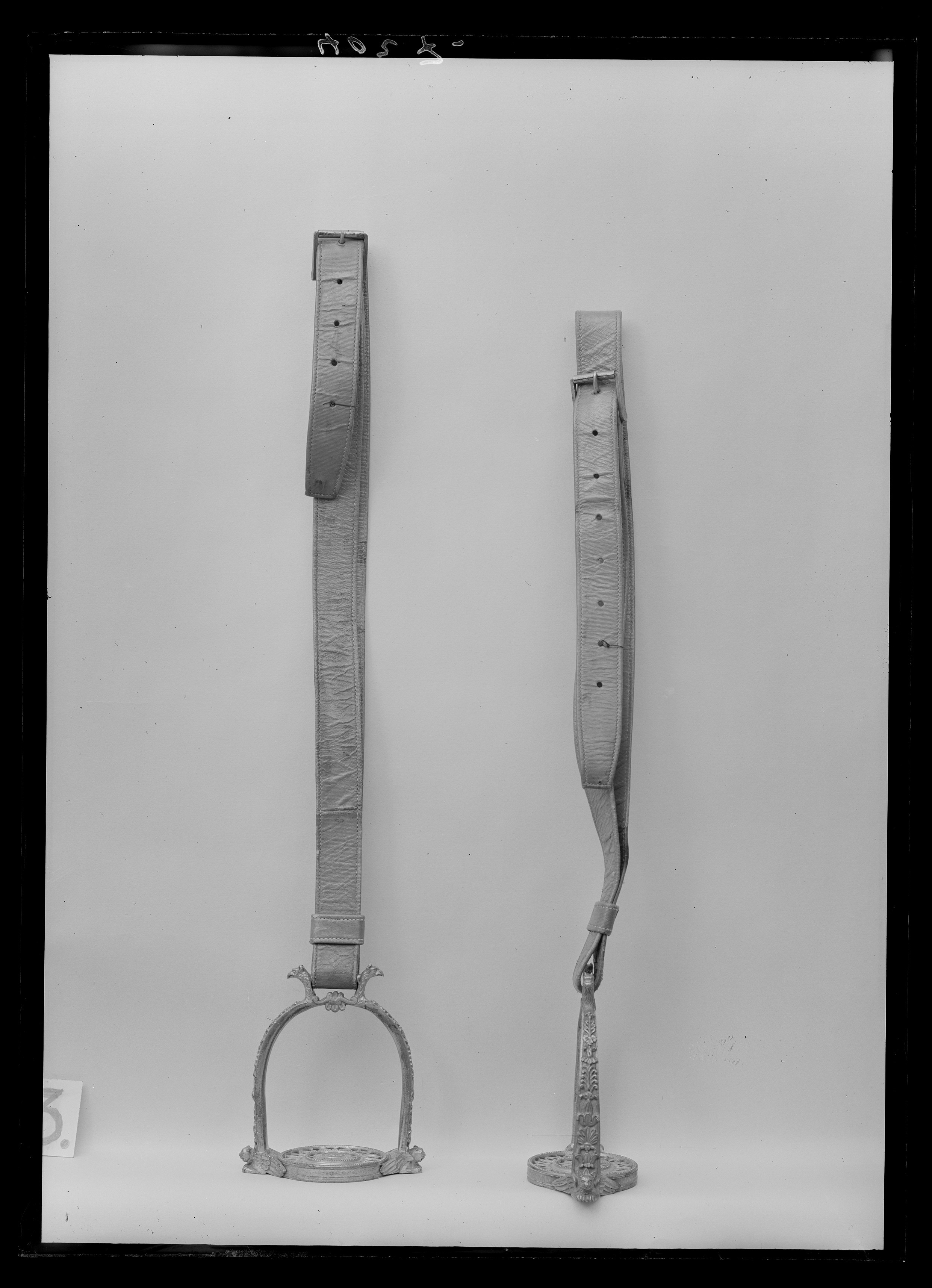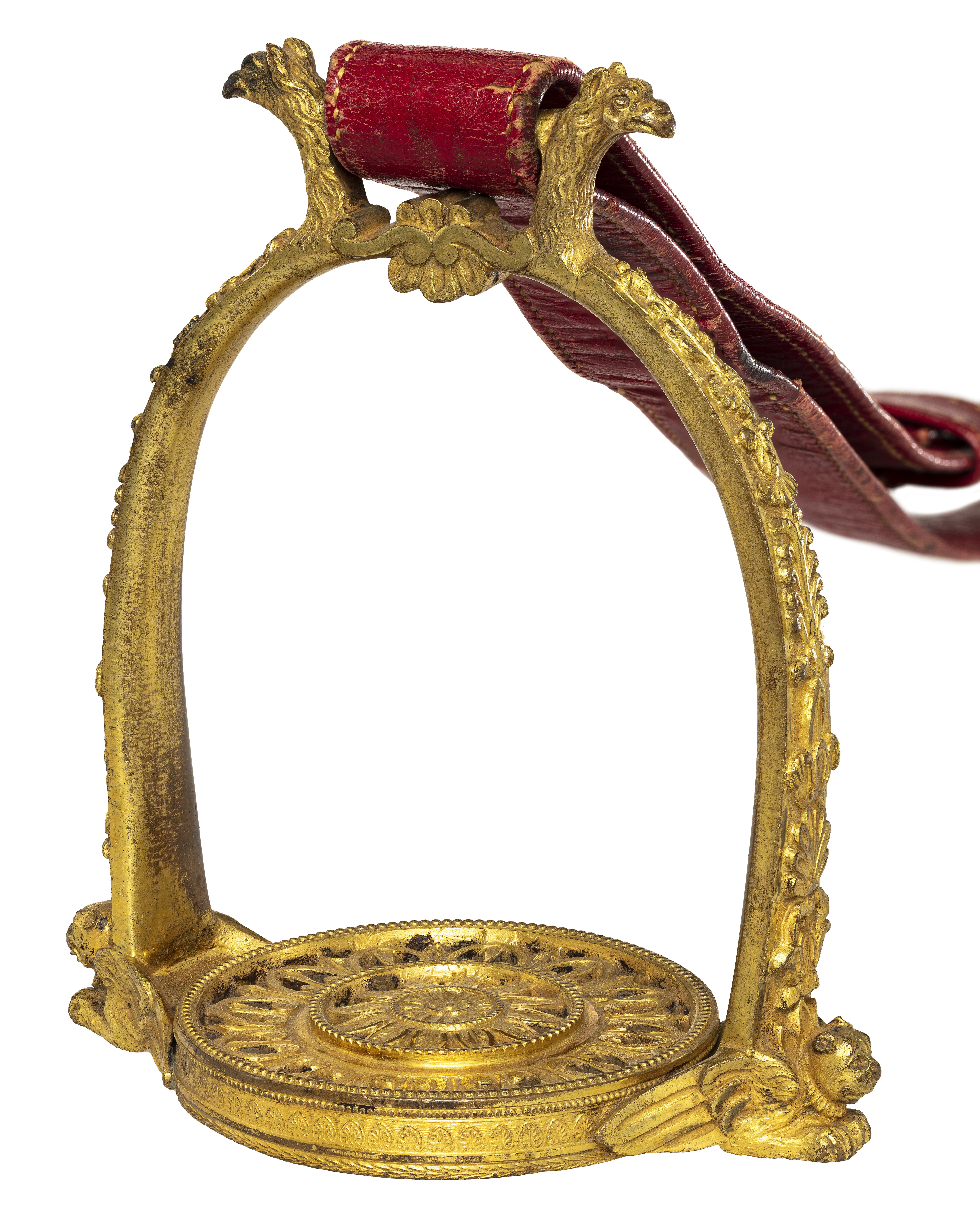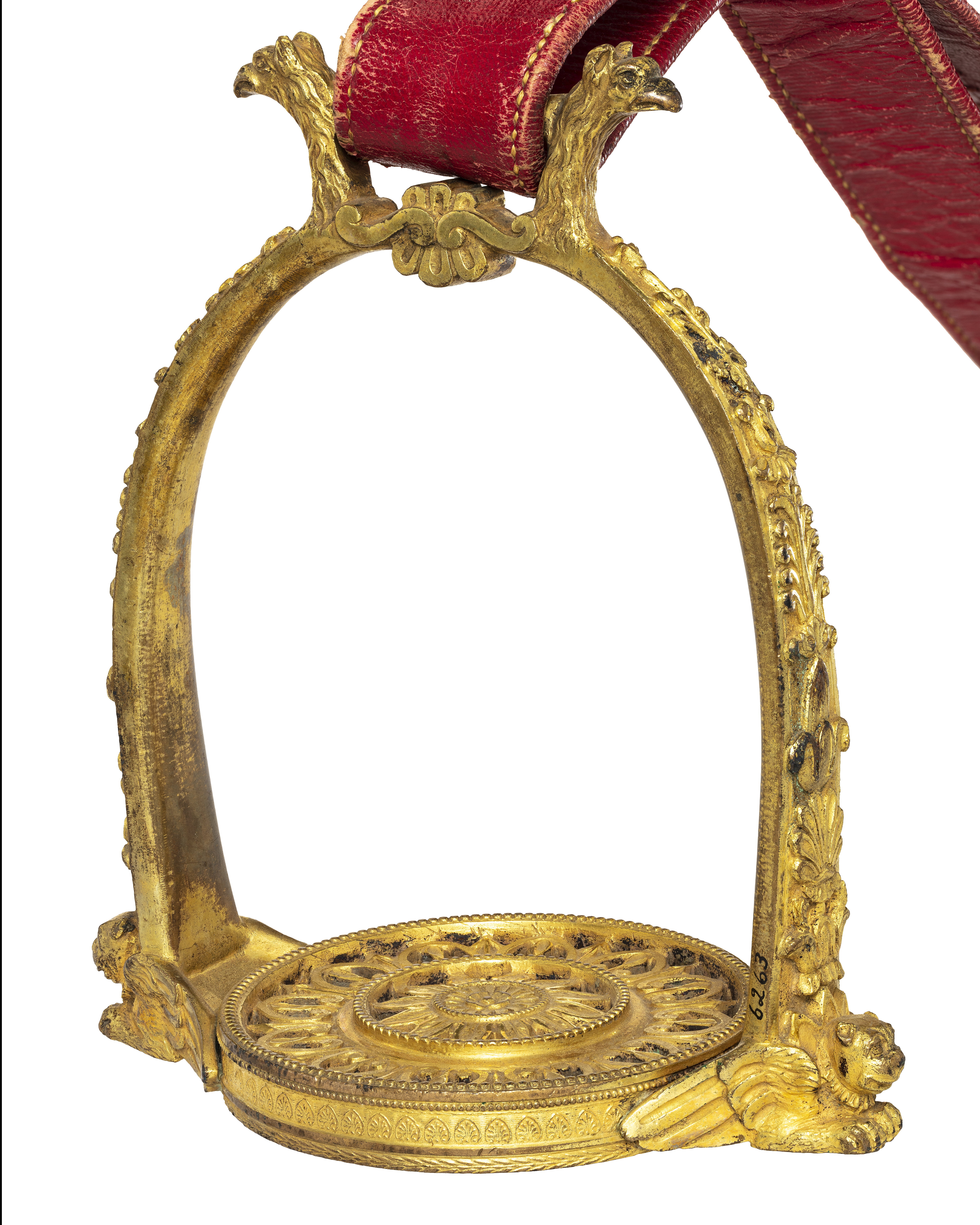 Stigbygel av förgylld, reliefornerad mässing. U-formade skänklar med slät insida, på utsidan blad-och palmettornament, nedtill vid trampstödet utåtvänt lejonhuvud med vingar. Runt genombrutet trampstöd av två koncentriska cirklar, den inre med blomornament, den yttre med bladornament. Fast rektangulär remögla på var sida med ett utåtvänt örnhuvud. Tillbehör: Stigläder av rött läder med rektangulär sölja av stål med löphylsa.