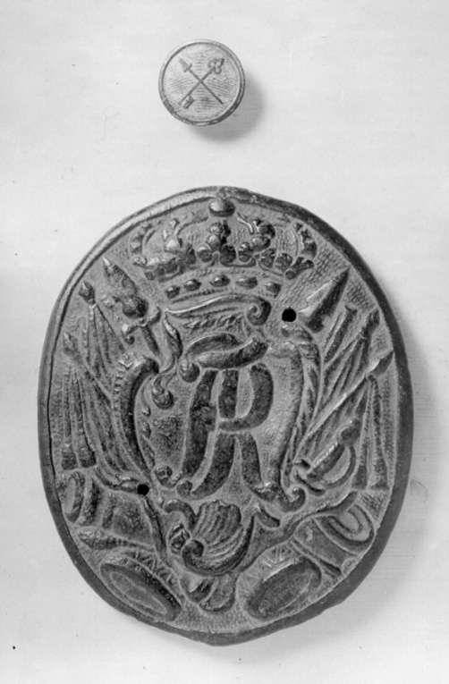 Oval, gjuten plåt av mässing med trofégrupper samt sluten kunglig krona och F R (Fredricus Rex, Fredrik I). Två små genomgående hål. På insidan fyra små rektangulära hakar utmed kanterna. Tillbehör: rund plan knapp, tvärräfflad, förgylld botten med korslagd svärd och nyckel.(Knappen senare tillkommen). 1800-talets början. Korslagda svärden och nyckeln är Kammarrättens emblem.