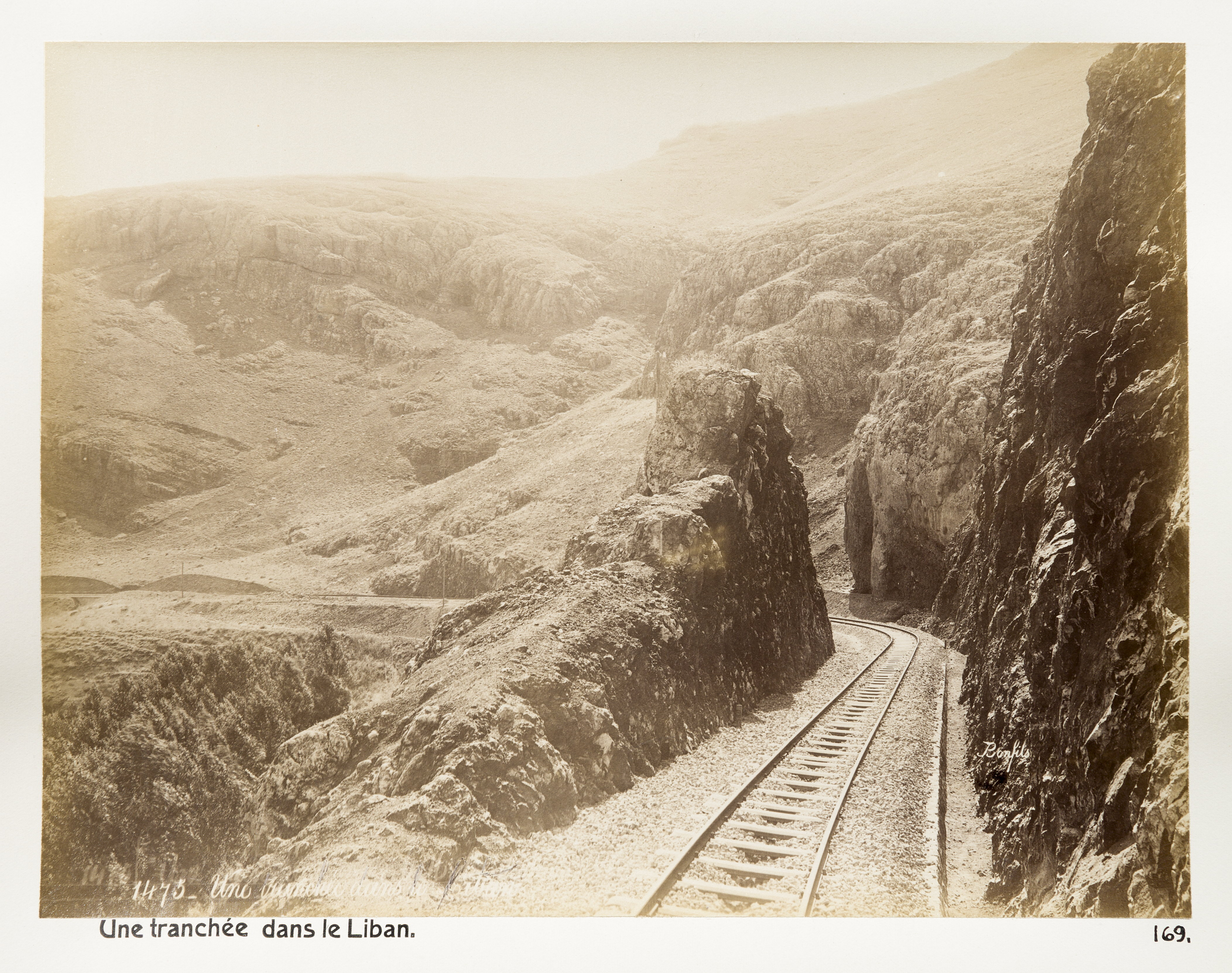 Tågspår i Libanon. Text på originalet: "Une tranchée dans le Liban." Fotografierna LXVI:N.01.-180. kommer från resan till Palestina och Syrien som Wilhelmina och Walther von Hallwyl gjorde den 30 mars-27 april 1901. De lämnade Sverige den 5 november 1900 för Egypten, där de stannade till den 28 mars 1901, då de fortsatte till Palestina. Med på resan var Wilhelminas sällskapsdam, fröken Ida Uhse. Den 27 april fortsatte de till Turkiet och Mindre Asien. De mindre fotografierna (utom de från Samos) LXVI:N.90.-100. är tagna av Wilhelmina själv, under en resa till häst från Jerusalem till Damaskus 8-20 april 1901. Övriga fotografier är inköpta av Wilhelmina i Jerusalem, Damaskus och Beirut. Alla uppgifter kommer från Ida Uhses reseanteckningar.