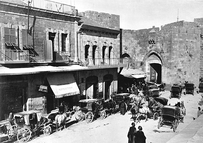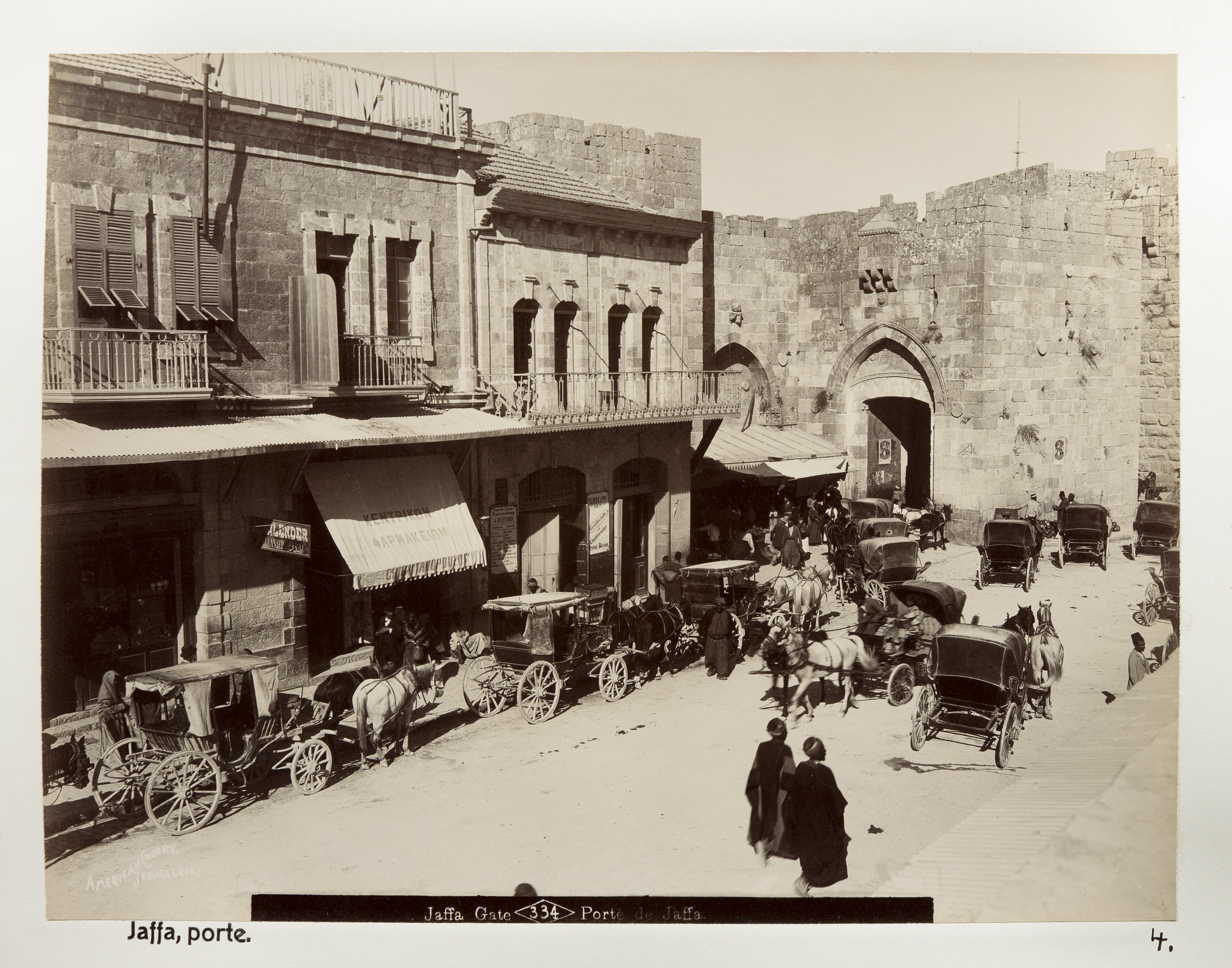 Jaffaporten i Jerusalem. Text på originalet: "Jaffa Gate/Porte de Jaffa". Den senare tillkomna texten i nederkanten, "Jaffa, porte" är en missuppfattning. Fotografierna LXVI:N.01.-180. kommer från resan till Palestina och Syrien som Wilhelmina och Walther von Hallwyl gjorde den 30 mars-27 april 1901. De lämnade Sverige den 5 november 1900 för Egypten, där de stannade till den 28 mars 1901, då de fortsatte till Palestina. Med på resan var Wilhelminas sällskapsdam, fröken Ida Uhse. Den 27 april fortsatte de till Turkiet och Mindre Asien. De mindre fotografierna (utom de från Samos) LXVI:N.90.-100. är tagna av Wilhelmina själv, under en resa till häst från Jerusalem till Damaskus 8-20 april 1901. Övriga fotografier är inköpta av Wilhelmina i Jerusalem, Damaskus och Beirut. Alla uppgifter kommer från Ida Uhses reseanteckningar.
