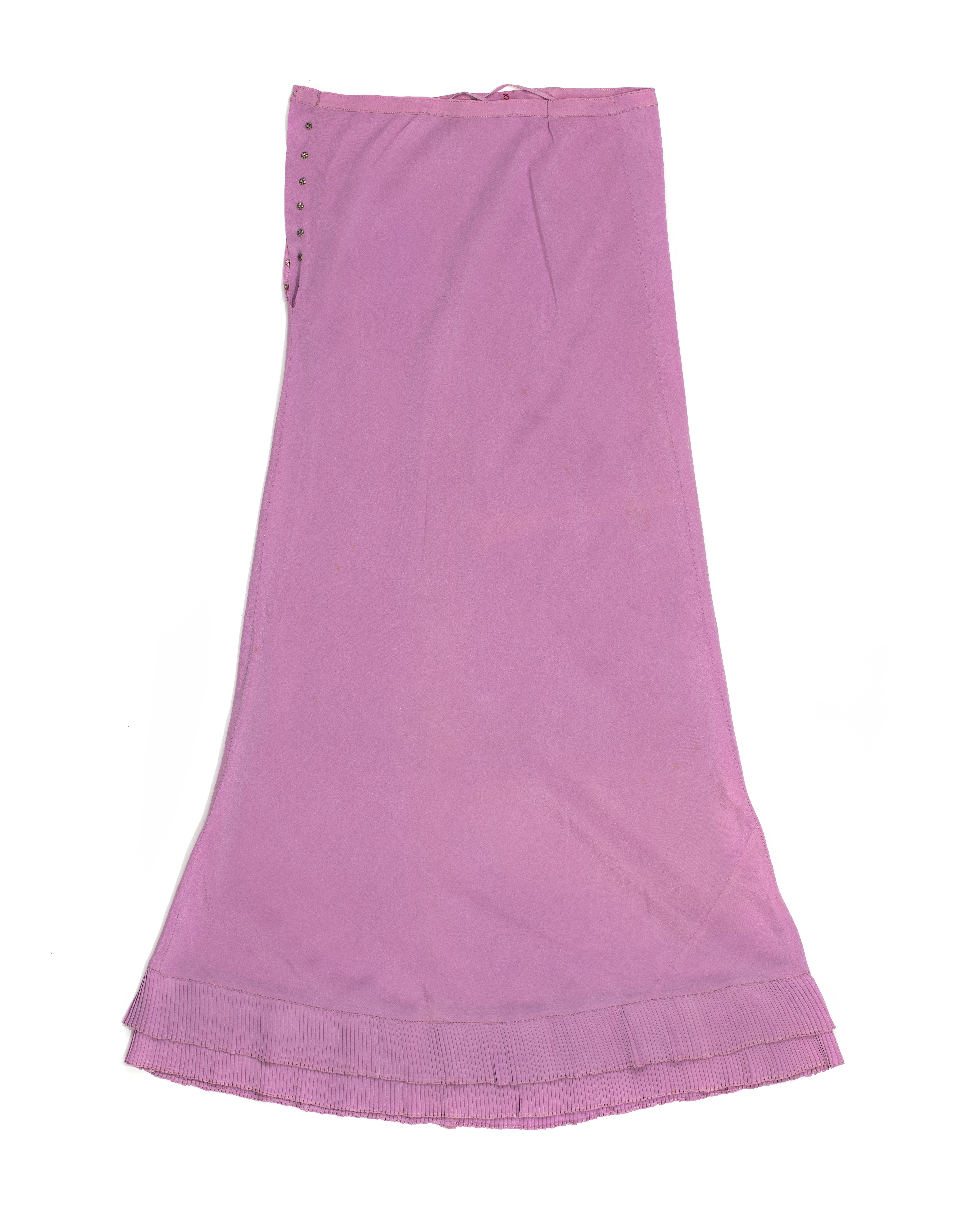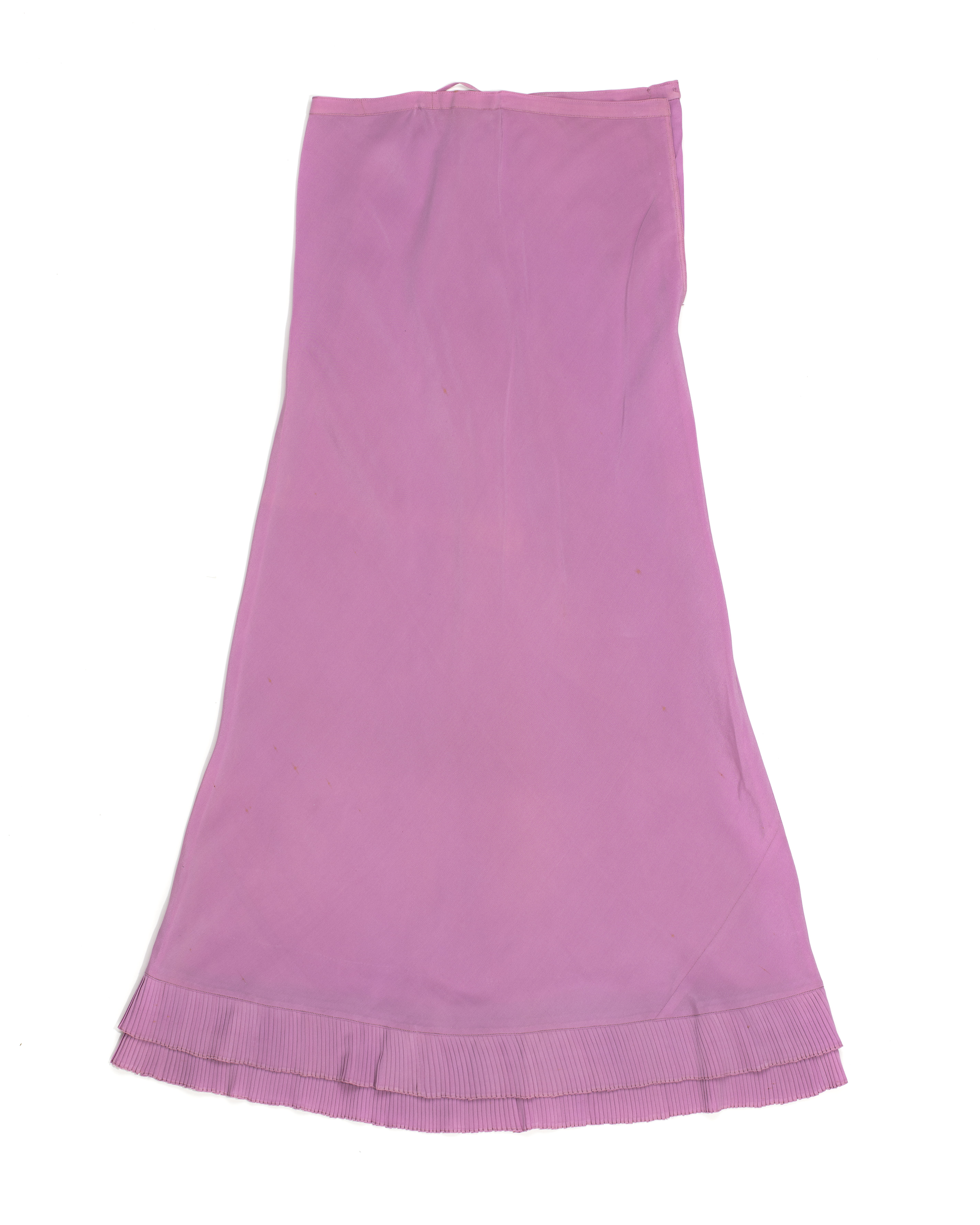 Hellång midjeunderkjol av ljuslila silkecrépe, skuren i två våder. Smal linning, bredd 20 mm. 220 mm långt sprund knäppt med sju tryckknappar och två hakar och hyskor i linningen. Nedtill två, 60 mm breda volanger, plisserade och lagda något över varandra. På linningens insida märkning med rött, tre korsstygn.