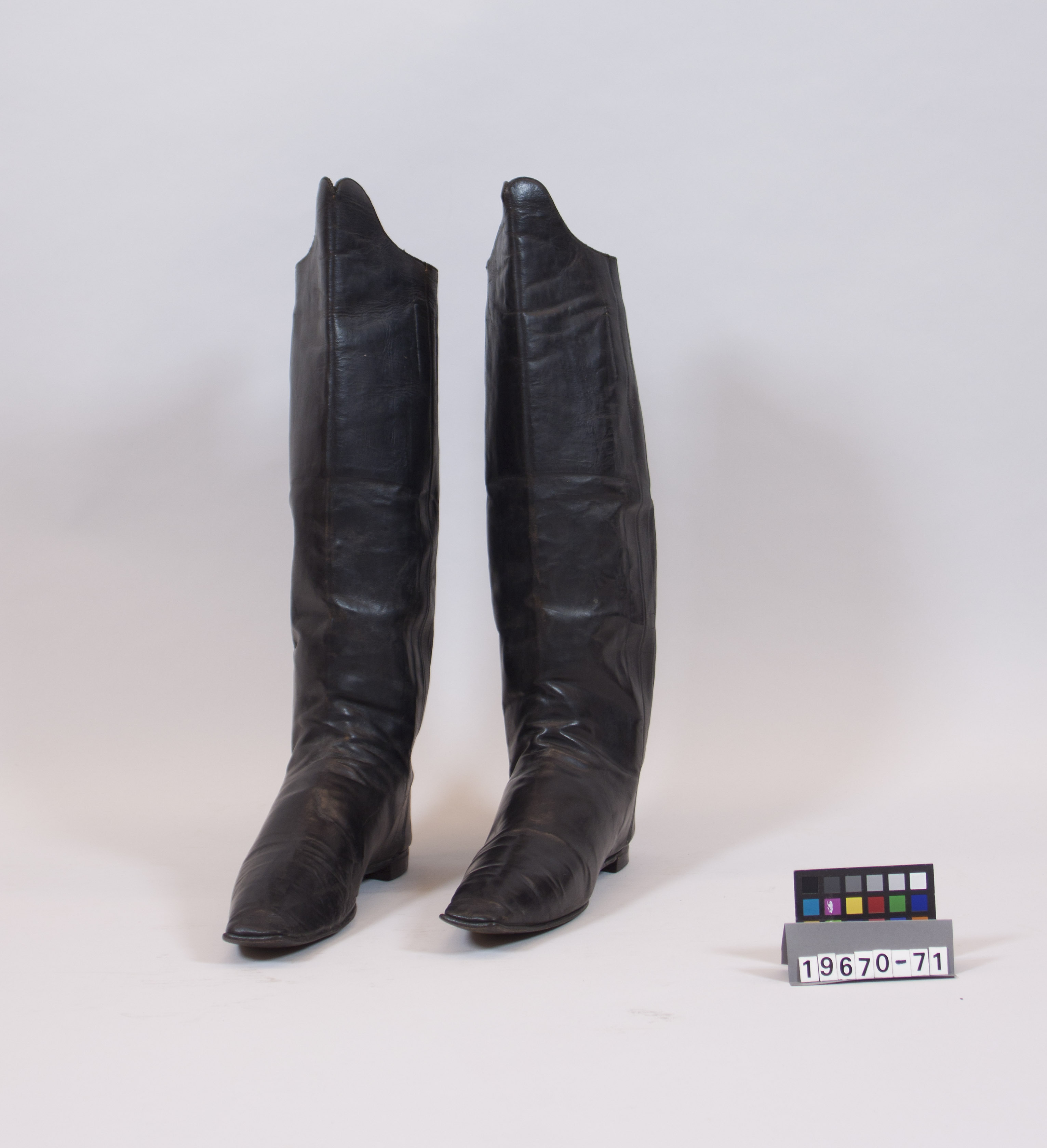 Stövel av svärtat gödkalvsskinn med narven utåt. Modellen är en sk. krökstövel (hessian boot). Troligen av den skärning som kallas bottemoll ?. Skurna i 2 stycken: framstycket som krökts i vristpartiet och bakstycket. Sömmar i sidorna - sydda från insidan. Skaftets övre del, som går upp i 2 rundade flikar mitt fram, fodrad med ljust läder. Här är stövlarna med bläck märkta 50. Obetydligt svängd smal läst, tvärt avskuren tå. Tunn vändsydd lädersula. Låg klack av 4 klacklappar varav den översta lagts ovanför sulan. Bakomrand påsatt med klacktrilla (??). På insidan över sidsömmarna - är ca 90 mm långa kypertvävda stroppar (30 mm breda) av vitt linne med 2 smala blå ränder - fastsydda.