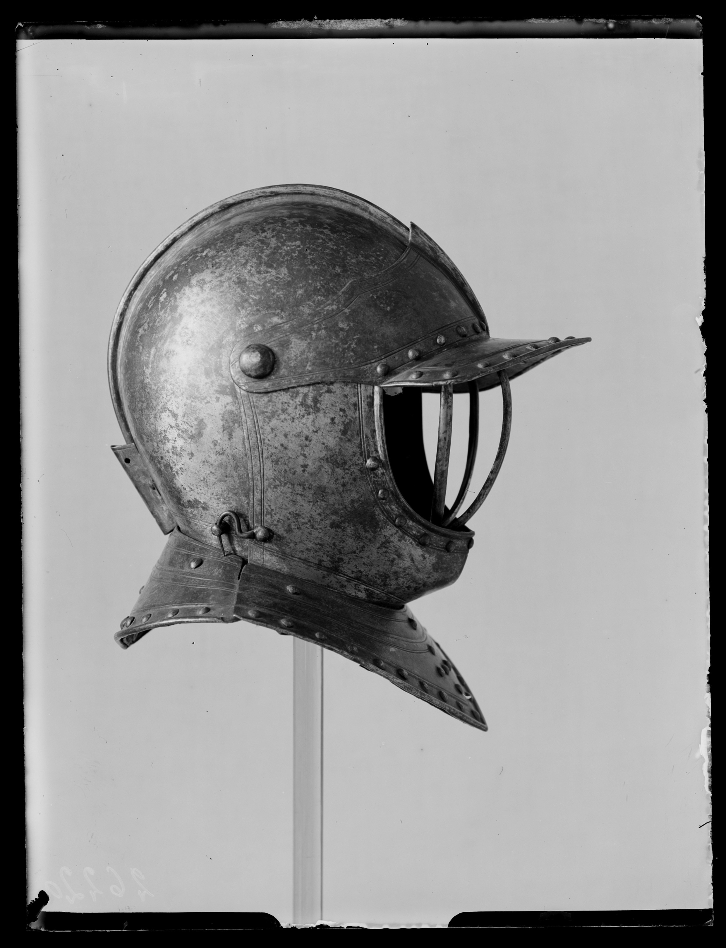 Av driven stålplåt med rester av förgyllning. Rundad klocka med något flackare sidor, sammansmidd av två halvor. Upptill kam, h 13 mm, med omvikt och rundsmidd kant. Baktill över kammens nedre del en plymhållare. Rörformig, upptill tresidig och nedåt avsmalnande och allt rundare. Åt sidorna konturerade vingar fästade med en nit. Upptill i var sida och nertill i mitten ett hål. Nertill avslutad med utstående kant och i denna nitad välvd krage med rundad kant. Pannklaff med övre kanten utdragen i två spetsar och i mitten driven ås för kammen att löpa genom. Ristad kantlinje och nertill nitar i rad. Skärm, b 65 mm, vinklad utåt och svagt uppåt med rundade kanter framtill i mitten hopgående i utdragen spets. Visir av tre stänger, b 9 mm, med cirkulärt tvärsnitt, fästade upptill i pannklaffen. De yttre nertill böjda inåt och sammansmidda med den mittre, vars nedre ände är lätt utdragen och konturerad. Hakstycke med rundade sidor nertill hopgående i spets över hakan. Driven svagt spetsig förhöjning över hakan. Nertill utstående kant med nitad välvd krage. Pannklaff och hakstycke ledade med i bakre kant genomgående bult. Alla yttre kanter omvikta, rundsmidda och med ristde kantlinjer och nitar i rad. Insidan med kantband av svärtat läder, b13 mm.