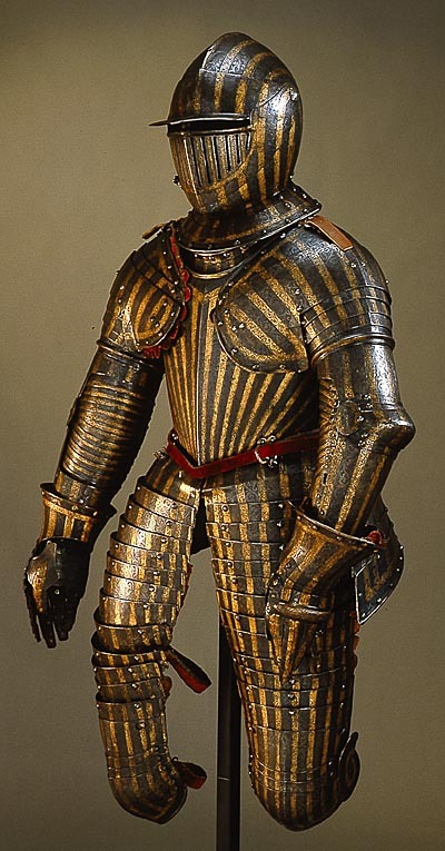 Karlfigur med hjelm, harnesk af ringkrage, bröst och ryggstycke, armar samt lårstycken af jernbleck med förgyllda ränder