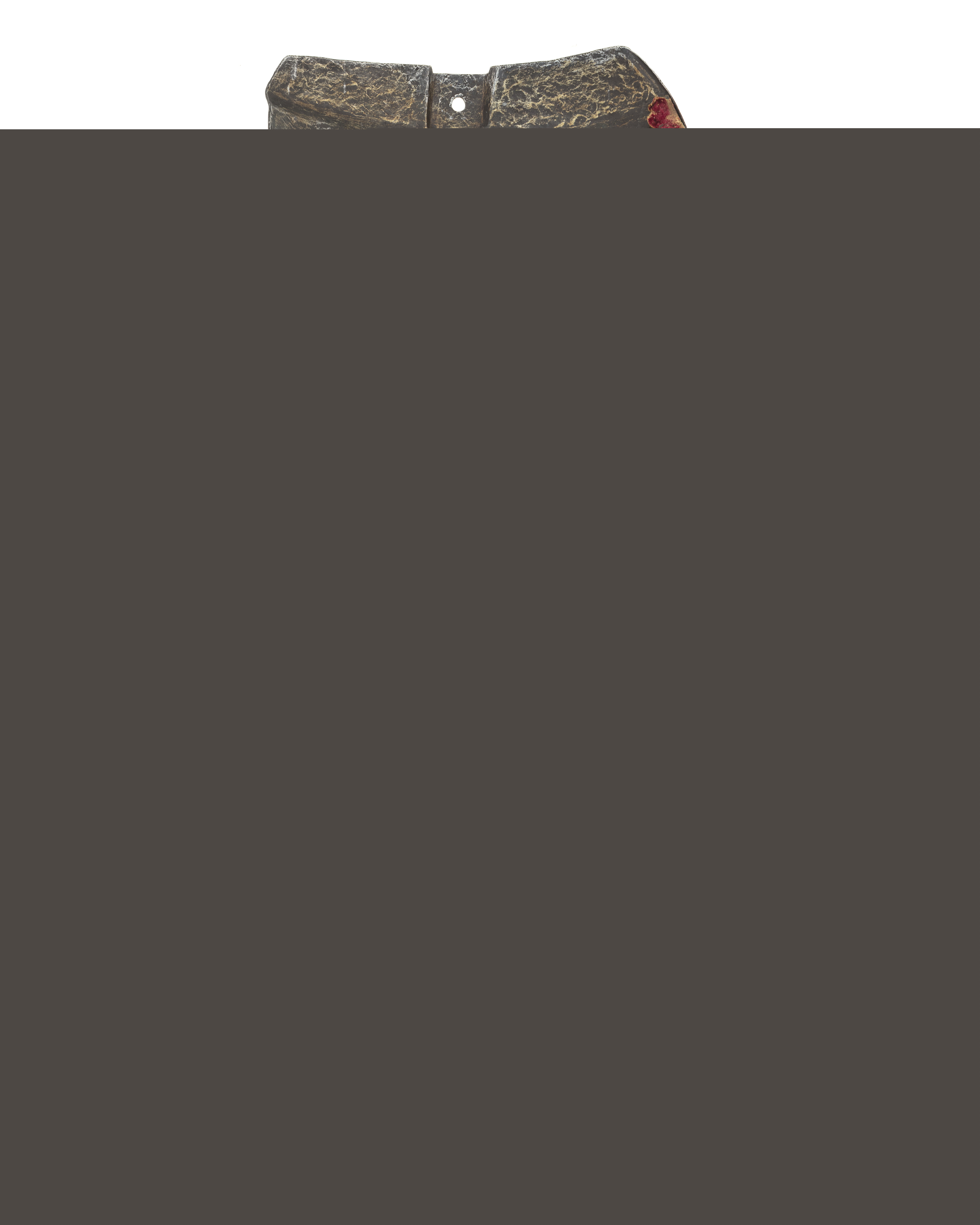 Karlfigur med hjelm, harnesk och ringkrage, bröst och ryggstycke, armar 2 handskar samt lårstycken af jernbleck med förgyllda ränder