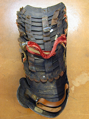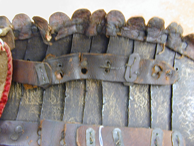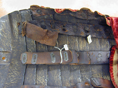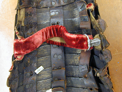 bröstharnesk med 2:ne axelsleifer af läder, klädda med rödt sammet och fastsatta med rosettformiga nitar - för lårskenornas fästande finnas 2:ne sleifer med skrifvar och muttrar af jern,