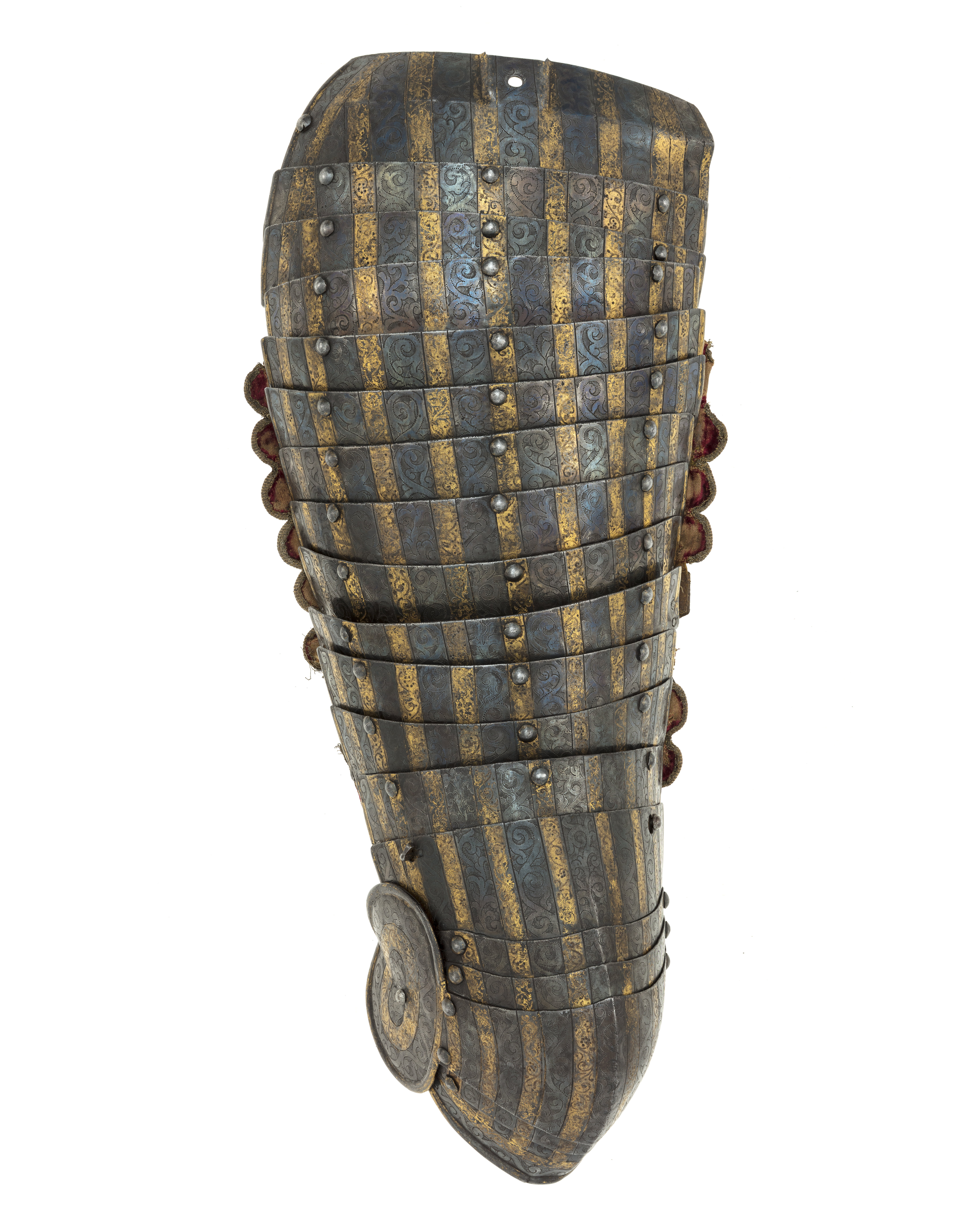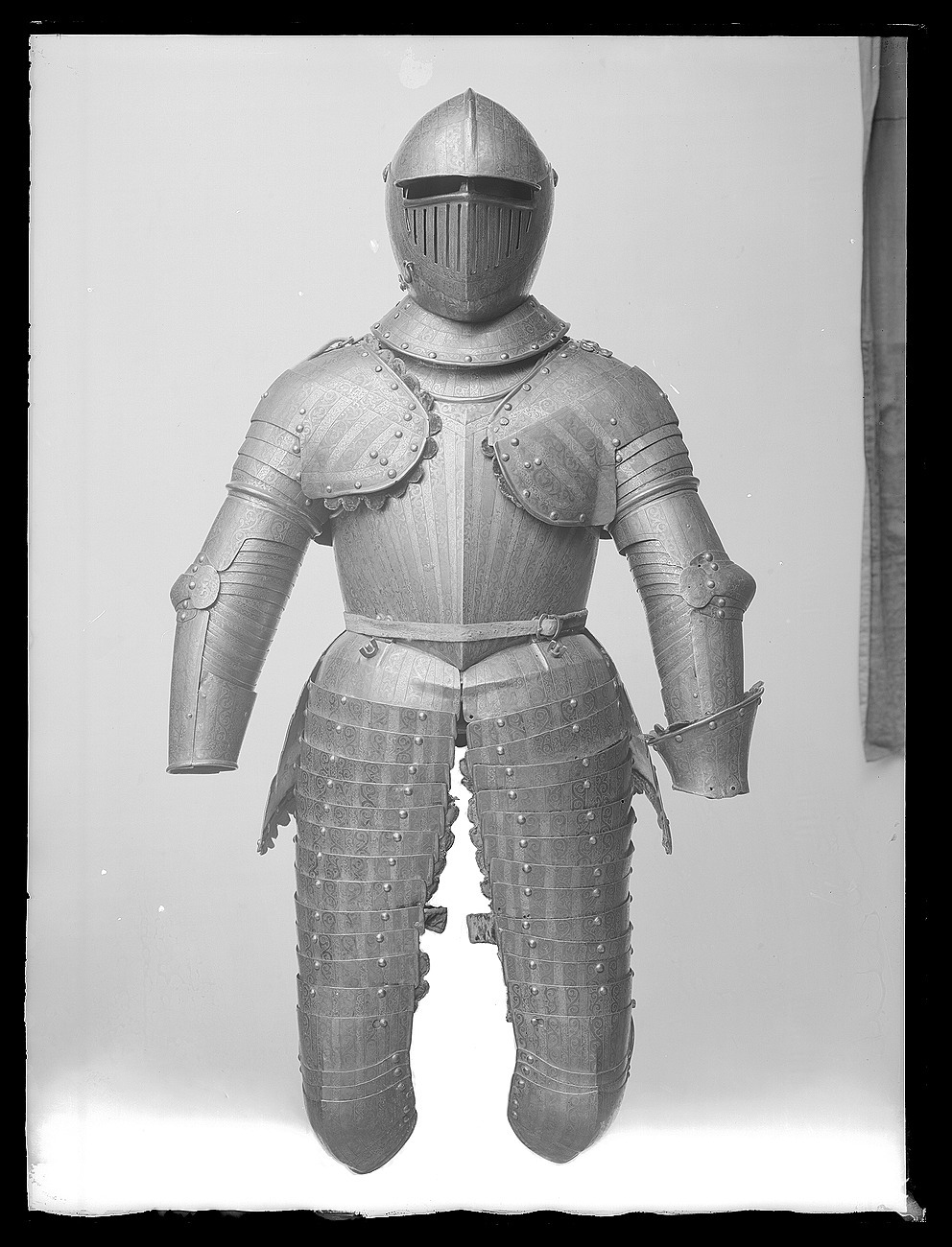 - Ett litet Harnesch af Järn, utstuckit arbete, med förgylte wänder uppå; Samma Harnesch består af Casqwett, Ringkrage, Armskenor, Bröst- och Ryggstycken, Lårskenor och ett par hanskar, Kommit ifrån Påhlen och Kostar - 90:-