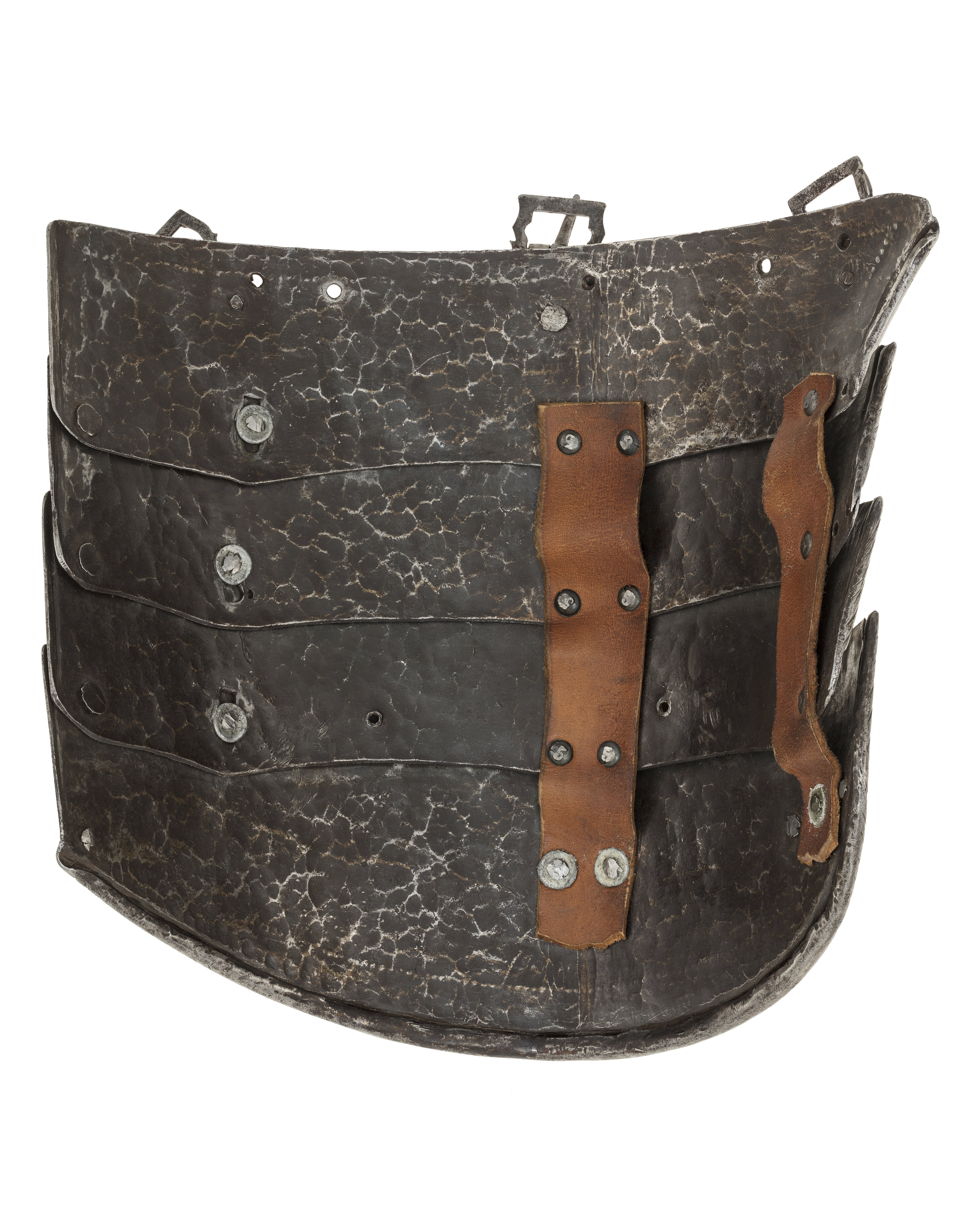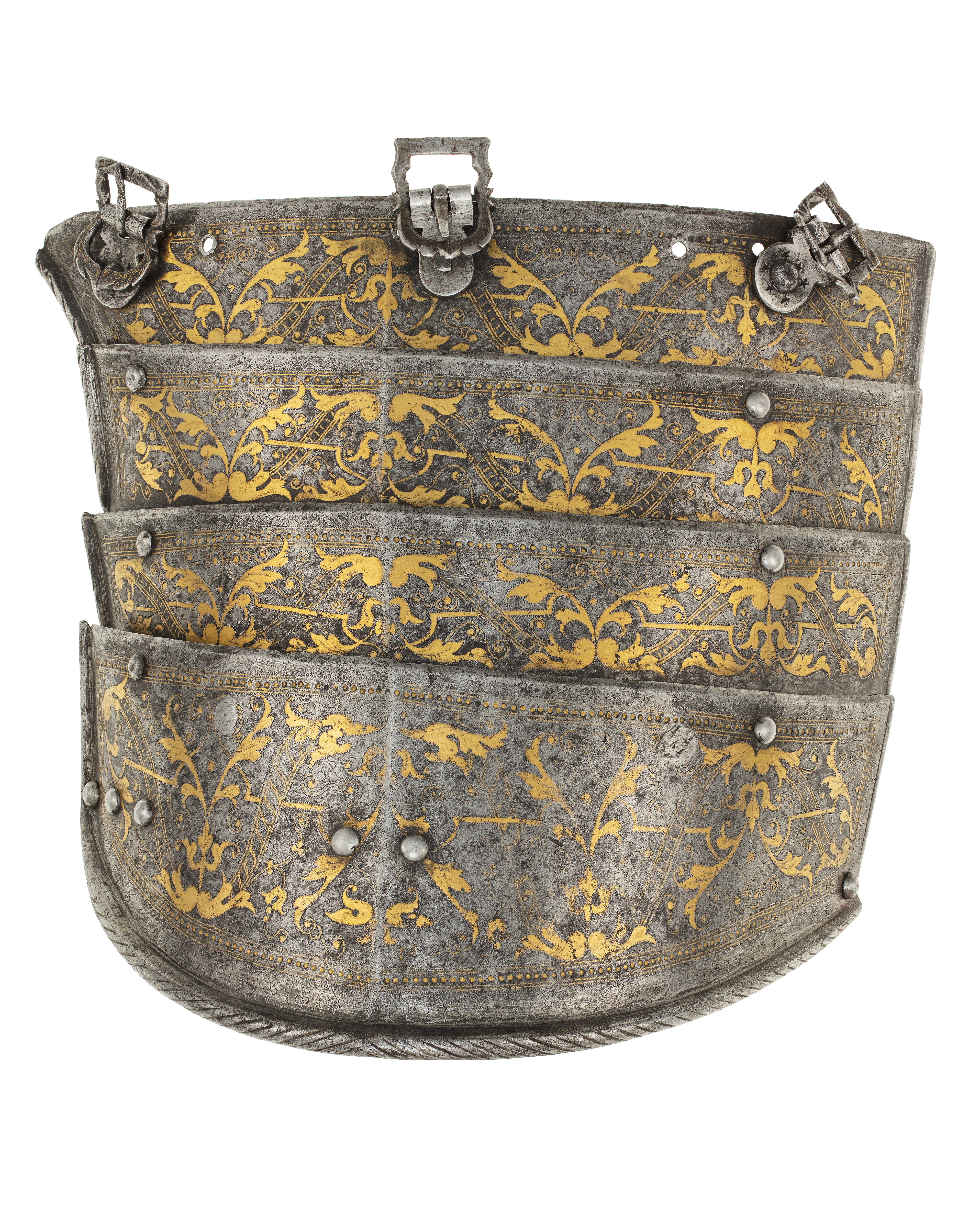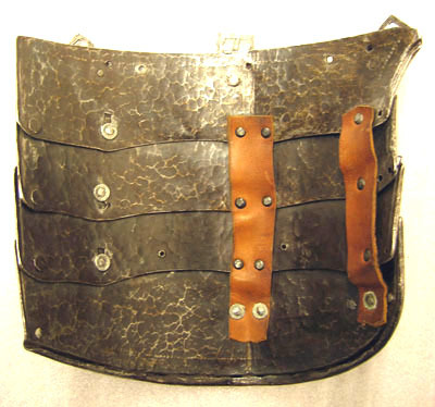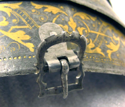 Driven stålplåt med på utsidan förgylld dekor mot mörk bakgrund. Insidan brunaktig med tydliga hammarslag. Av fyra välvda skenor lagda omlott och delvis rörliga i förstorade nithål. Längsgående skarp mittås, nedre kant rundad med svag spets. Översta skenan med i inre kant, upptill, ustskjutande del, 20 mm. I var sida och i mitten en nitad sölja. Ram med främre del rektangulär och bakre rundad, filad dekor och rester av förgyllning. Vinklad utåt 45 grader. Fästplattan rundad med sex inslagna femuddiga stjärnor lagda i ring. Mellan söljorna två hål. På insidan två läderband. Yttre kant nertill och mot insidan omvikt, rundsmidd och repstavsfilad. Dekor: Hela ytan blånerad. Mot fint skrafferad yta ett slingrande rankmönster av påslaget guldbleck och prickpunsade kantlinjer. Dessutom ett oregelbundet mönster av 5 mm breda band längs kanterna och genom rankorna. Banden består av i mitten försänkta punkter fyllda med guld, på var sida två tunna linjer av påslaget guld med en yttre linje av punsade prickar. Kragen nertill förgylld.