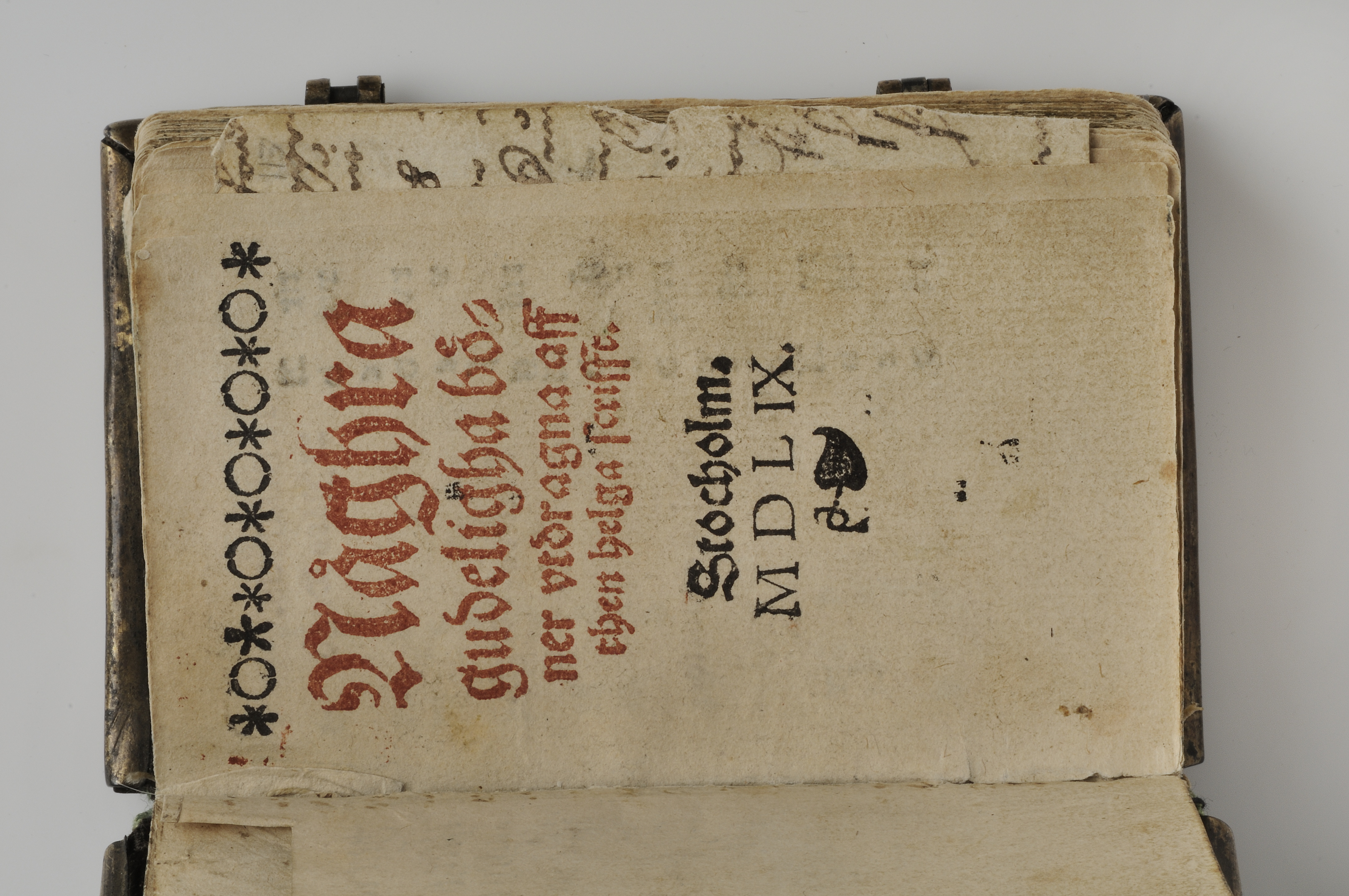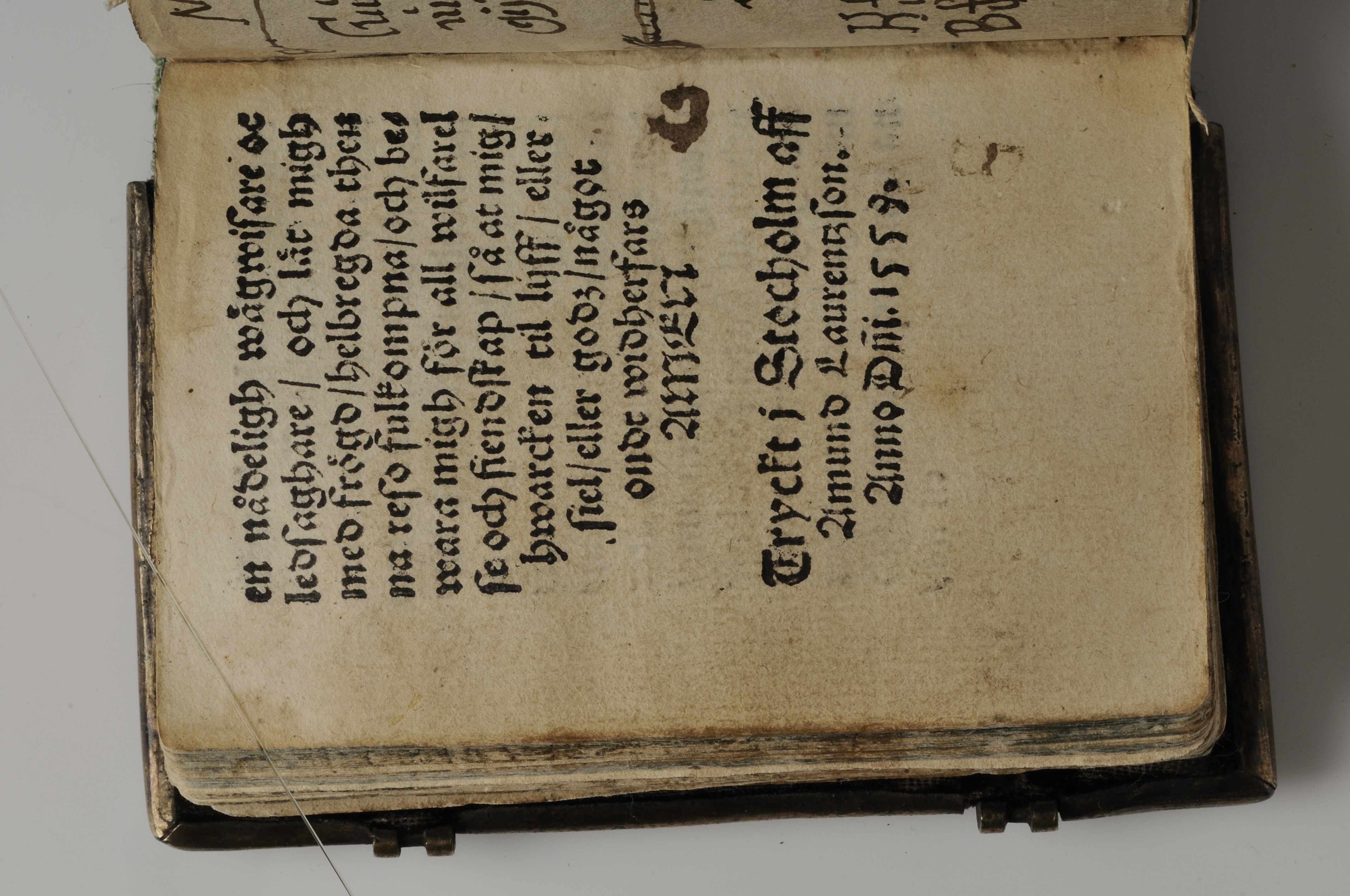 Bönbok, titel: "Någhra gudeligha böner utdragna aff then helga scrifft", tryckt hos Amund Laurentzon, Stockholm 1559.