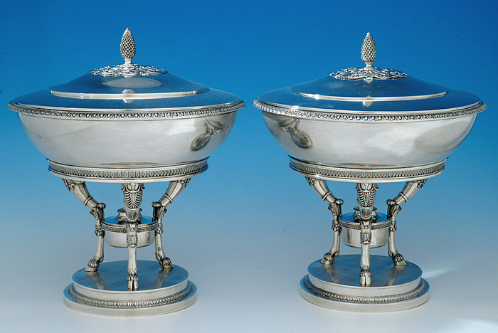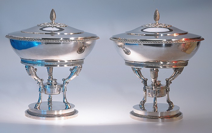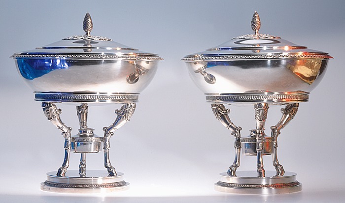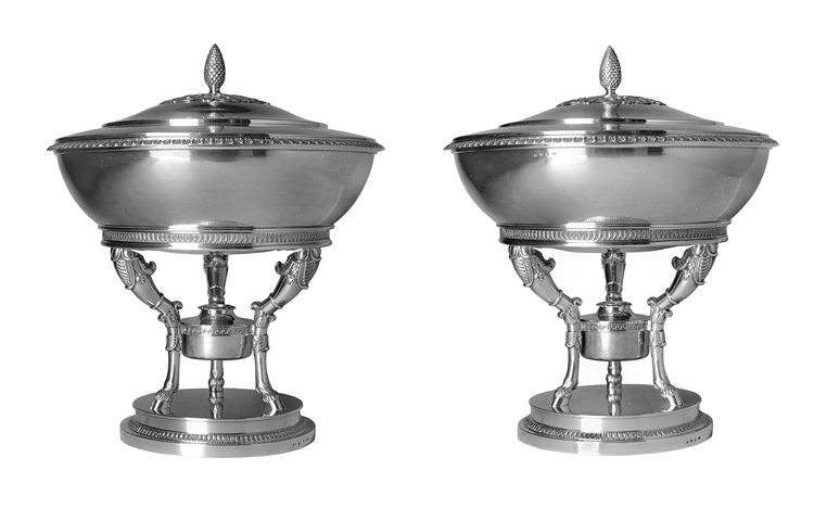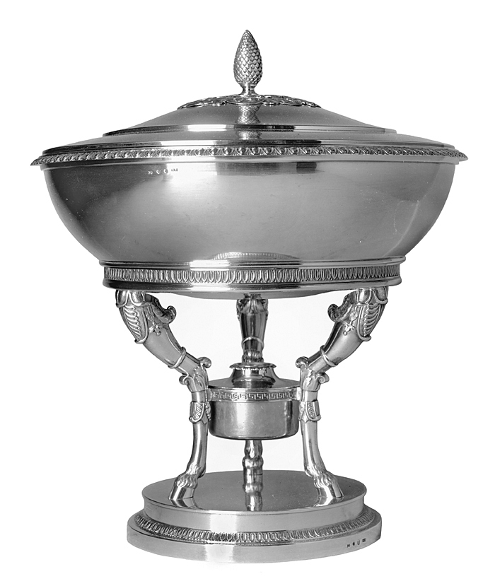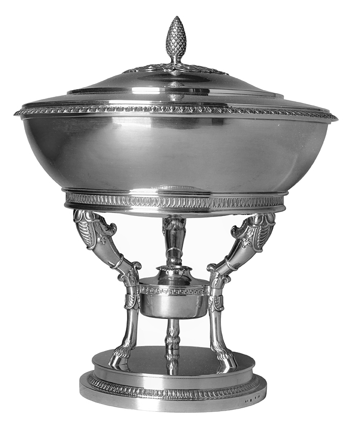 Fotställning med tillhörande réchaud (spritlampa) rund bottenplatta med tre palmettornamenterade, klövförsedda ben uppbärande en ring på vilken karotten vilar; på fotställningen och karott blad- och äggstavar samt meanderbård; profilerat lock med gjuten lockknopp i form av pinjekotte omvigen av bladornament. - " - Stand with appartenant réchaud (spirit lamp), round base plate with three palmette-ornamente, hoofed legs supporting a ring for the deep dish to stand on; on the stand and deep dish, cymantium, beand-and-reel and a meander border; profiled cover with cast finial in the form of a pine cone surrondede by foliated ornaments.