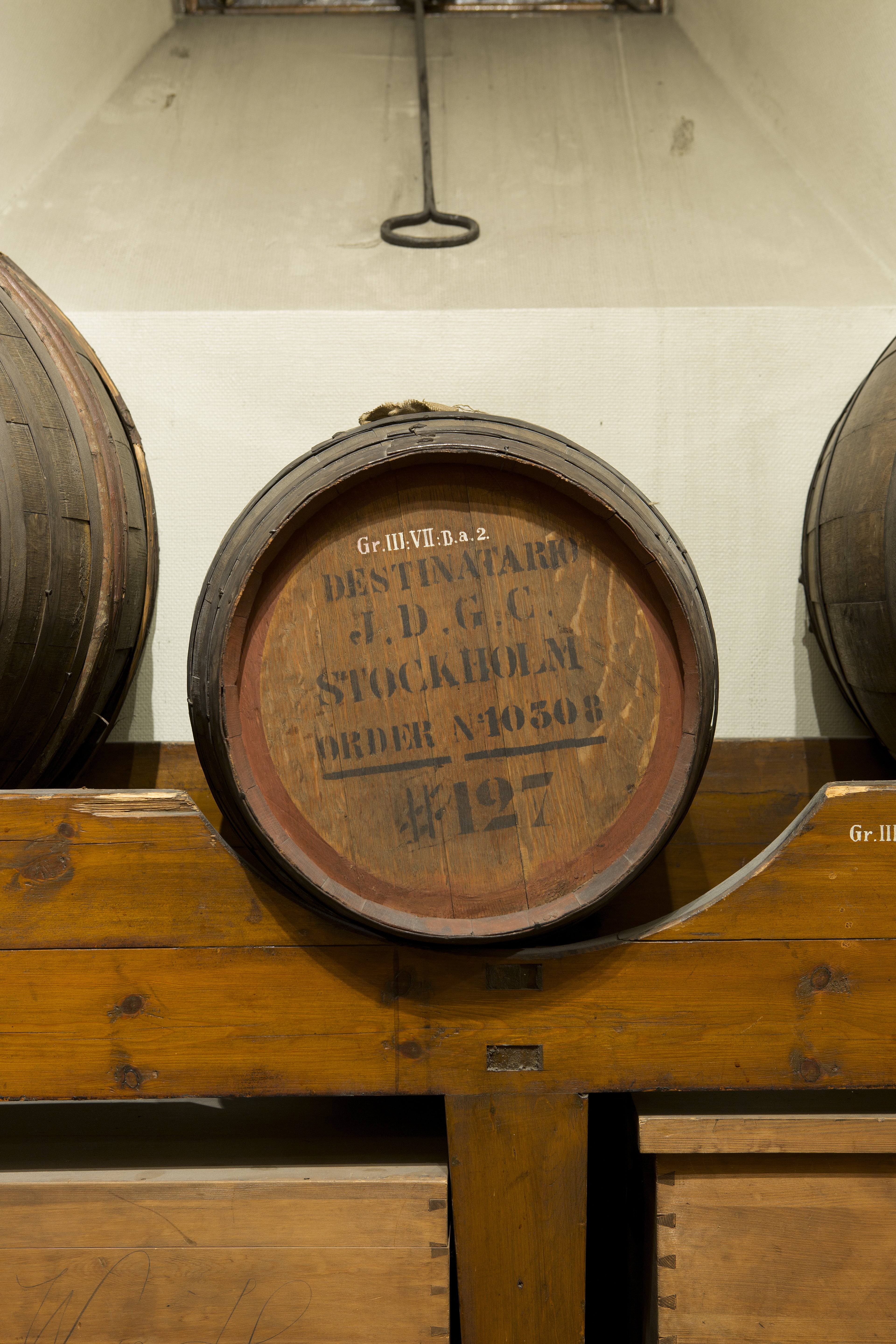 VINFAT (s. k. starkvinsfat) Av ek. Bukigt, med bottnarna insatta i stavarna medelst en i stavarna inskuren s. k. krösning. Band av järn, åtta stycken, varje hopsatt med en grov nit. På fatets botten i svart, på den ena i båge: EXP. A/B. VIN & SPRITCENTRALEN, inom bågen: TA20/P.B. 129/ l 106 / MADEIRA FINE / SUCCURSAL / MADEIRA; på motsatta bottnen: DESTINATARIO / J. D. G. C. / STOCKHOLM / ORDER N:o 10308 127; på buken ett sprund, fyllt med en träpropp jämte en tvåskaftad linnelapp som mellanlägg. Höjd: 85 cm.; Omkrets: 160 cm. Inköpt av Wilhelmina von Hallwyl den 5 November 1929, hos Aktiebolaget J. D. Grönstedt & Co., Stockholm.