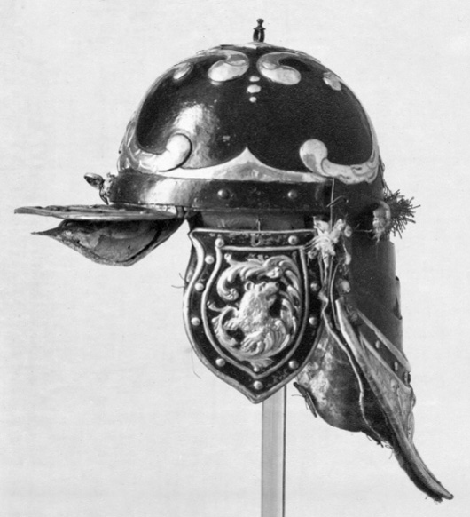 1 do (jernhufva) öfverdragen med koppar, svartmålad, med drifna ornamenter, förgyllda, pann- och nackskärm, spetsiga, den sednare i fem delar med fastnitad guldfrans, öronlappar, hvars ornamenter utgöras af framdelarne af lejon, genombruten hylsa och skruf af messing för visirstången, öfverst på hufvan en jernögla - invändigt är hufvan stoppad och klädd med blått sammet. Tid. inv. nr.: 2681