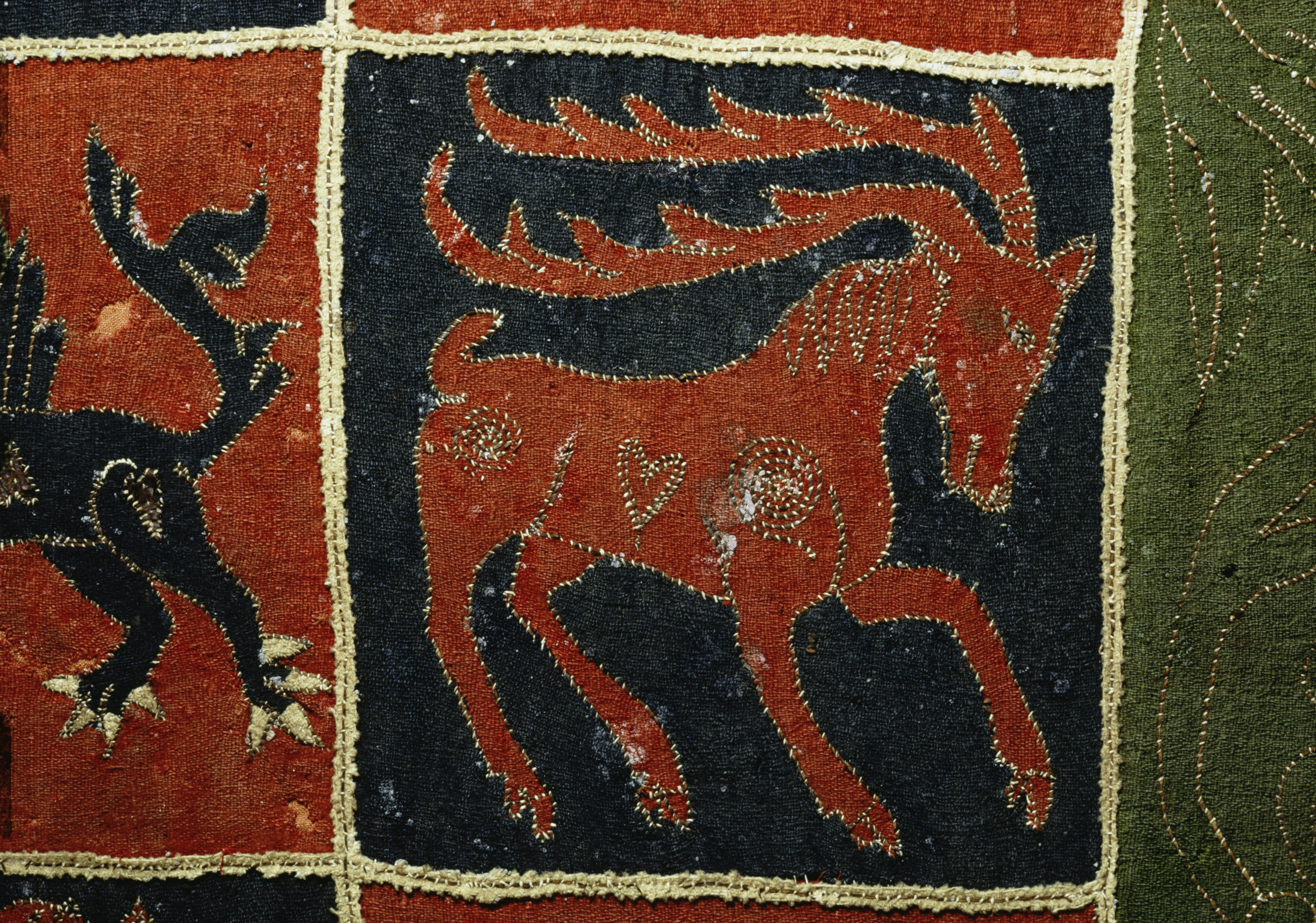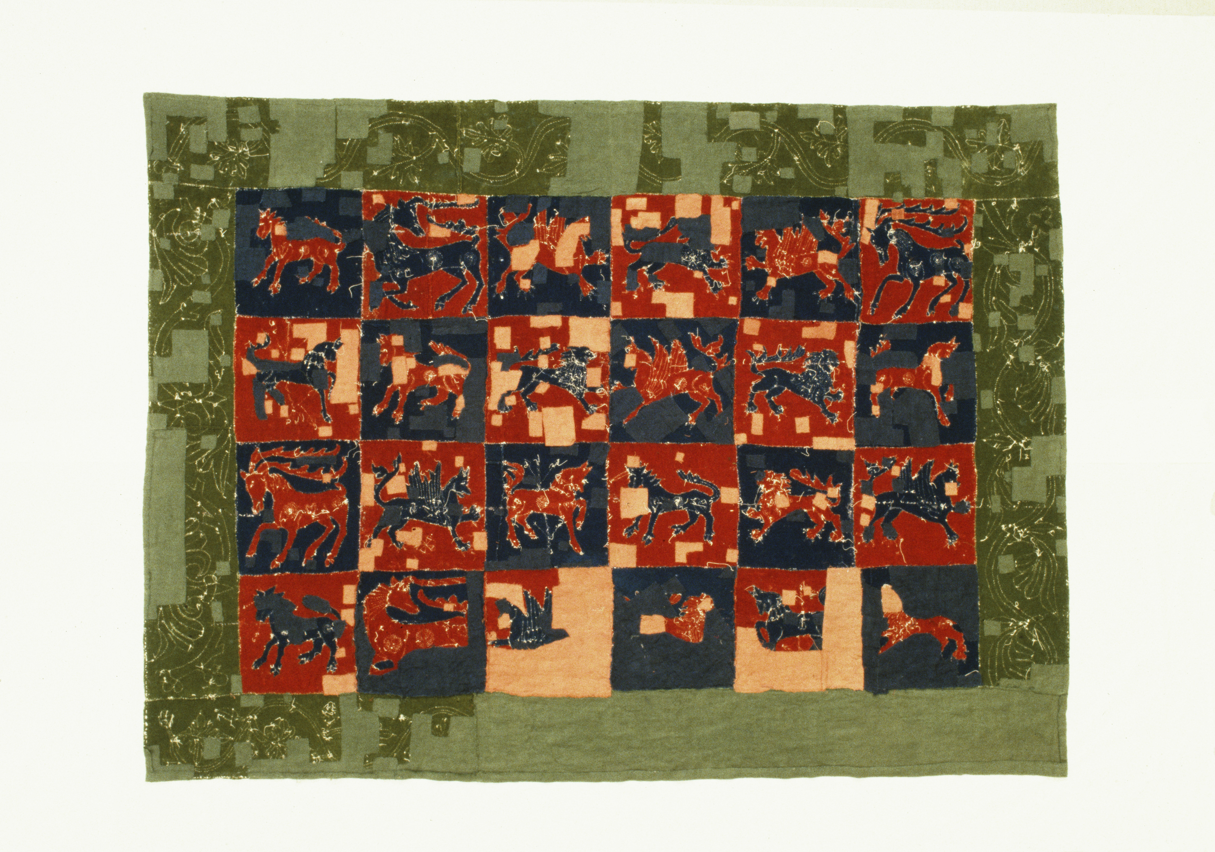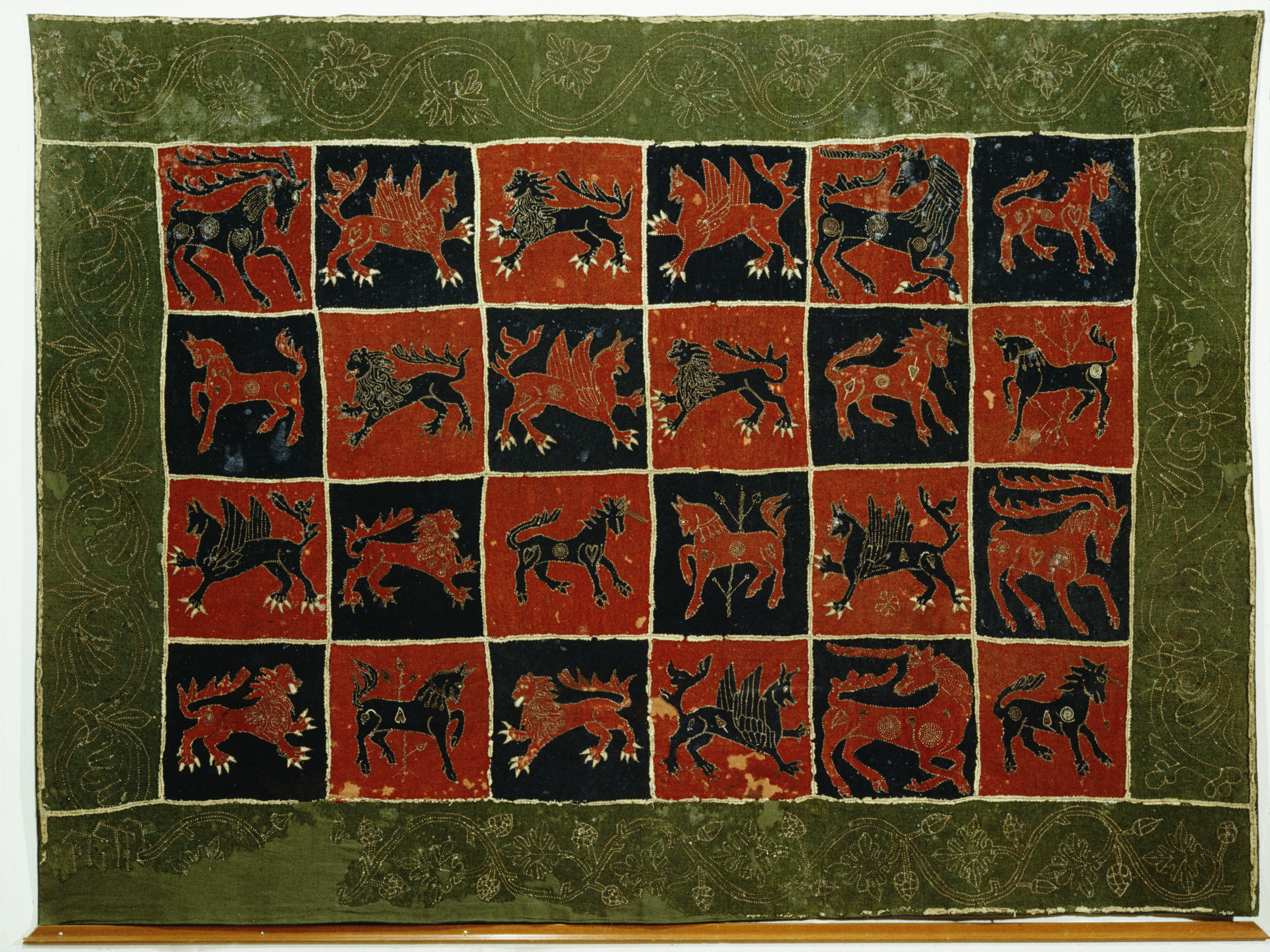 Blått, rött, grön vadmal. Intarsiabroderi. Djurmotiv. Svenskt arbete. Samt prover och bitar av äldre konserveringsmaterial. Gåva 1868. (Utställd 1997) Om man tar sig lite tid går det att hitta figurerna som har bytt plats med varandra i de röda och blå rutorna i täcket som är från 1500-talet. I de fyra olikformade bårderna tecknar guldskinnsremsor dekoren.