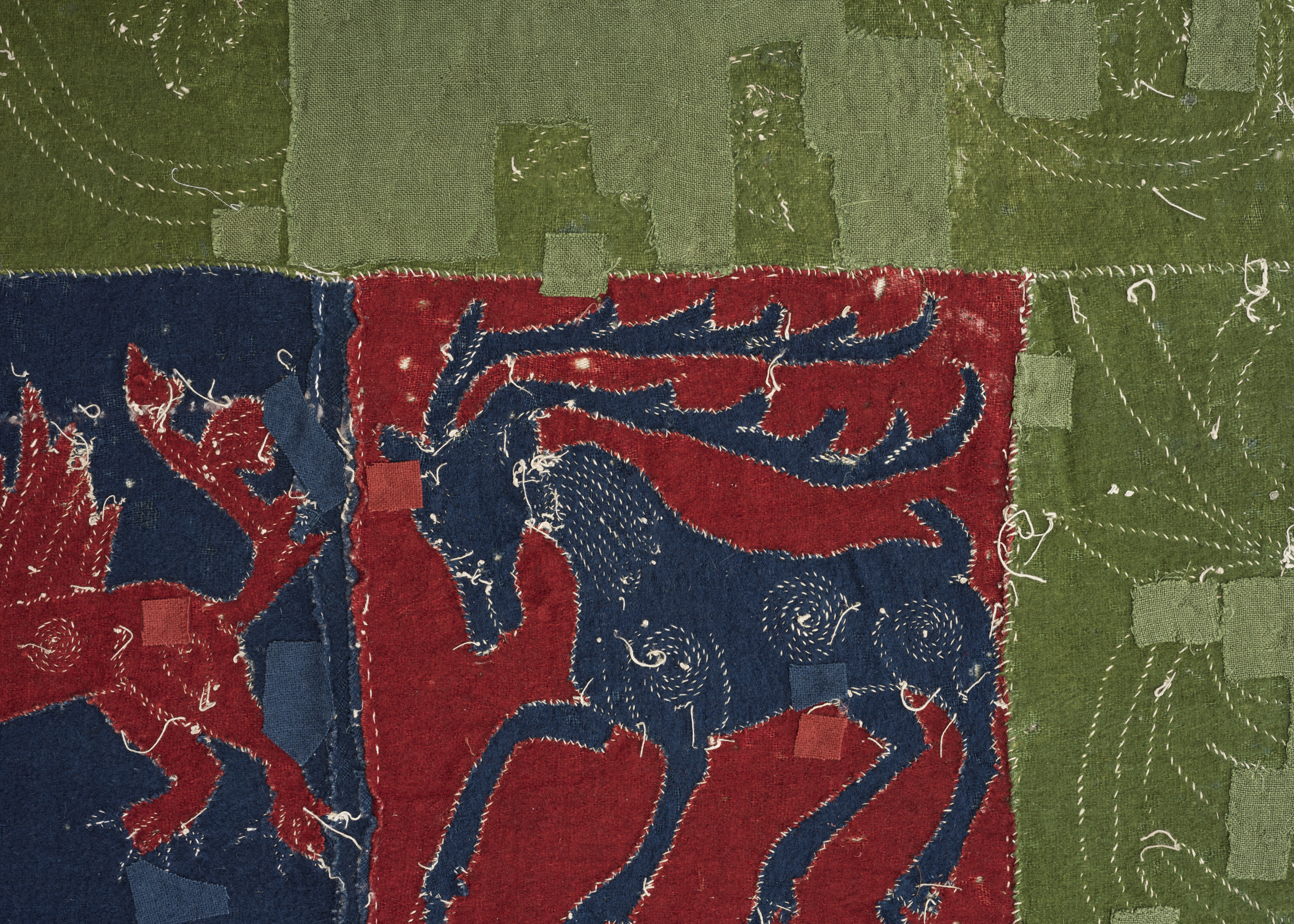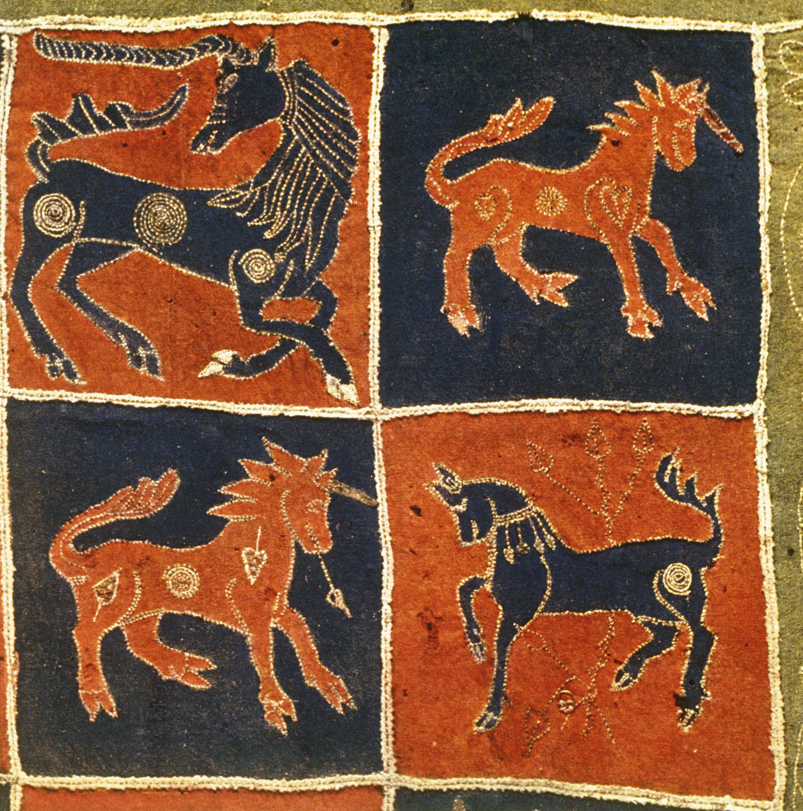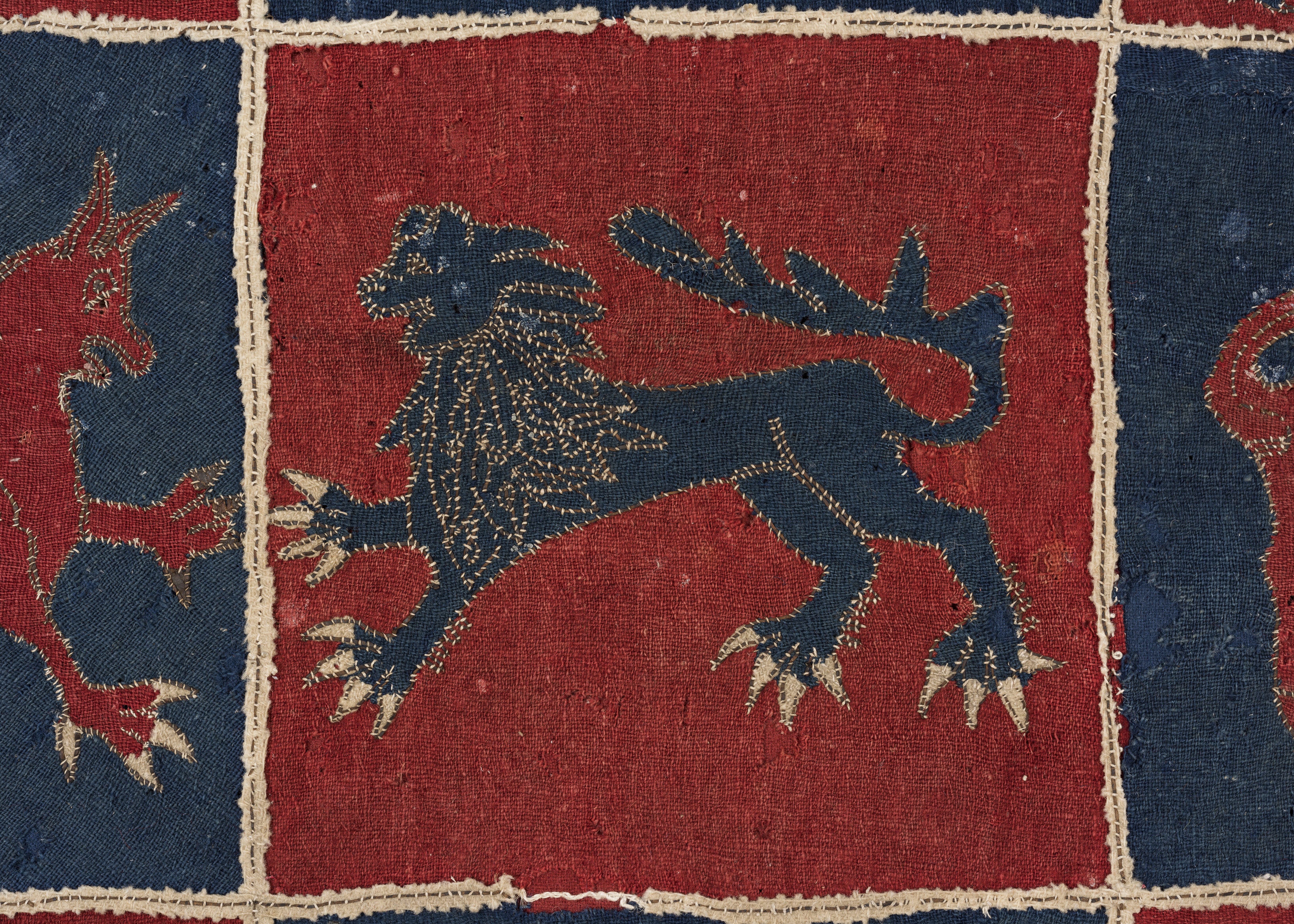 Blått, rött, grön vadmal. Intarsiabroderi. Djurmotiv. Svenskt arbete. Samt prover och bitar av äldre konserveringsmaterial. Gåva 1868. (Utställd 1997) Om man tar sig lite tid går det att hitta figurerna som har bytt plats med varandra i de röda och blå rutorna i täcket som är från 1500-talet. I de fyra olikformade bårderna tecknar guldskinnsremsor dekoren.