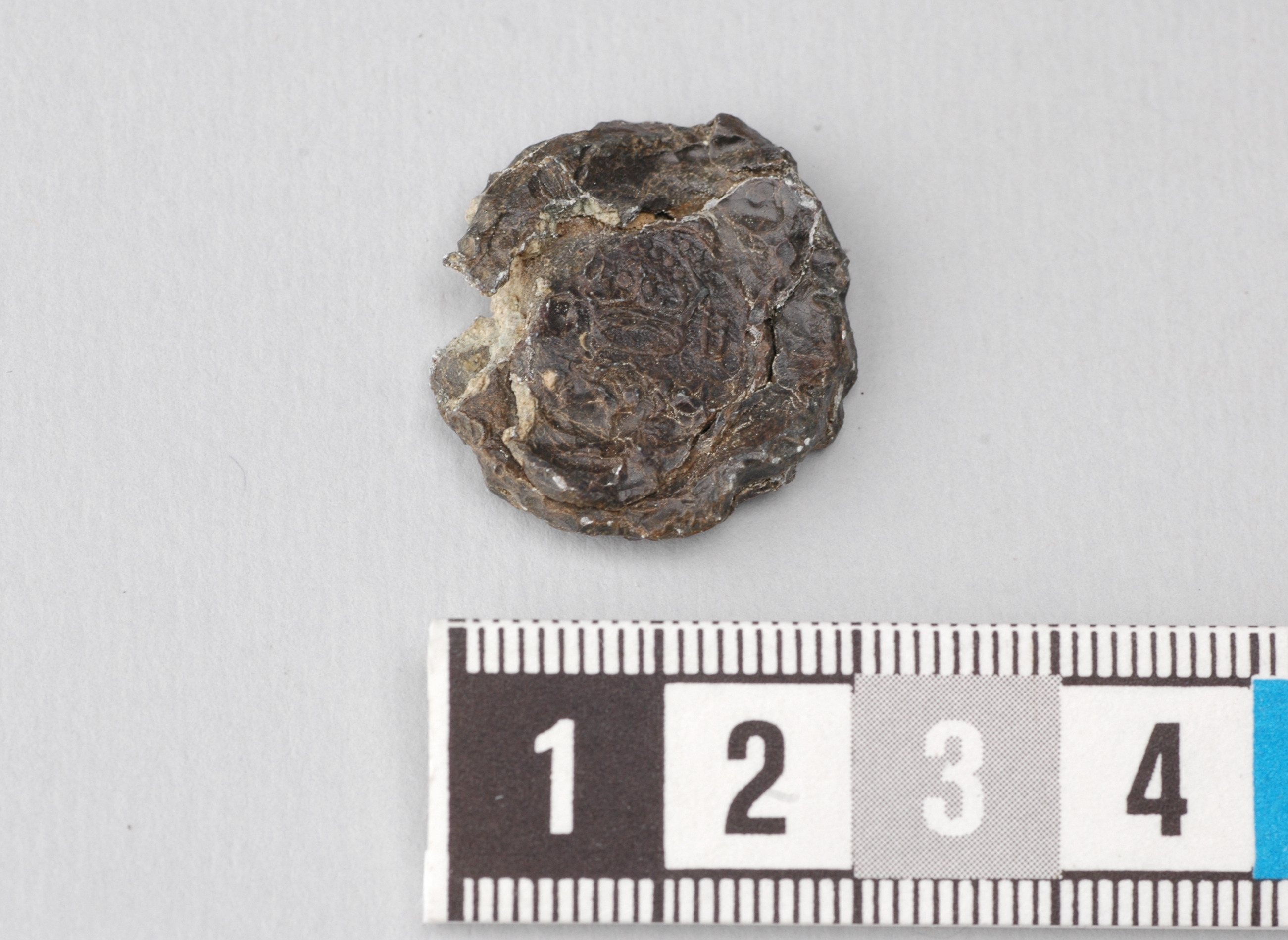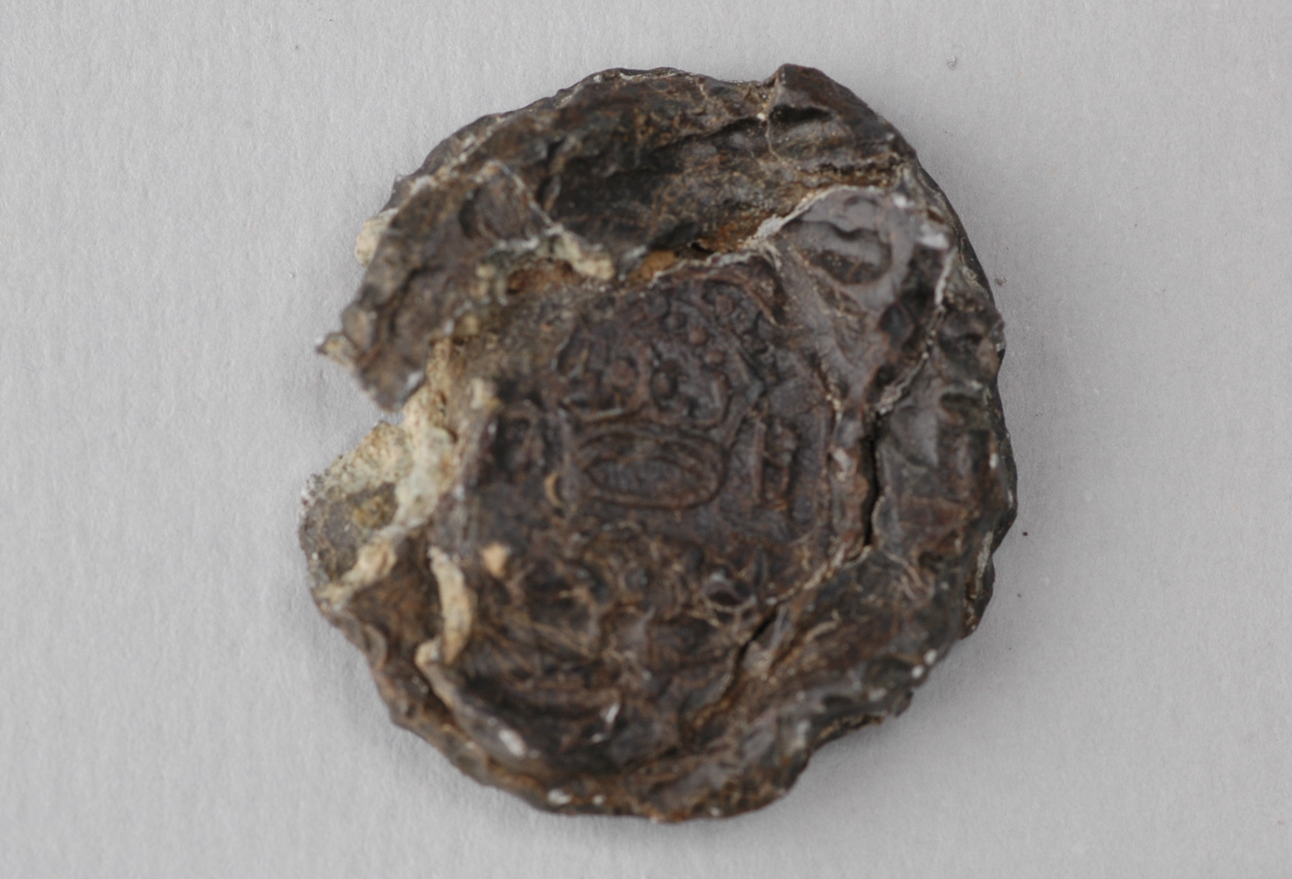ena plattan är slät, den andra framställer en krona, bokstaven "B" samt troligen årtalet 1674