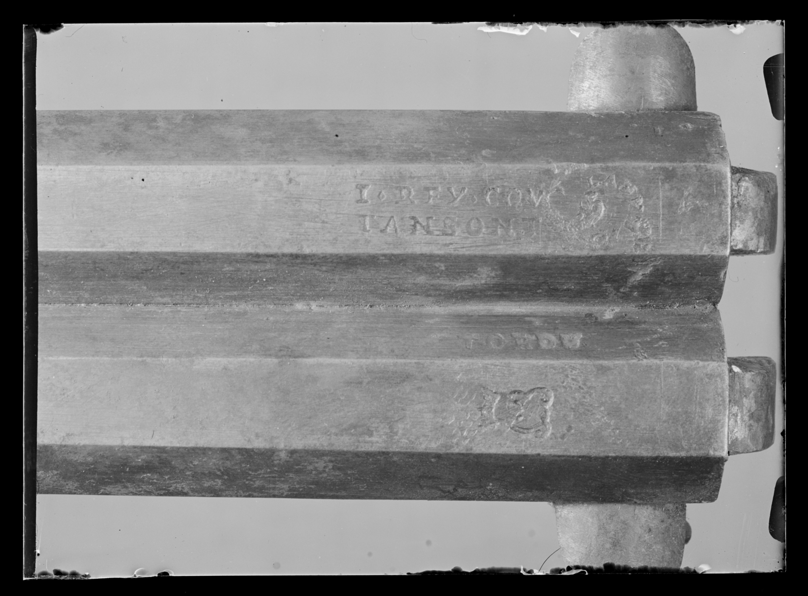 Dubbelpipa med slätborrade lopp, åttsidiga kammarstycken, på ovansidan med punsad förgylld dekor av blad, blommor och rankor, samt text: "CANONS TORDO", påslaget guld. På var sida om kammaren snäckor för tändhatt samt två baskylhakar. På kammarens undersida inslaget: "IRFY, COV, TANSONT, LAYN (?)", stämpel i form av delfin samt LE under öppen krona. En kort och två längre, släta, runda rörkor. På den kortare en oval, rörlig rembygel, överklädd med skinn. Riktmedel: Stolpkorn av silver omgivet av strålformig förgylld dekor. Fästning: Två fästen för engelska pipstift, Två slaglås av stål, det högra med vid bakre spetsen graverad oval, bladrankor och två voluter, mellan hanen och urtagningen för snäckan ett kvinnohuvud omgivet av strålar, samt framtill utmed nederkanten graverat: "CAPIOMONT". På det vänstra framtill utmed nederkanten graverat: "A STRASBOURG" i övrigt lika dekor som den på andra låset. Halvstock av valnöt med kolv av engelsk typ. Kindstöd med snidad volut samt runt svansskruvblecket och varbygelns fästen snidad enkel dekor. Beslag av brunerat stål, bakplåt med tunga på kolvhälen, på kolvens undersida oval rembygel. Bred varbygel med lång bakre arm och konturerad främre arm. Spetsrörka, rund, något profilerad vid kanterna. Tillbehör: Laddstock, 770 mm lång av trä, med skoning av horn.
