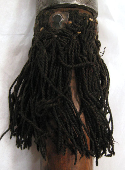 Kvast i form av enkel frans av mörkbrunt silkegarn. Fäst i stången strax under holken med sexnitar vars skallar formats troligen för att efterlikna gulmetallskållor.