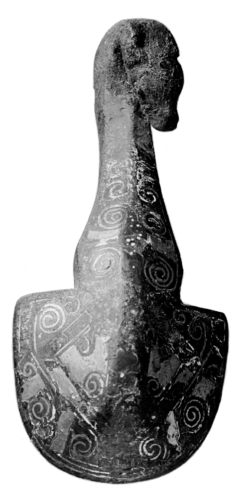 Bälthake. Kroppen med nästan halvcirkelformig omkrets, tvåfasad samt prydd med ornament i guld- och silverinläggning, bland vilka märks starktstiliserade vingar och en fågelstjärt. Den likadeles ornerade avsmalnande halsen utgår från kroppens raka kant, den omböjda delen i form av ett djurhuvud. Baksidan platt, i mitten en rund platt knapp på kort grov hals. Längd: 6,5 cm.; bredd: 2,9 cm.