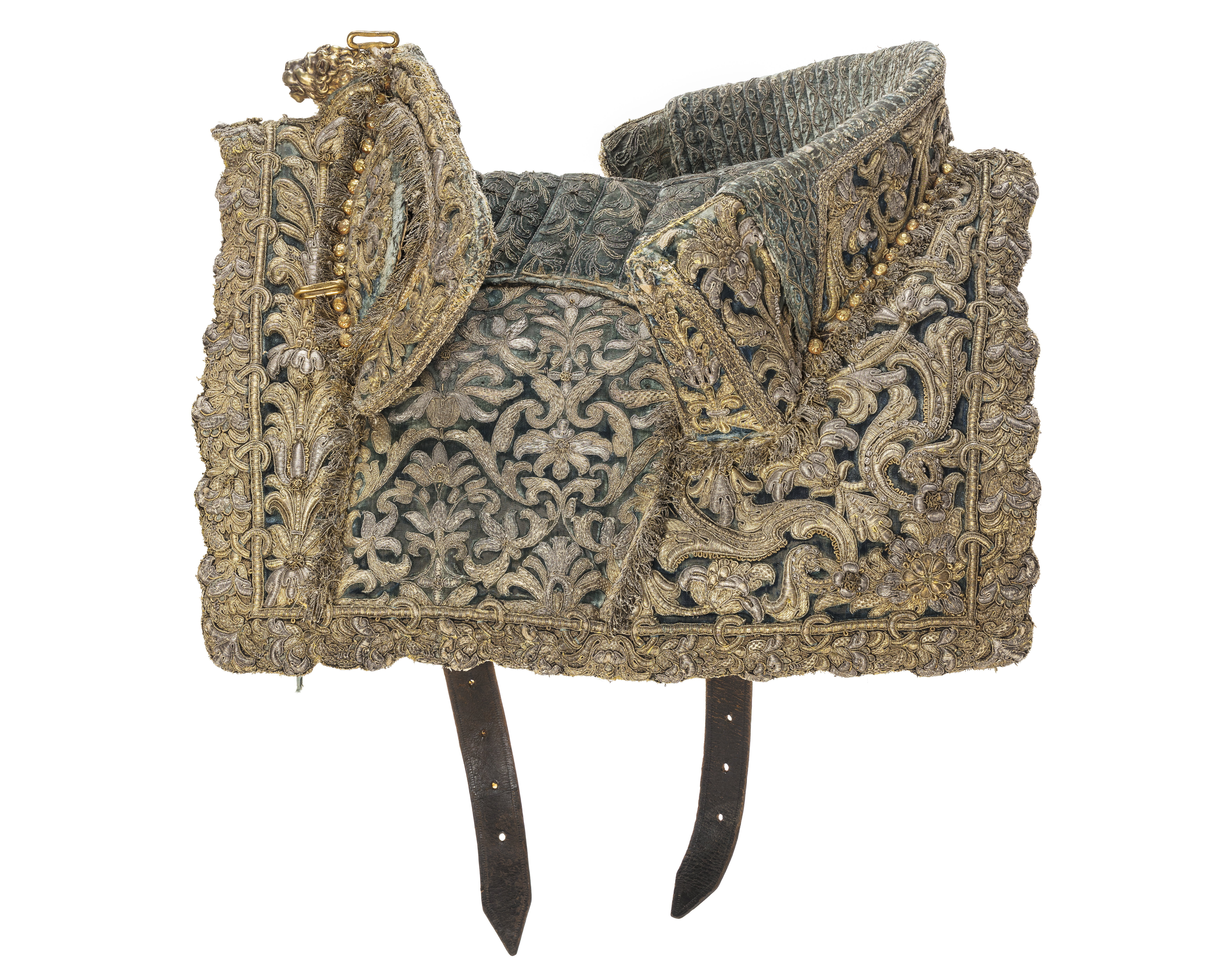Bomsadel av blå sammet med rektangulära kappor med reliefbroderi i form av rankor, blommor och stiliserade franska liljor. Broderi med guld- och silvertråd. Utmed kanterna en ca 40 mm bred bård med yttäckande broderi. Frambom ca 520 mm bred och 90 mm hög. Bakbom med små stödbommar ca 52 mm bred och 90 mm hög. Sitsen och bommarnas insidor av blå sammet med rankformiga stickningar av guldtråd. Sitsen och bommarnas utsidor kantade med guldtrådsfrans. Sadelknapp av förgyllt silver i form av lejonhuvud. Framför frambommen 14 + 9 runda, blomformiga tännlikor av förgylld mässing. Bakom bakbommen 12 + 14 tännlikor av samma material. Bom överklädd med tunt läder. Bossor av tunt ljusbrunt läder och naturfärgat linne, kantning av ljusblått linneband. På var sida två stroppar för sadelgjord samt krampa för stigläder. Baktill två öglor av vitt läder samt ögla av läder för svansrem. Framtill två söljor av stål för förbygel. Framför frambommen två krampor av förgylld mässing för pistolhölster. Sadeln märkt på bakre vänstra delen av bommen " No 2 Le Plaie ". Första gången omnämnd i Archives du Ministère des Affaires Etrangères, Paris: Recueil des presents faits par le Roy… depuis l’année 1662 jusqu’à… 1727.