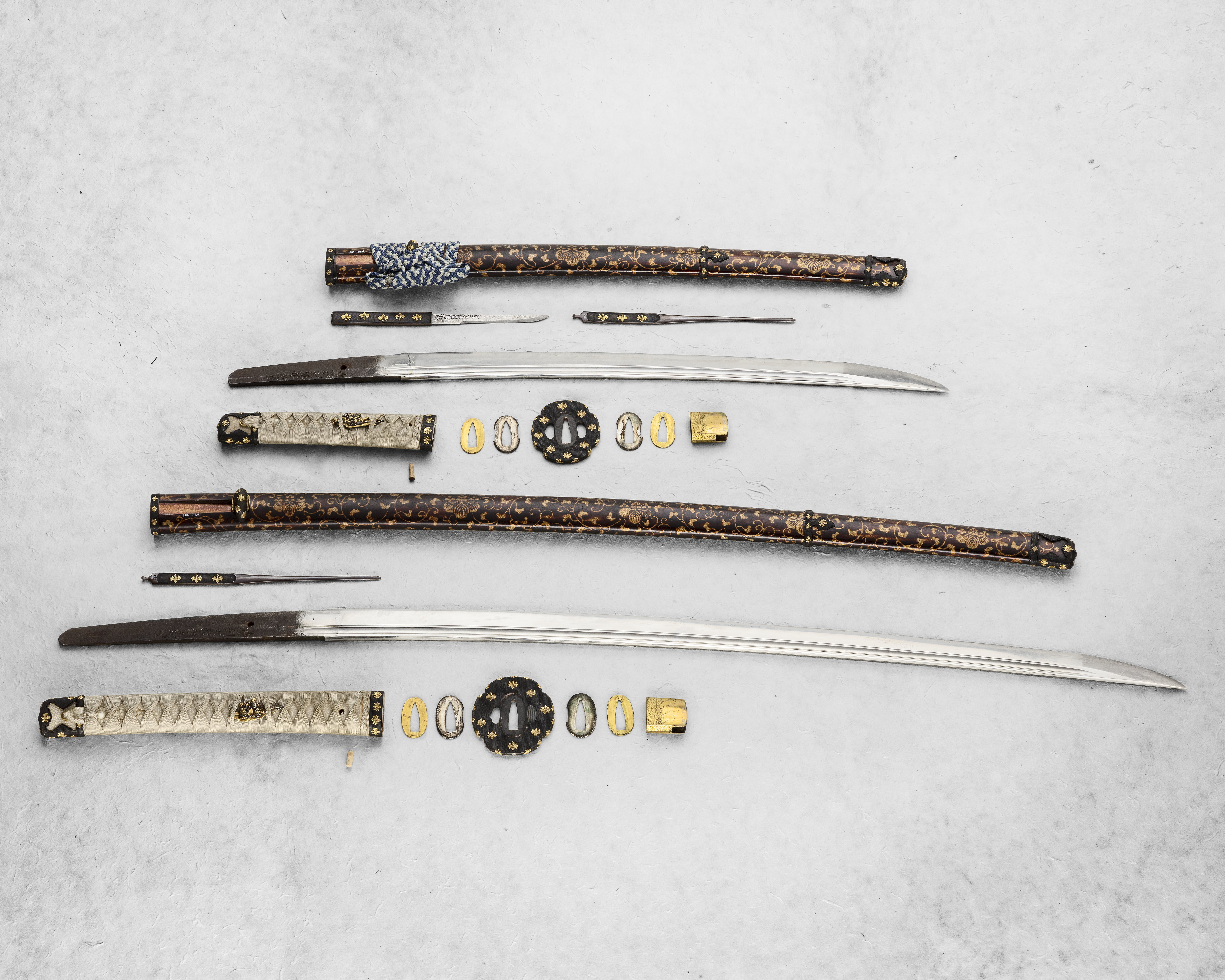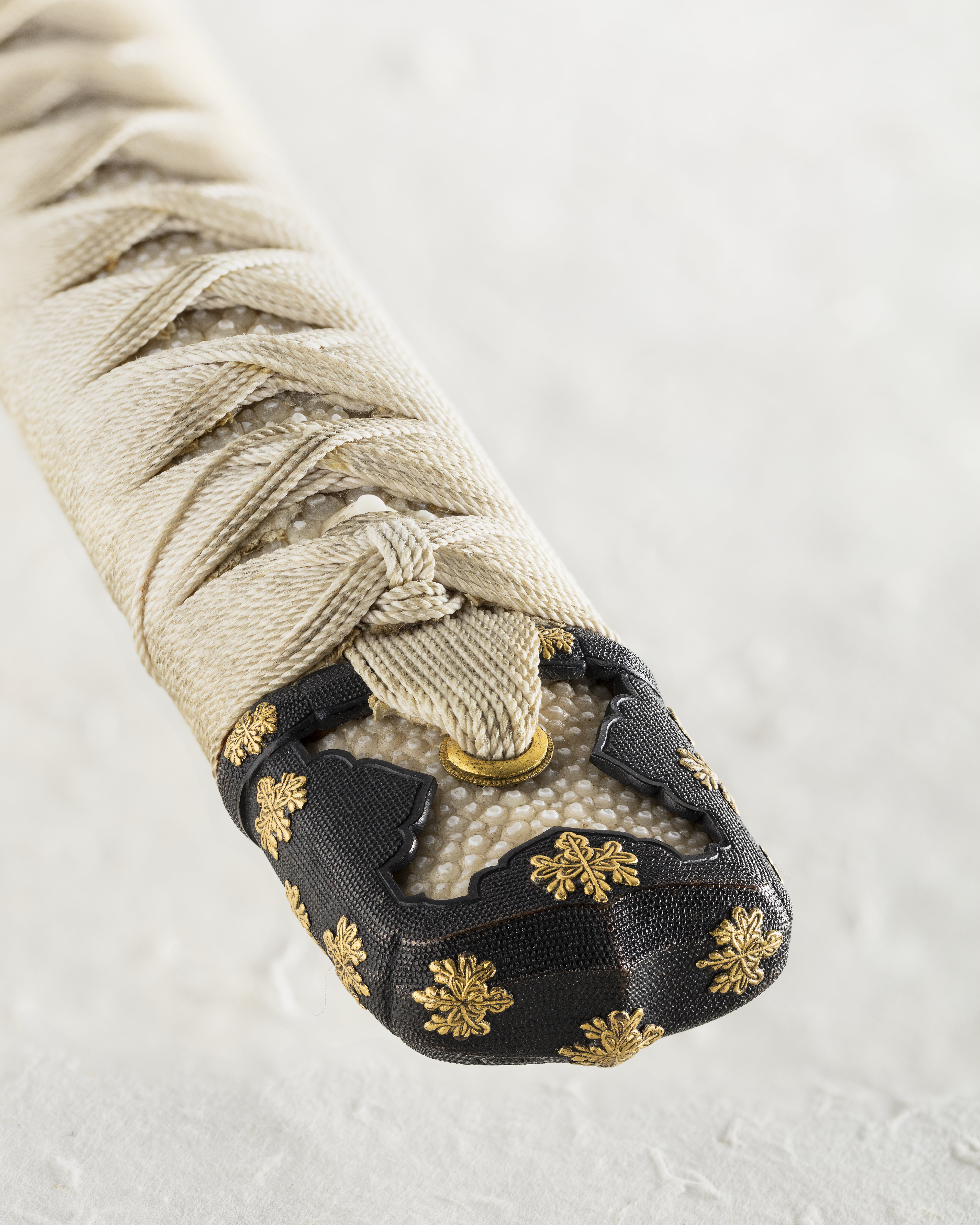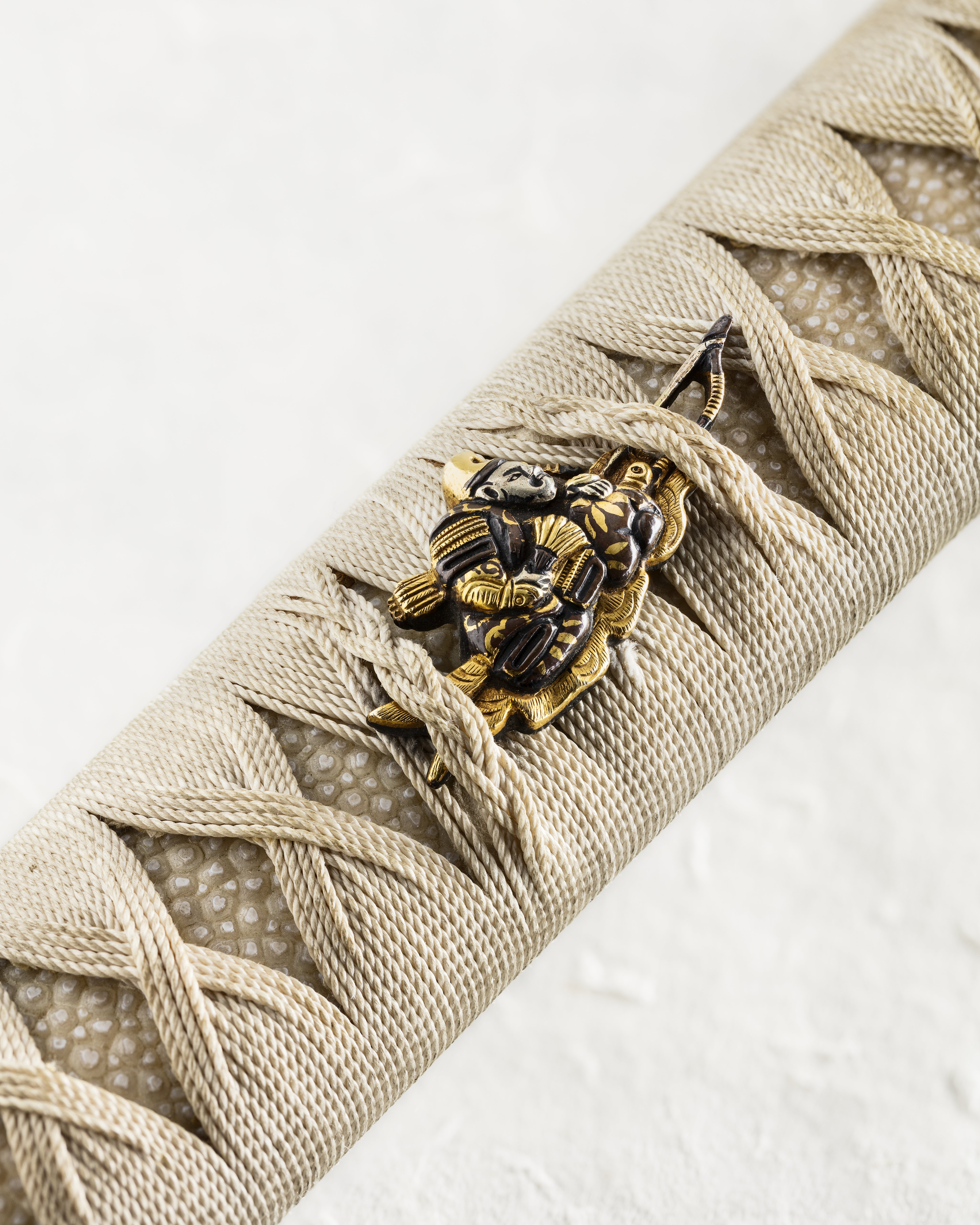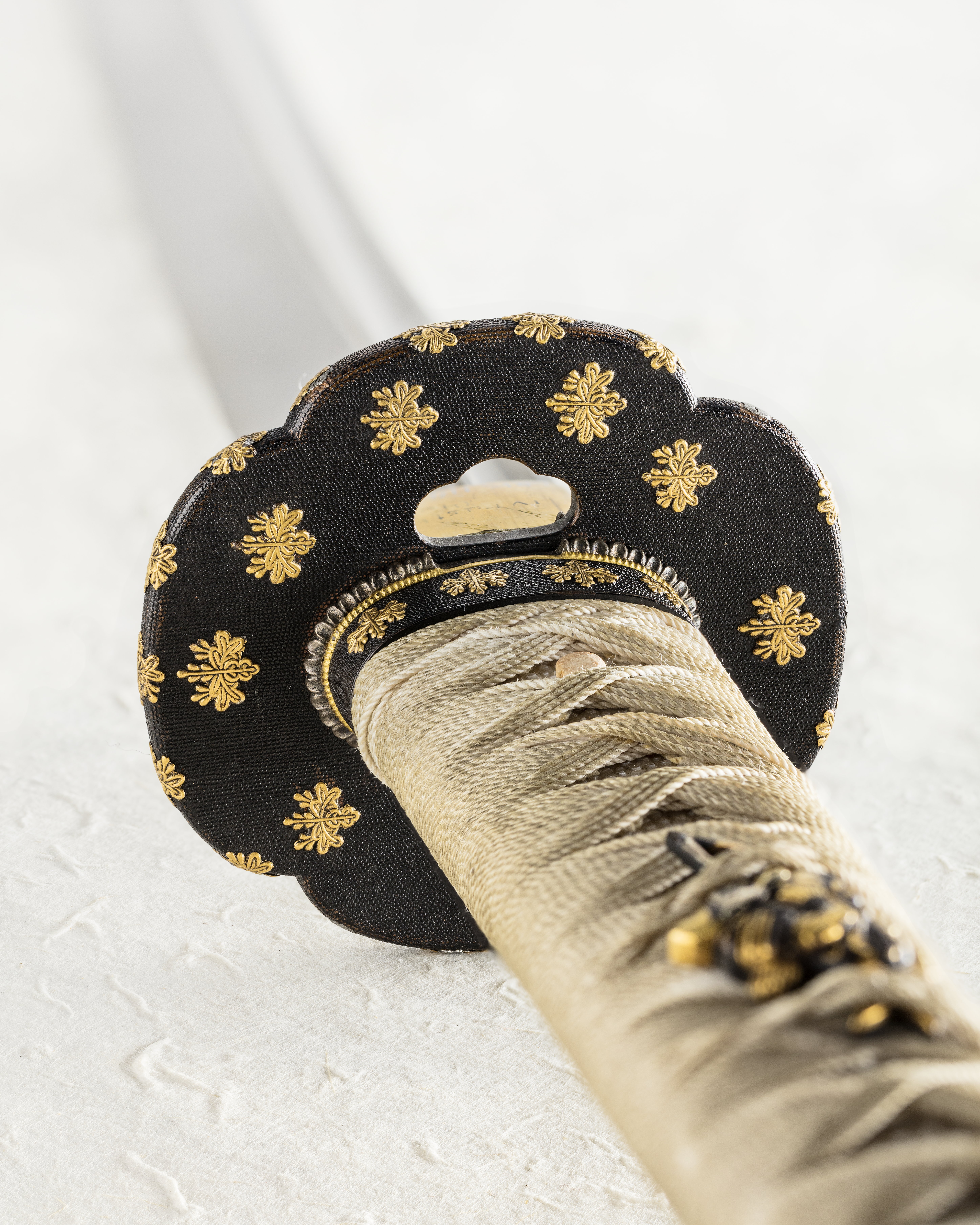 Upptill på fästet ett påträtt beslag (KABUTOGANE), genombrutet på ut- och insidan, av mörkanlöpt koppar med påslagna ornament i form av blommor av guld. Fästet i sin helhet klätt med vitt rockaskinn, däröver lindning av ljust, tvinnat silkegarn, på vardera sidan ett löst ornament av mörkanlöpt och förgylld koppar (MENUKI), inträtt i lindningen, föreställande en japansk krigare i rustning. Nedtill ringformigt beslag (FUCHI). Kaveln fäst vid tången med ett trästift. Parerplåt (TSUBA), ovalt fyrpassformig, av mörkanlöpt koppar med påslagna blomornament av guld. På tsubans ovan- och undersida dubbla plattor, en större och en mindre (KO-SEPPA och SASARA-SEPPA). Den förra av försilvrad koppar, den senare av förgylld mässing. Klinga böjd, eneggad med vinkelformig rygg. Utmed ryggsidan på båda sidor en djup hålkäl. Vid basen påträtt ett beslag av förgylld koppar. På tångens ena sida japanska skrivtecken. Montering av handashi-typ (halv tashi). Ändbeslaget på kaveln samt beslagen på den tillhörande baljan antyder detta. Deponerat på Etnografiska museet. EM 1889.04.1483