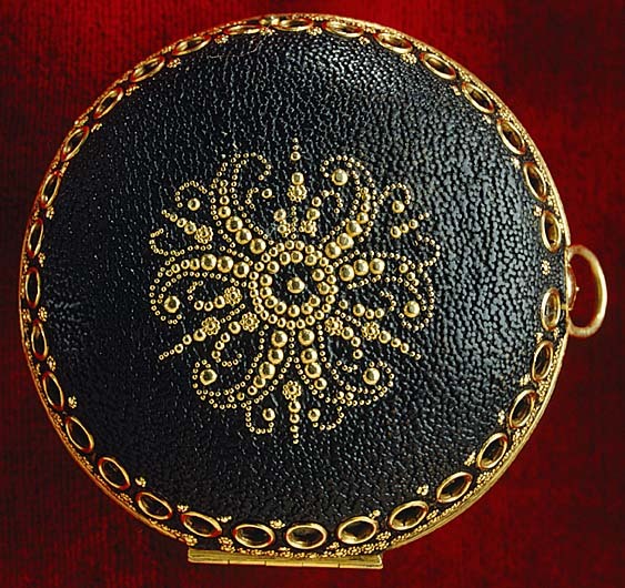 Urfoder av mässing, utvändigt klätt med svart chagrin med dekor i guldpiké. Tättslutande lockring med öppning för urtavlan, d: 46 mm. Locket fäst med gångjärn till v. Kantskoning på lock och underdel av mässing med urtag för bärringens skaft. Lock och underdel genombrutna av vardera 30 runda, guldskodda hål, d: ca 2,5 mm, ordnade i ring längs lockets och underdelens övre kant. Mitt på underdelens undersida blomformigt ornament i guldpiké. Underdelen invändigt fodrad med blekrött siden, därpå fäst pappersetikett med firmatryck från urmakarmästaren Jan Fredman (1712-1767), Stockholm. På etiketten skrivet med brunt bläck: 175.