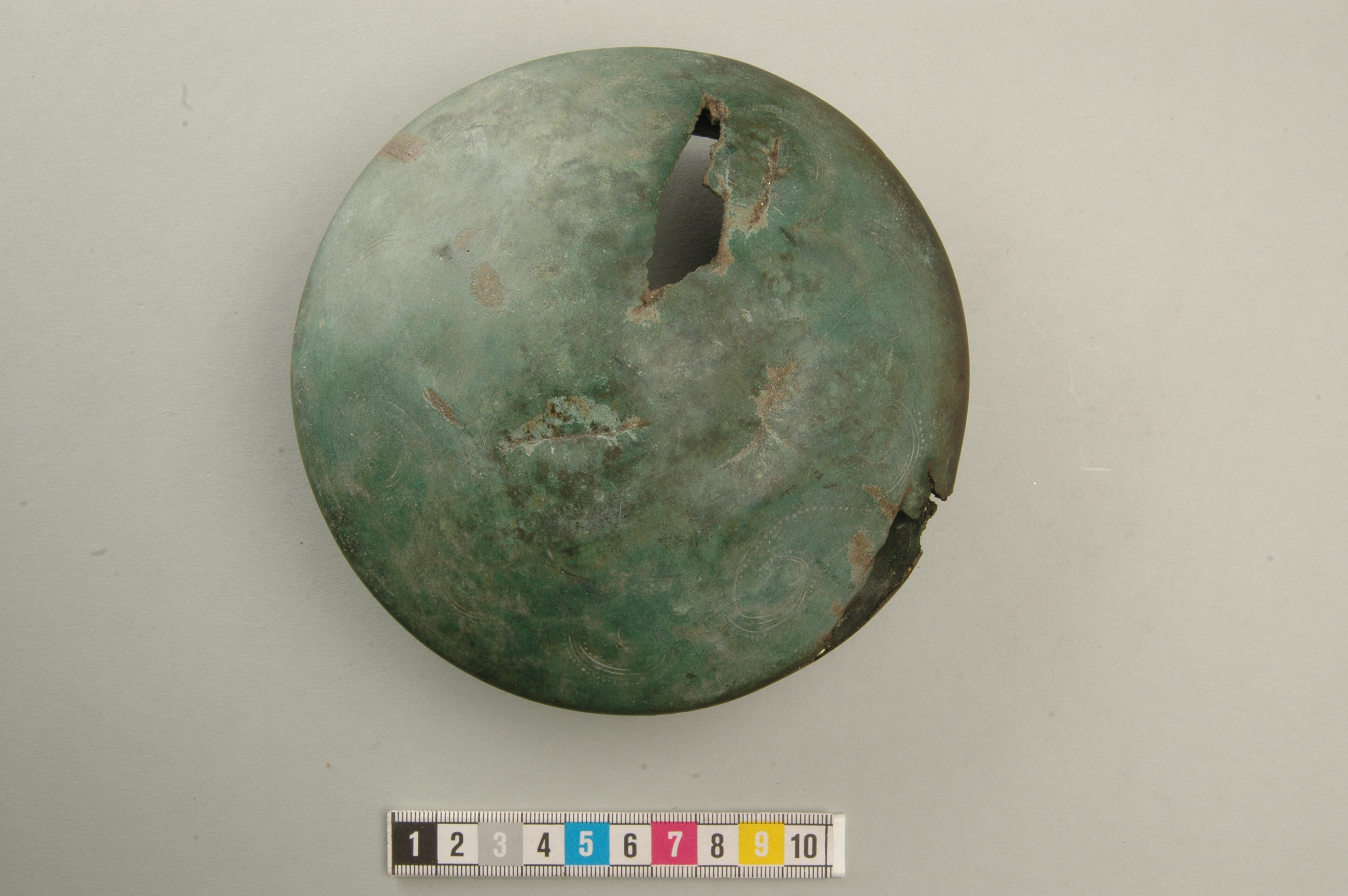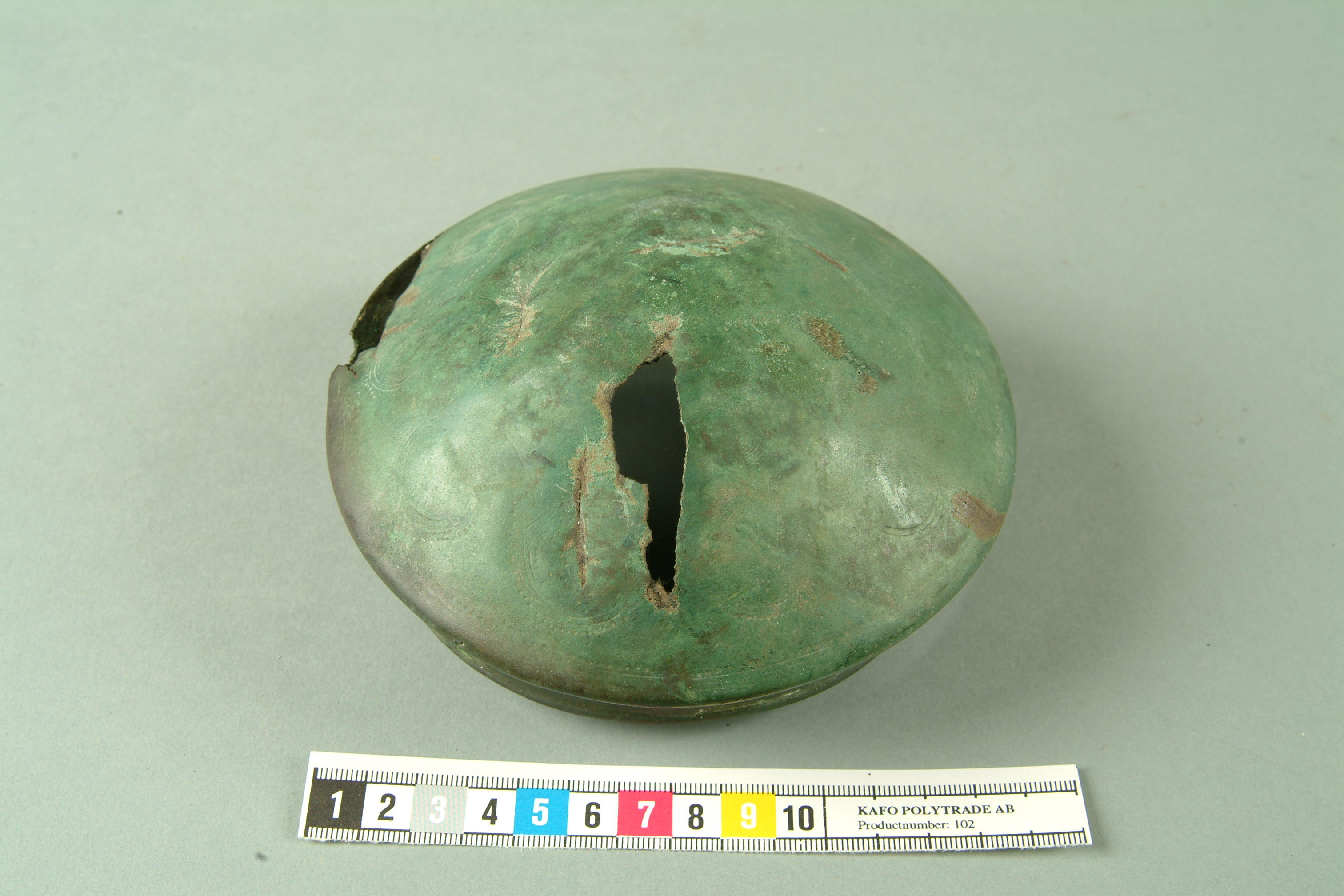 Bälteskål av brons, botten med inpunsad ornering grovt utförd. Ytan och även öron starkt nötta,skadat i senare tid.