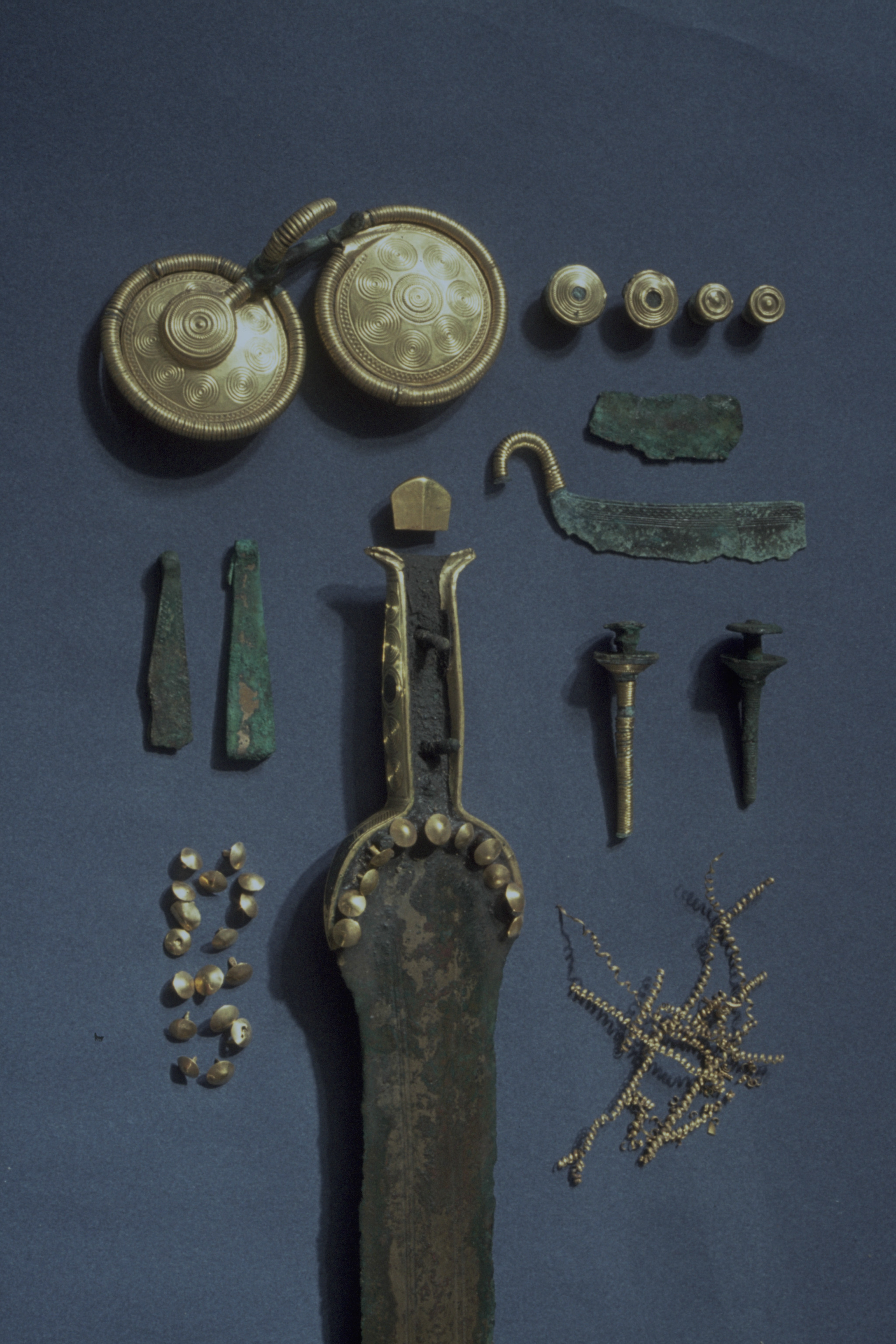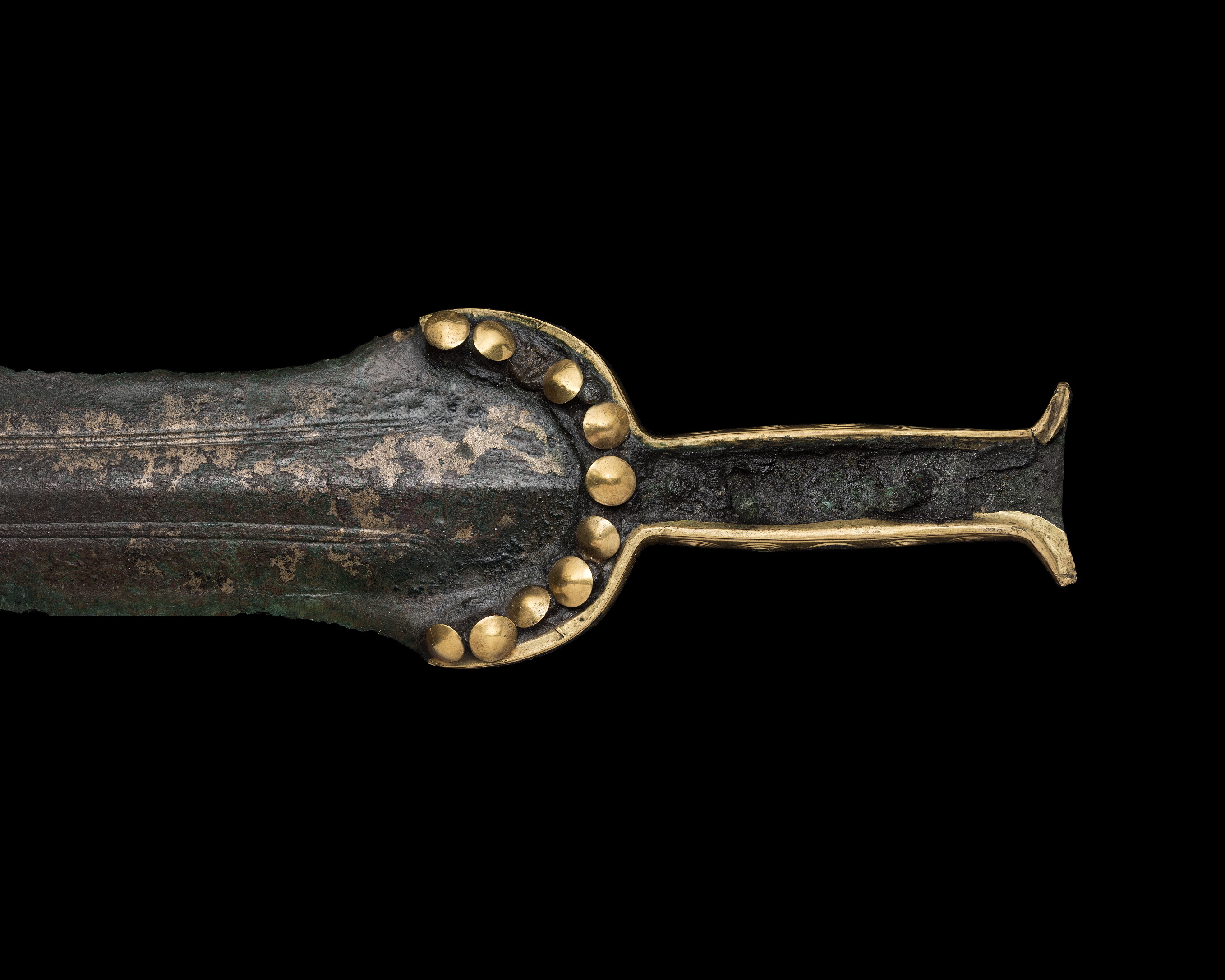 Bronssvärd med guldbelagda fästekanter. M per IV. Funnen i ekkista i hög.