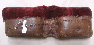 Rektangulär puta av brunt skinn, stoppad med någon sorts hår eller päls, ull?. Ostoppad mittdel, bredd: 55 mm. Skarv med grov söm snett över ena sidan. Övre del klädd med röd sammet, vikt över kanten, total bredd: 110 mm. Sammeten enkelt fasttråcklad med ljust snöre. På ena sidan två liggande skåror, en i varje ytterkant på båda stoppade delarna, högra skårans längd: 80 mm, vänstra skårans längd: 70 mm. Båda skårorna har två hål ovanför och två nedanför, hålen mäter i diameter: mellan 6 och 10 mm. En kort stump av en skinnrem sticker upp ur hålet längst till höger, under skåran. Remmens bredd: 5 mm. På andra sidan två fördjupningar i de stoppade delarnas mitt. Fördjupningarna har dessutom två hål på var sida med istuckna läderremmar, bredd: 5 mm.