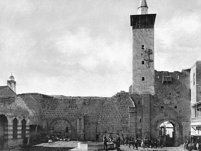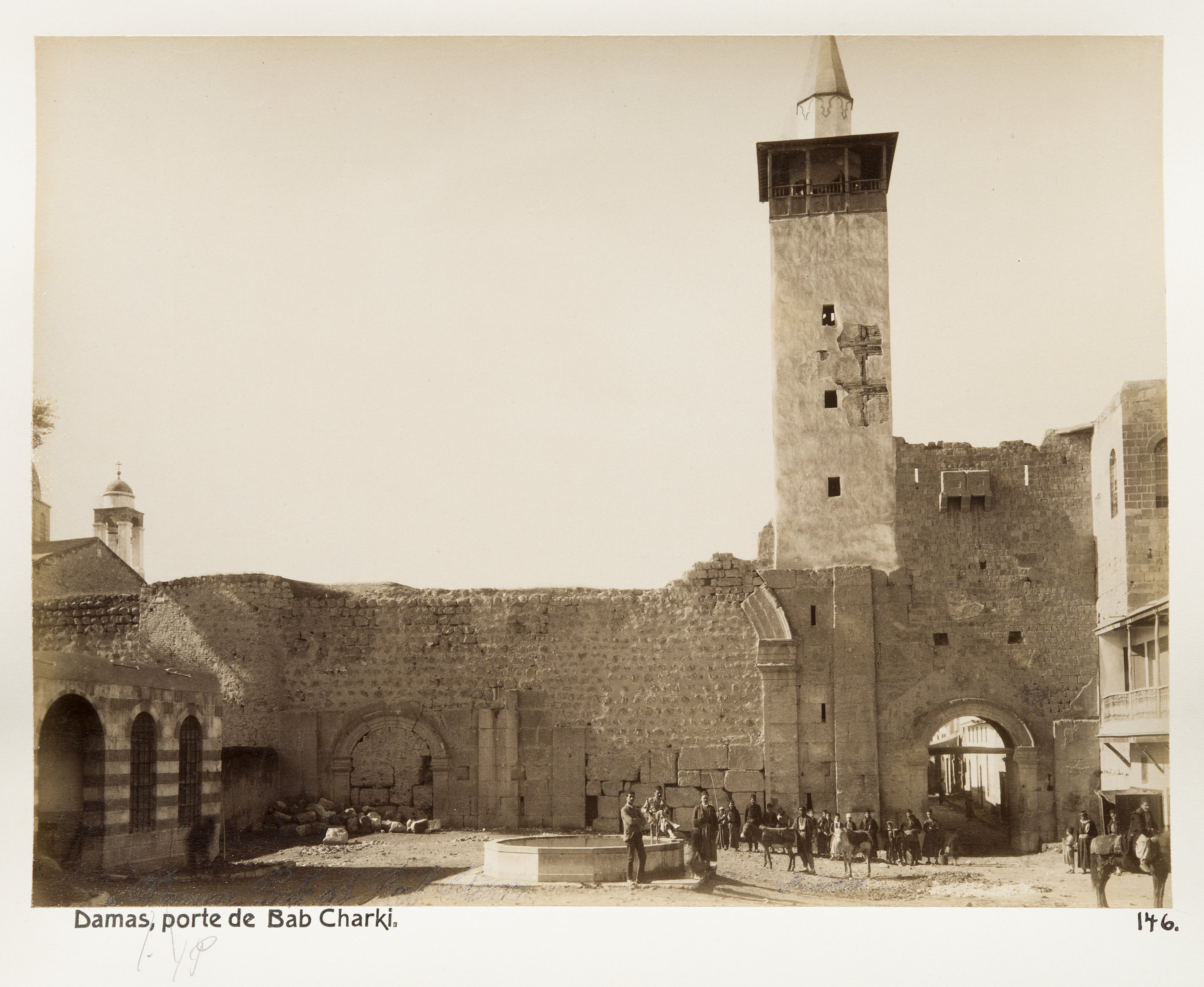 Bab Charki-porten i Damaskus. Text på originalet: "Damas, porte de Bab Charki." Fotografierna LXVI:N.01.-180. kommer från resan till Palestina och Syrien som Wilhelmina och Walther von Hallwyl gjorde den 30 mars-27 april 1901. De lämnade Sverige den 5 november 1900 för Egypten, där de stannade till den 28 mars 1901, då de fortsatte till Palestina. Med på resan var Wilhelminas sällskapsdam, fröken Ida Uhse. Den 27 april fortsatte de till Turkiet och Mindre Asien. De mindre fotografierna (utom de från Samos) LXVI:N.90.-100. är tagna av Wilhelmina själv, under en resa till häst från Jerusalem till Damaskus 8-20 april 1901. Övriga fotografier är inköpta av Wilhelmina i Jerusalem, Damaskus och Beirut. Alla uppgifter kommer från Ida Uhses reseanteckningar.