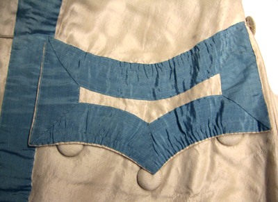 Rock av vitt kyprat siden, garnerad med blå sidenband. Rocken är kraglös, smal upptill och från midjan och ned är den utställd. Långa ärmar med uppvikta slag av blå taft med två band av vitt siden, b. 107 mm. Rocken har en knäppning mitt fram, ursprungligen bestående av tio knappar, nu bortsprättade. Upptill i kanten på vardera framstycke sitterpåsytt två hakar och hyskor av metall. På vardera framstycke sitter en horisontellt iskuren ficka med påsydda, spetsflikade ficklock, garnerade med blå sidenband. Nedanför vänster fickas lock sitter påsytt tre knappar, klädda med vitt siden. Fickorna är på insidan fodrade med vitt linne. Från midjan och ned har rockens vidd i sidorna samlats i veck. Det mittersta vecket som utgår från sidsömmen är upptill och nedtill igenknäppt med en klädd knapp. Rocken har ett sprund mitt bak, garnerat med blå sidenband. Rocken är på insidan fodrad med vit linnelärft. På fodret märkt med bläck: "B No 11". Rocken är tillsammans med gnr 17/46-17/192 en gåva av H.M Konungen (Gustaf V) genom chefen för Kungl. Husgerådskammaren 1917.