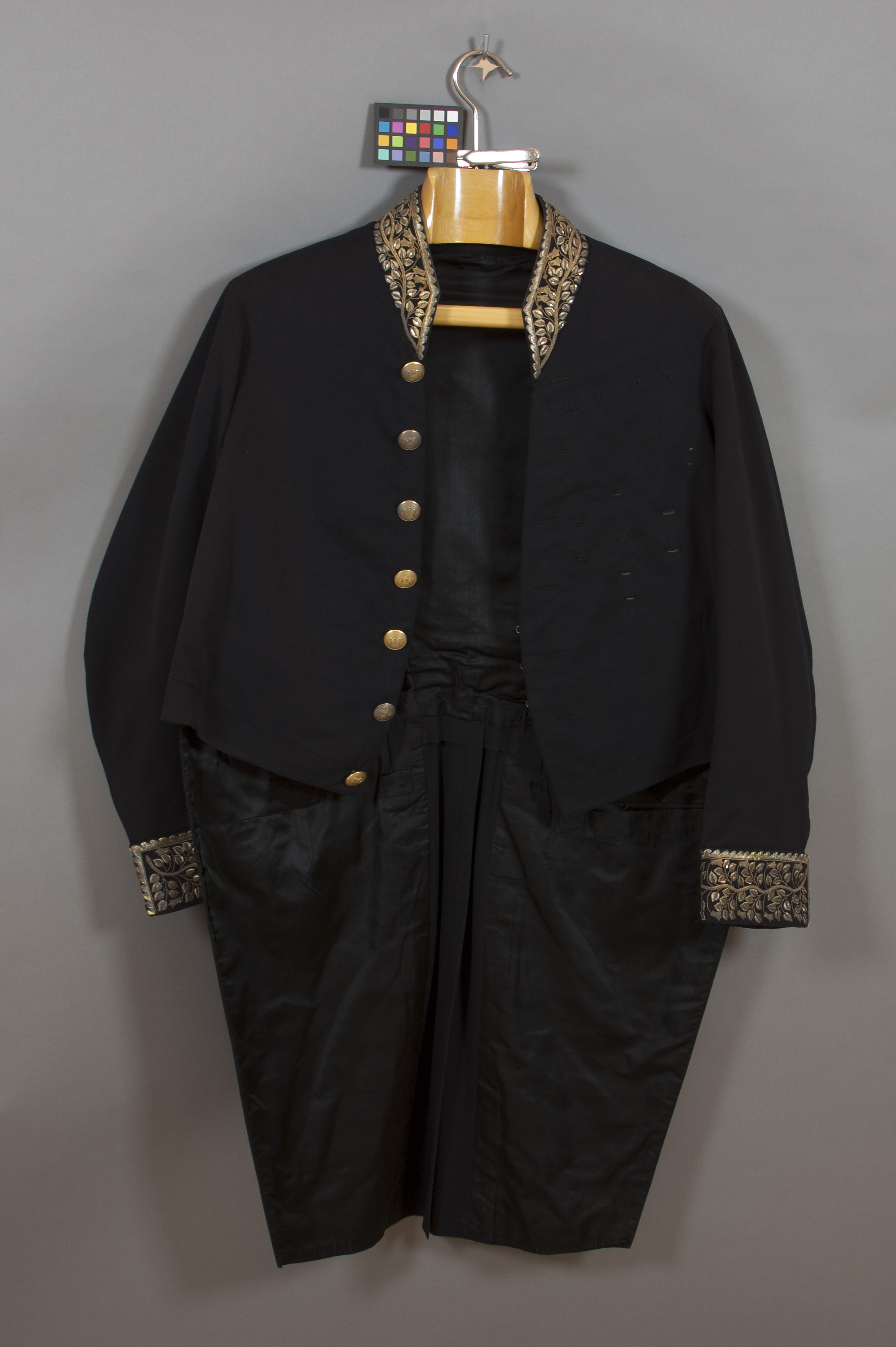 Frack av mörkblått kläde med ståndkrage med guldbroderi i form av blomranka, Linnea ?. Nedtill på ärmarna 70 mm breda uppslag med lika broderi som på kragen. På vänster framstycke tolv tränsar för bröstdekorationer. På höge sju förgyllda mässingsknappar d: 22 mm med kunglig krona, på insidan firmamärke: "C. SPORRONG STOCKHOLM". I ryggen två ficklock 225 mm breda med lika broderi som på kragen, vardera med tre "kronknappar". I livsömmen två knappar samt nedtill på skörtens insida. Foder av svart atlas, framstyckena ofodrade och matelasserade. Ärmfoder av vit bomull.